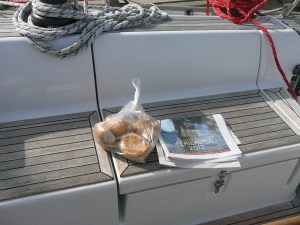 Zoals op de foto van Risör in Noorwegen te zien, kregen we de broodjes daar gratis als verrassing in de kuip toen we wakker werden. Leuke attentie!