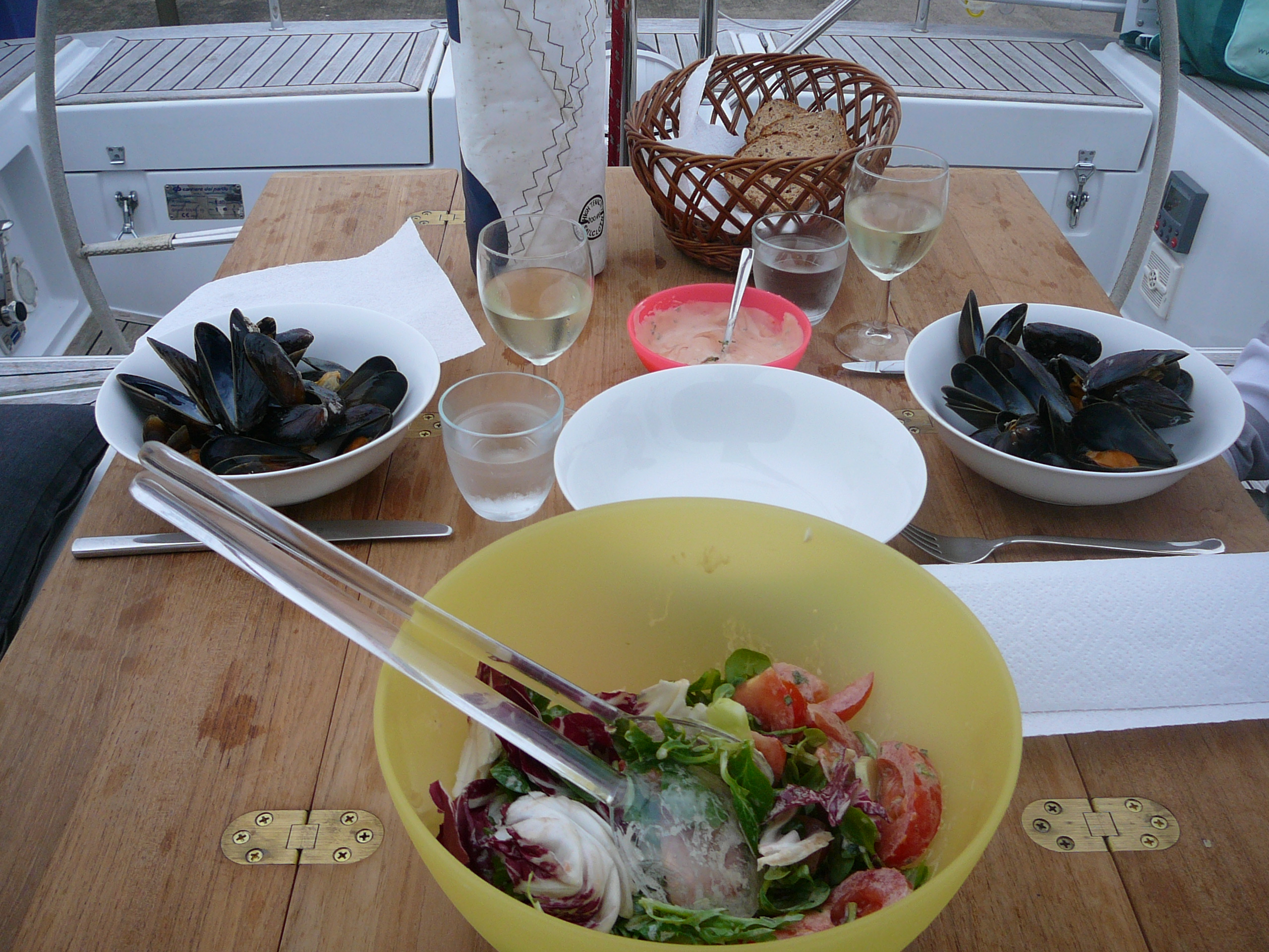 Gisteren de boot weer eens schoongemaakt van binnen en van buiten en de was gedaan. Om onszelf te belonen uit eten geweest in de Hamn Kroen, heerlijke schaaldieren en geroosterde heilbot met risotto.