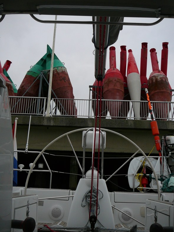 We liggen nu in Cuxhaven onder de kade waar de reserveboeien worden bewaard (zie foto). Vreemd gezicht vanuit je kuip!