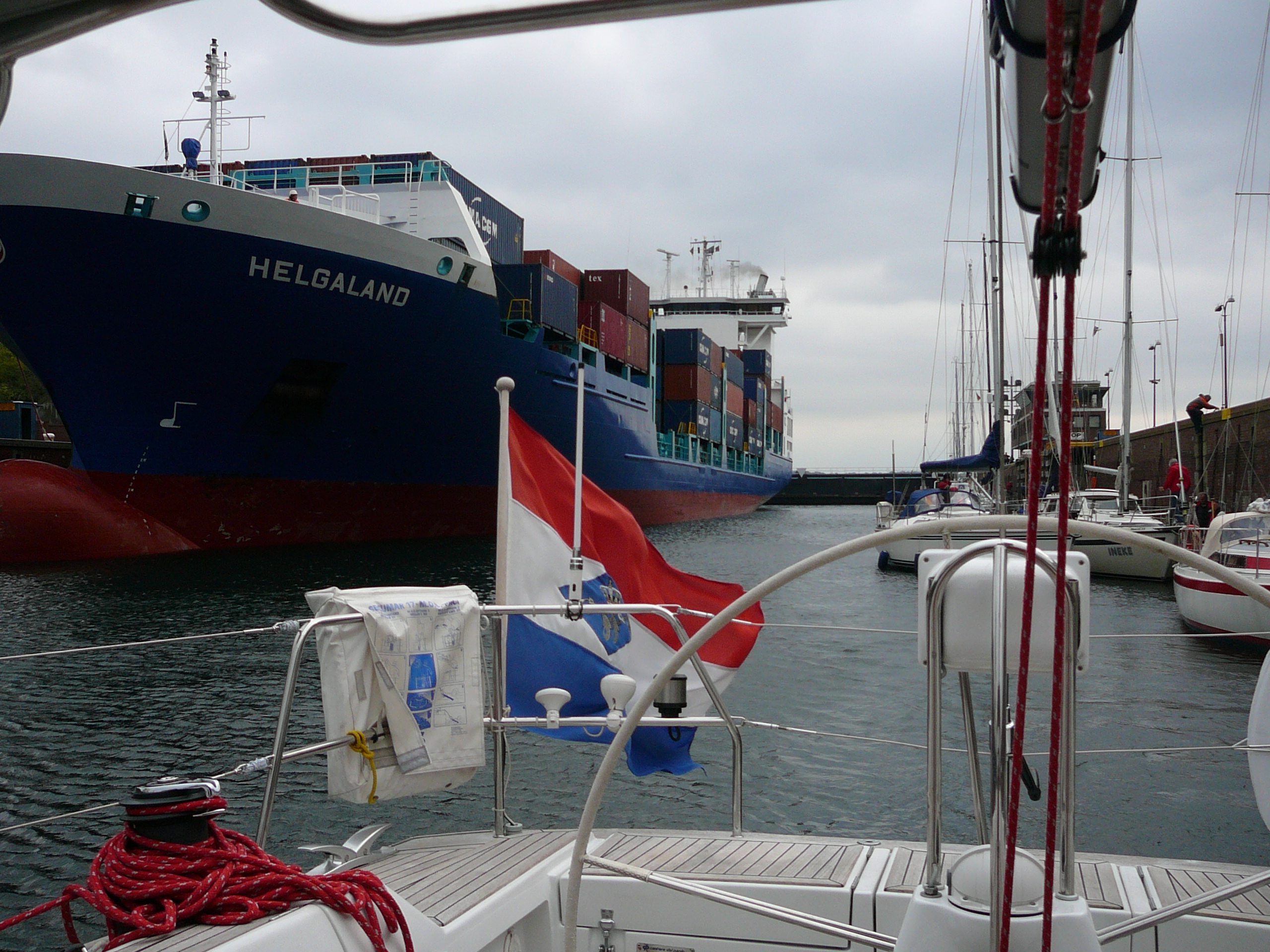 14 september: om half negen op weg naar de sluis in Holtenau. De oude sluizen (voor de jachten en kleinere schepen) zijn beide in restauratie dus we schutten met de grote scheepvaart mee. Het is alleen zo druk dat we 3 uur liggen te wachten voor er genoeg plek is naast 3 grote vrachtschepen voor de 12 “sportboote”. Lekker liggen wachten met wind van 20-25 knopen dwars op de sluisinvaart…