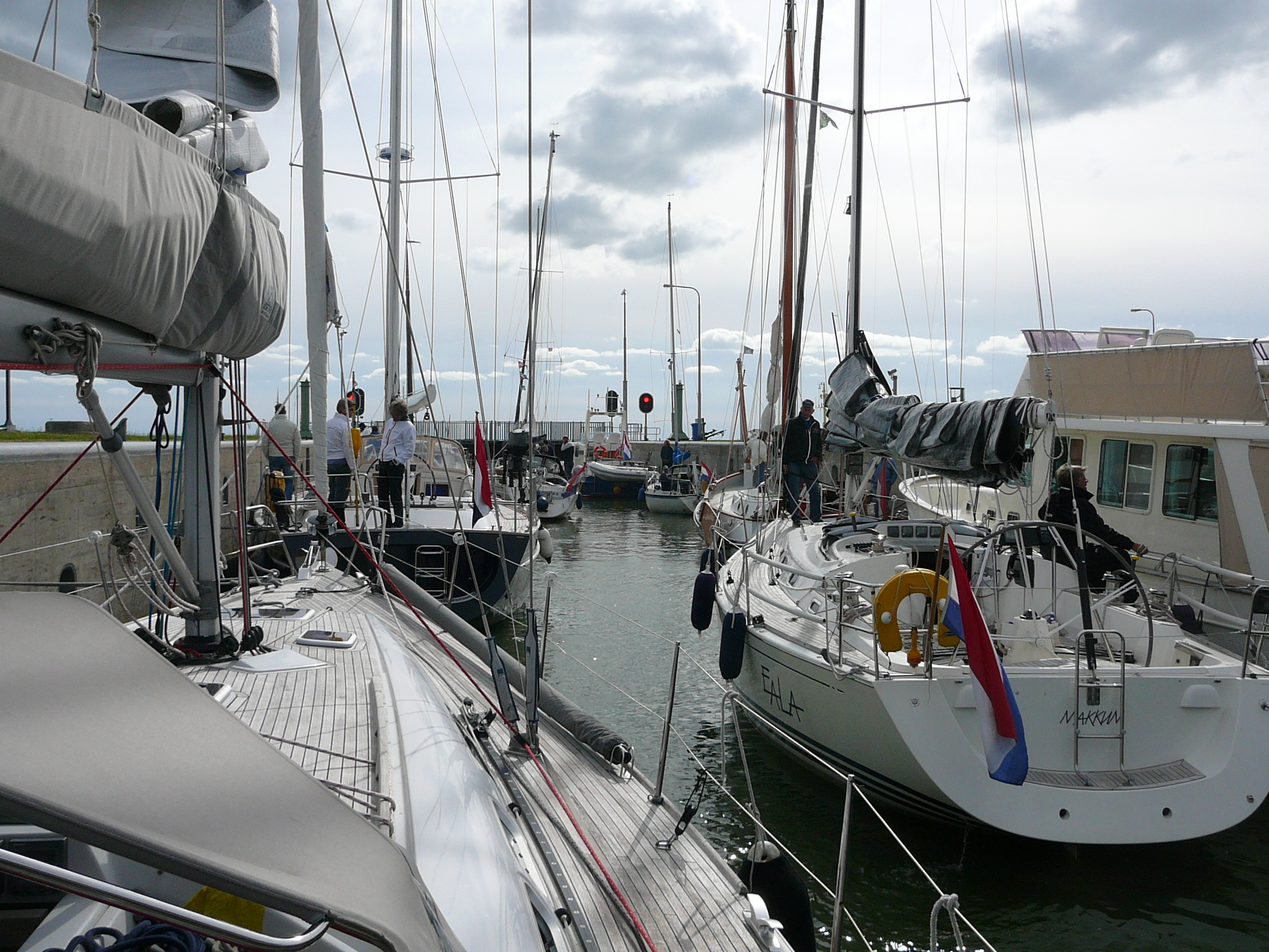 We lagen in het “Millionaires bassin” voor de grotere schepen. Wij natuurlijk de kleinste daar. Naast ons o.a. de Highland Fling, een Swan 60, de Germania, een Abeking&Rasmussen ketch en twee oude 12meters. Voor ons een mooie Duitse Burmeister Yawl uit 1968, die ook naar Nederland op weg is. Er kwam ook een Grand Soleil 50 in de box naast ons liggen. Mooi gezicht.