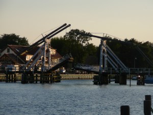 Om hier te komen voeren we 67 mijl, waarvan 2/3 motorzeilend vanwege de zwakke wind. We voeren de eerste 10 mijl door de Bodden tussen Rügen en het vasteland, een soort wadden zonder stroom waarin je wel heel precies de geultjes moet volgen. Daarna de “zee” op en langs het natuurgebied “der Darss”. Daar mag je niet te dicht langsvaren en er liggen 2 politieboten te kijken of je wel buiten de gele betonning blijft die daarvoor is uitgelegd. Er is ook een vluchthaven, Darsser Ort, die de enige beschutting kan geven bij harde westenwind op het hele stuk van 60 mijl. Maar deze slibt steeds dicht en vogel- en natuurliefhebbers weten steeds tegen te houden dat de haven wordt uitgebaggerd. De reddingboot kan er ook niet meer in of uit