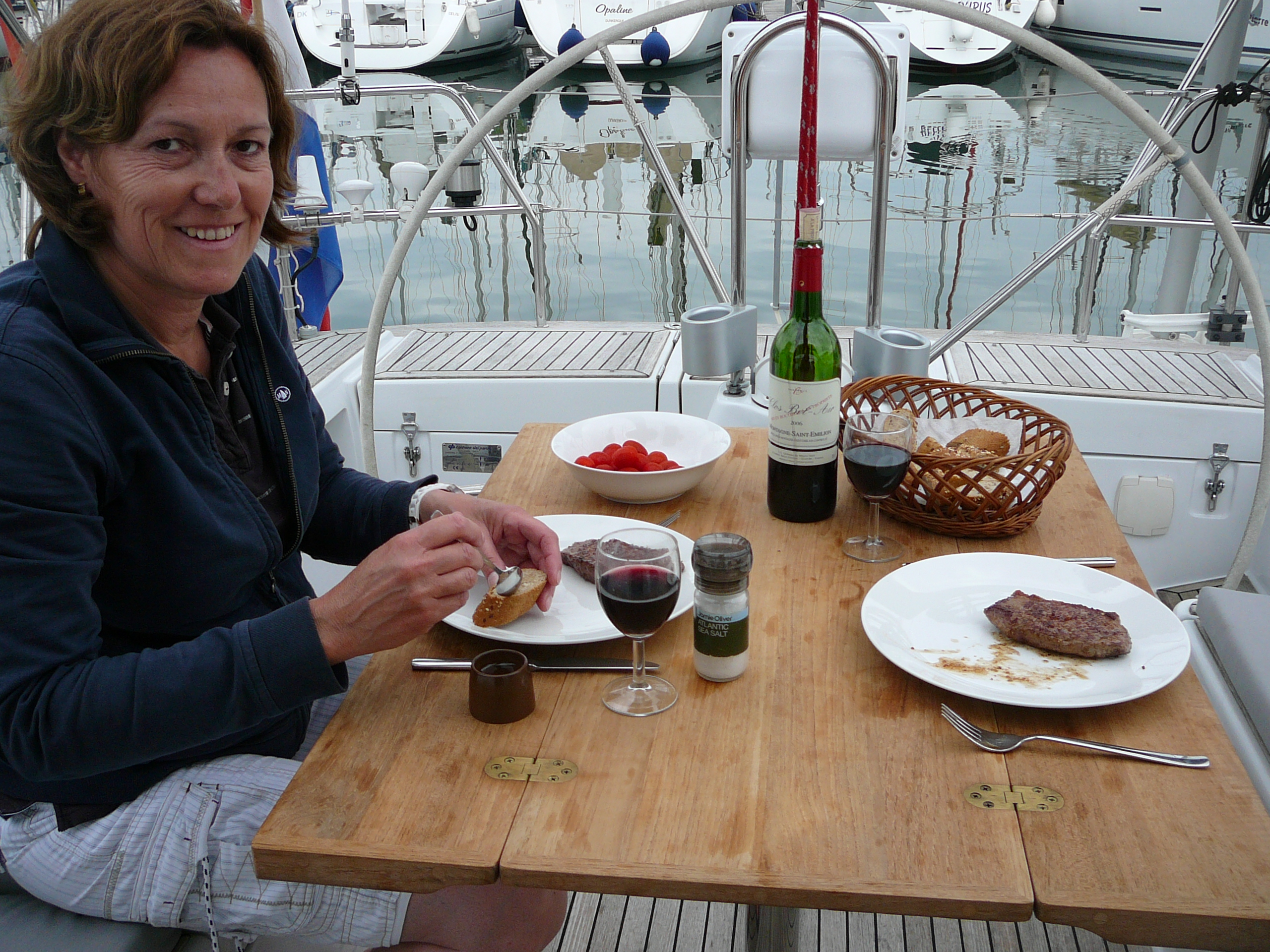 Eenmaal in de haven klaarde het weer helemaal op en kon de kapitein weer lachen. Buiten gegeten met een eenvoudige doch voedzame Franse maaltijd (steak met stokbrood en minitomaatjes met een Saint Emilion uit 2006 erbij.