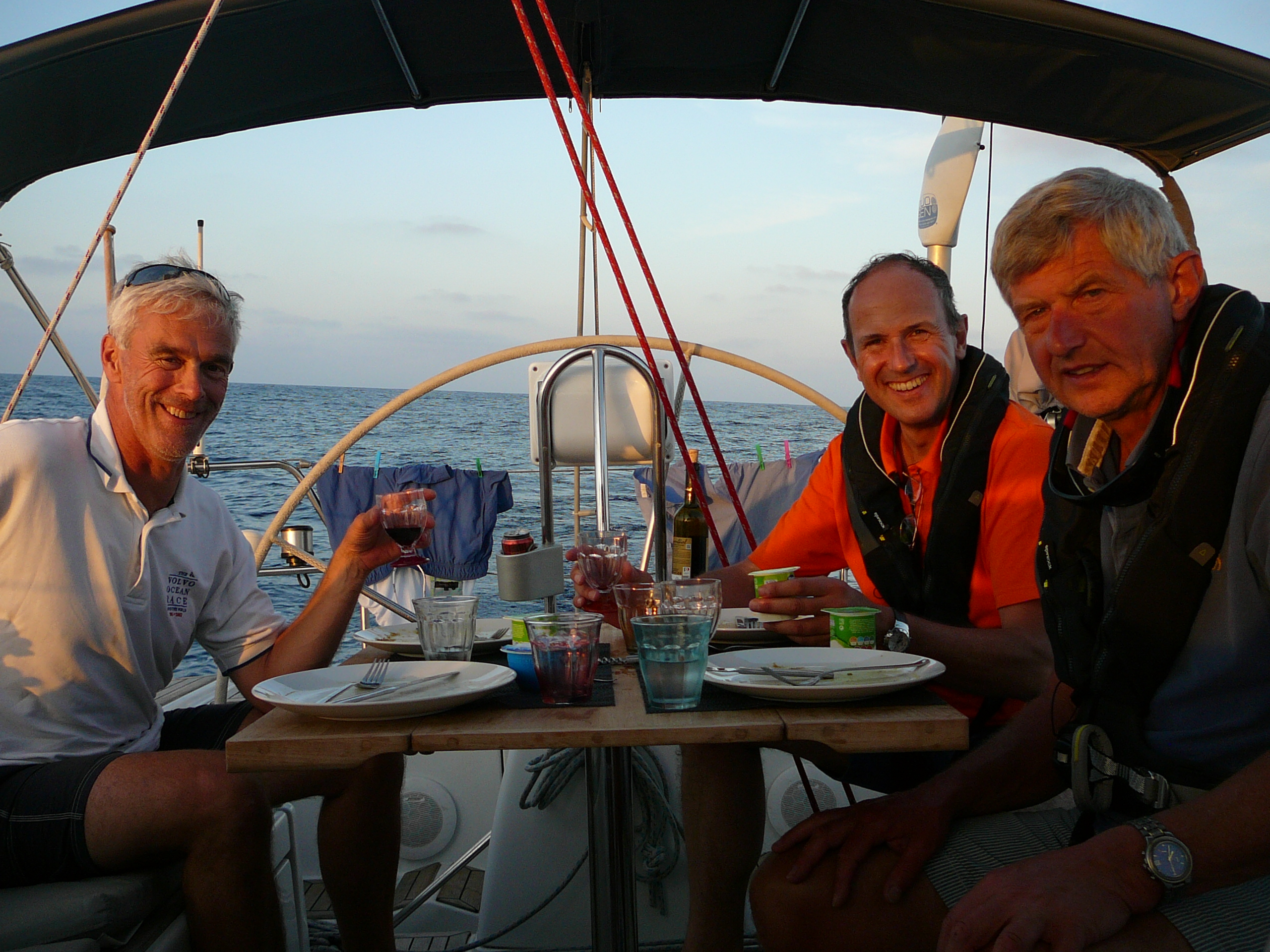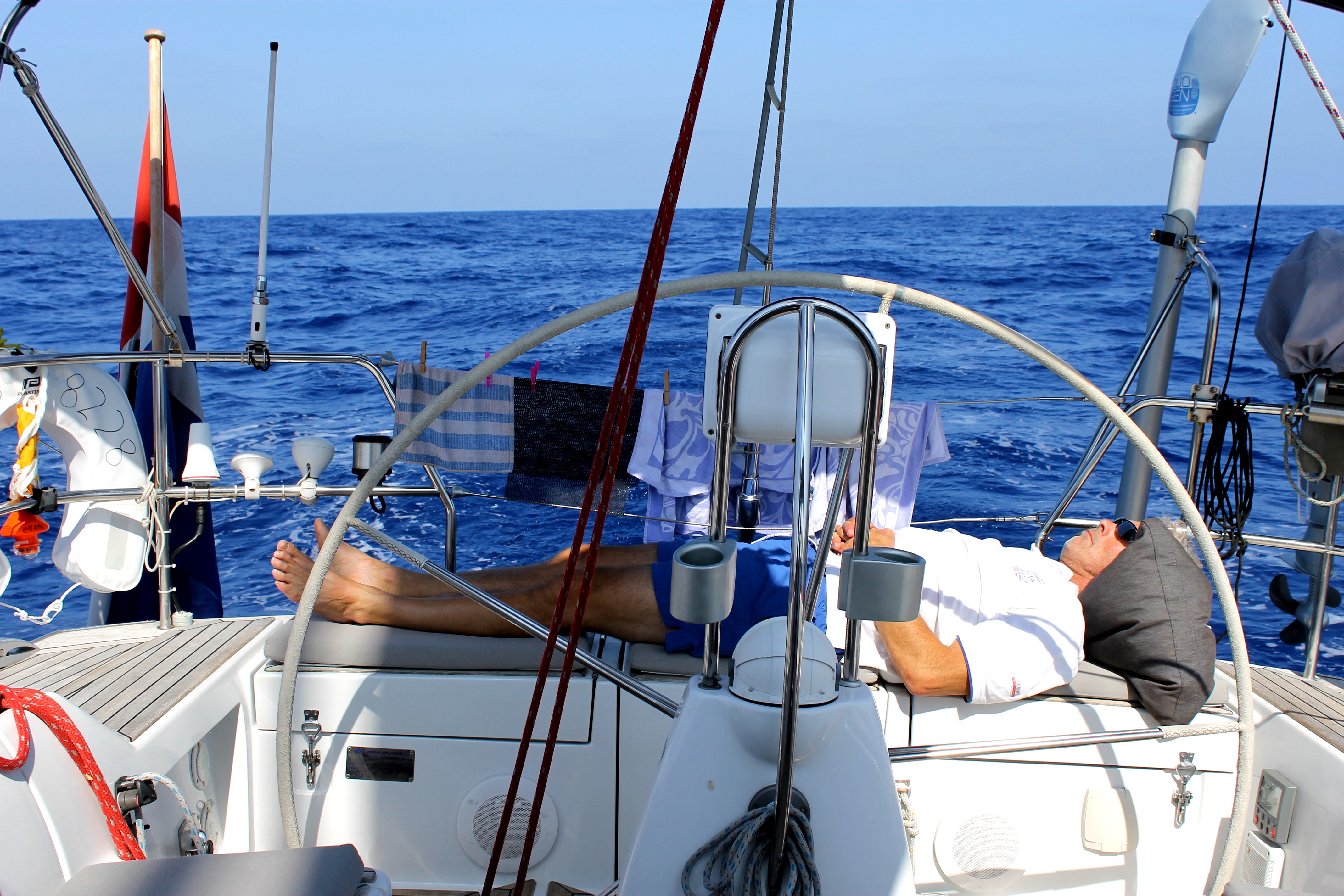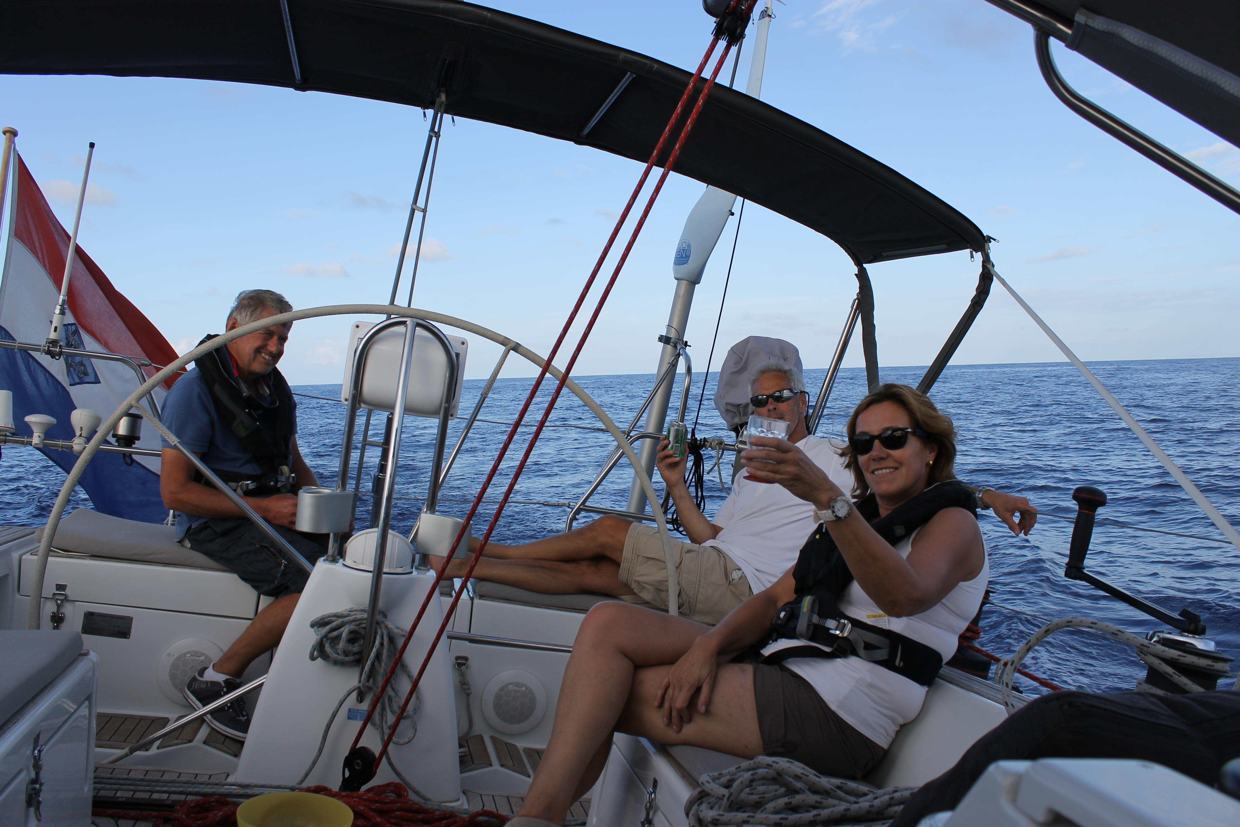 Op 19 september gaan we, na een laatste check van de tuigage. We vertrekken om 13:00 uur. Eerst weinig wind maar volgens de voorspelling neemt deze toe naar NO 4-5, later 6. Geheel volgens de voorspelling. We varen de eerste dag en nacht nog ruime wind, daarna wordt het pal voor de wind met een uitgeboomde genua 3. Later neemt de wind af en de tweede nacht varen we zonder reven tot in de ochtend de wind gewoon op is. De motor erbij en veel lezen en slapen dus. Voordeel: we kunnen midden op de oceaan dineren in de kuip want de zee is spiegelglad.