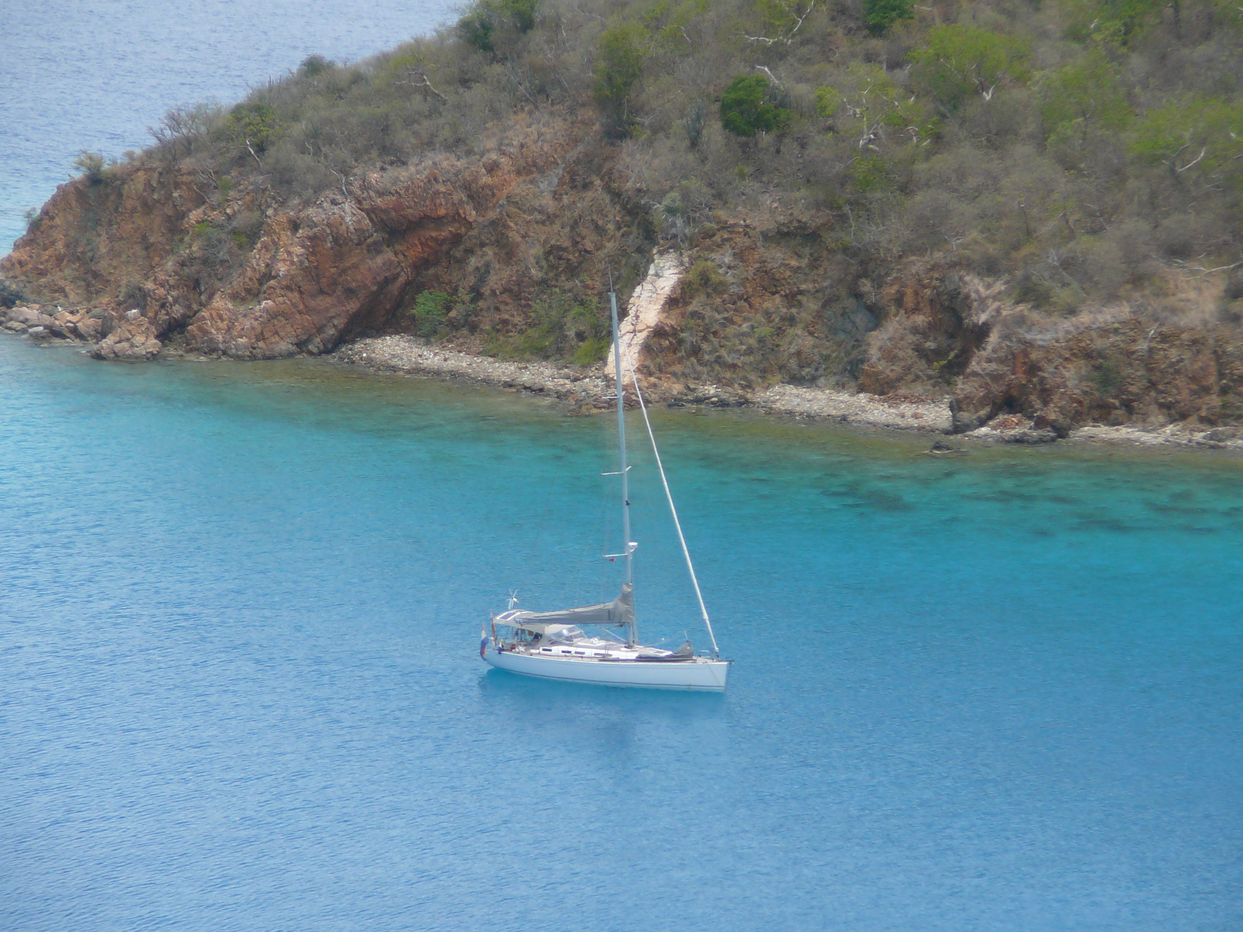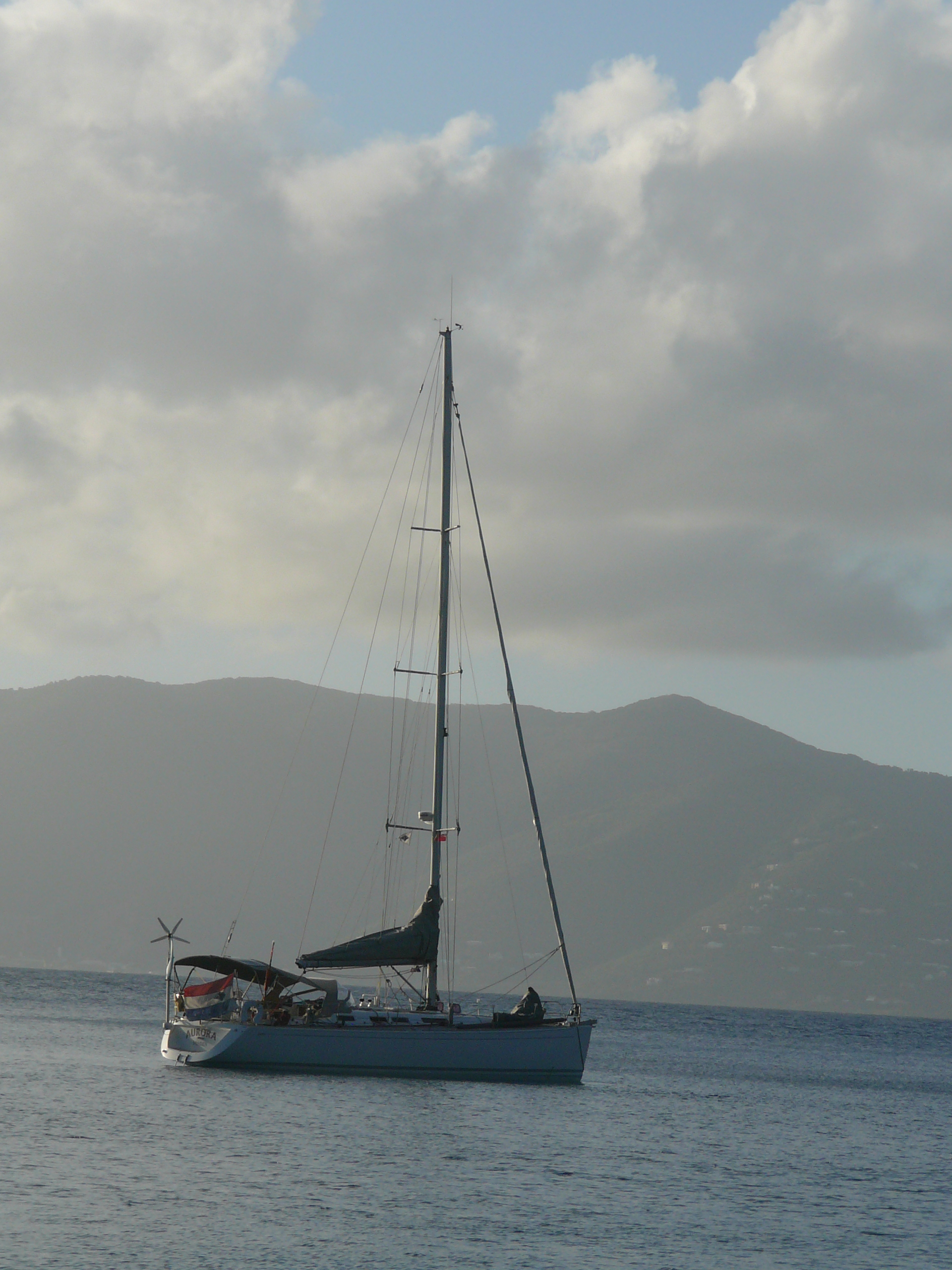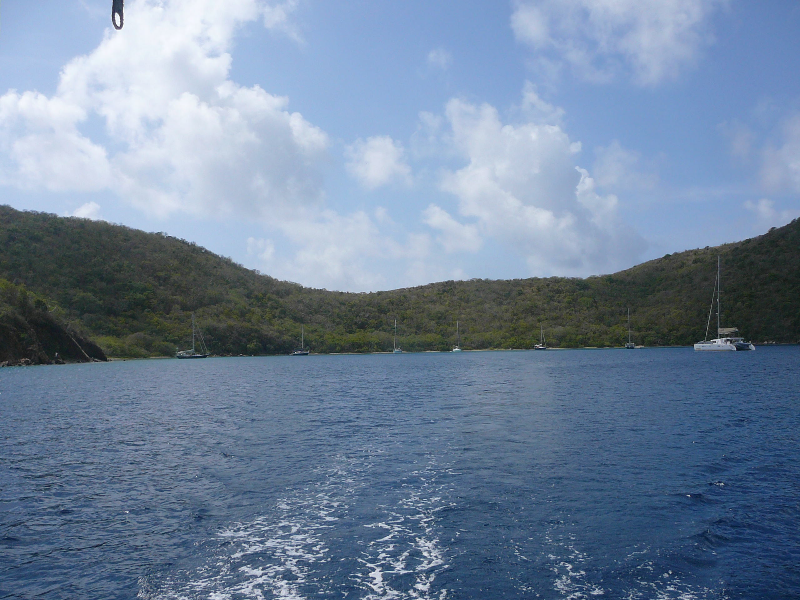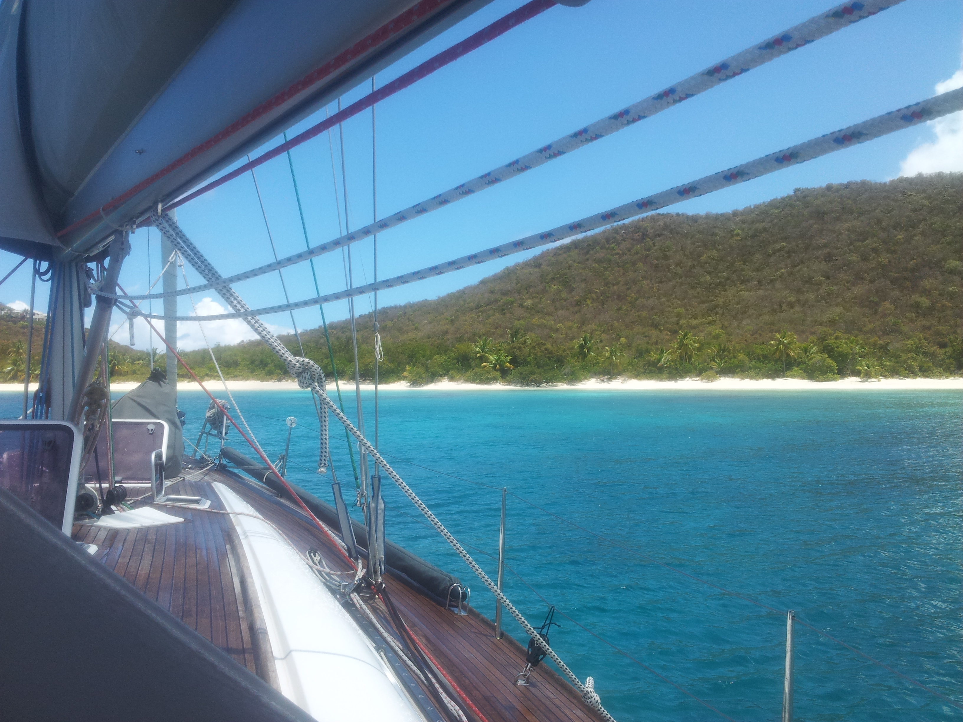 Toen het licht werd kwamen we in diep water en ging de genua erbij. We voeren de hele dag ruime wind naar Virgin Gorda waar we om 15:30 aankwamen. 82 mijl in 11 uur, prima met een conservatieve zeilvoering met zijn tweetjes.