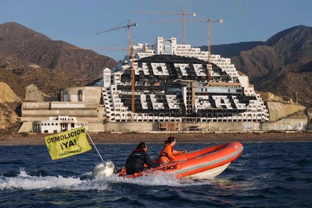Greenpeace vond het namelijk een schande dat dit kan gebeuren en dat zelfs de overheid, na al jaren geleden besloten te hebben het af te breken, nog steeds niets doet. Daarom heeft Greenpeace er in een actie met grote letters “HOTEL ILEGAL” op geschilderd.