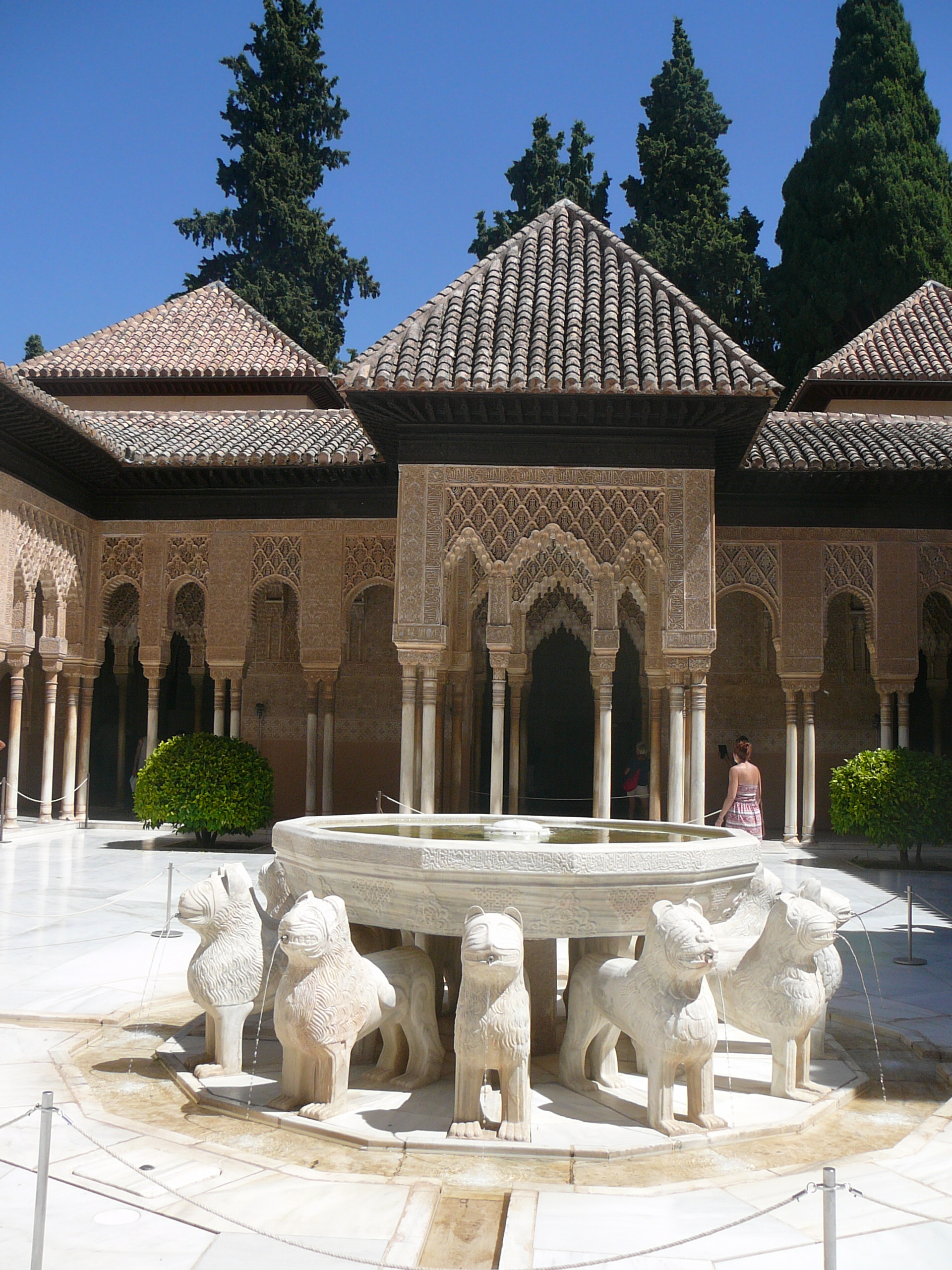 Daarna naar het Alhambra, waar we de hele middag doorbrengen. Eerst de Nasrid Paleizen van de eerste Moorse koningen die in Spanje de macht overnamen vanaf de 12e eeuw. Geweldig en bijzonder bewaard en gerestaureerd. Je moet je melden op een tevoren op je ticket aangegeven tijdstip, anders kom je dit deel van het Alhambra niet in.