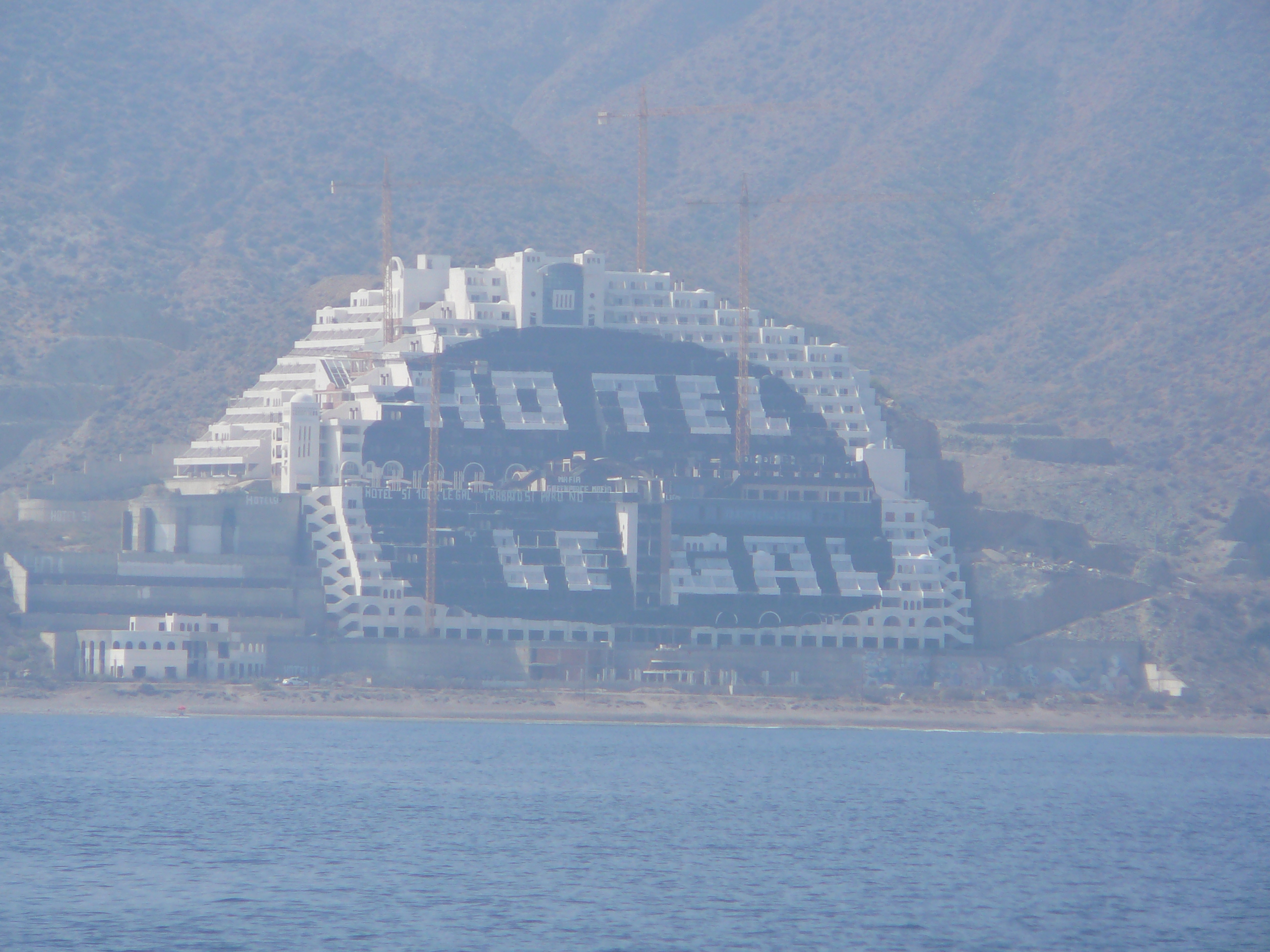 Onderweg varen we langs een mooi natuurgebied met vulkanisch gebergte tot aan de stranden dat behoort bij de Cabo de la Gata. Middenin staat een verlaten kolos van een hotel waarop met grote letter “HOTEL LEGAL” is geschilderd.