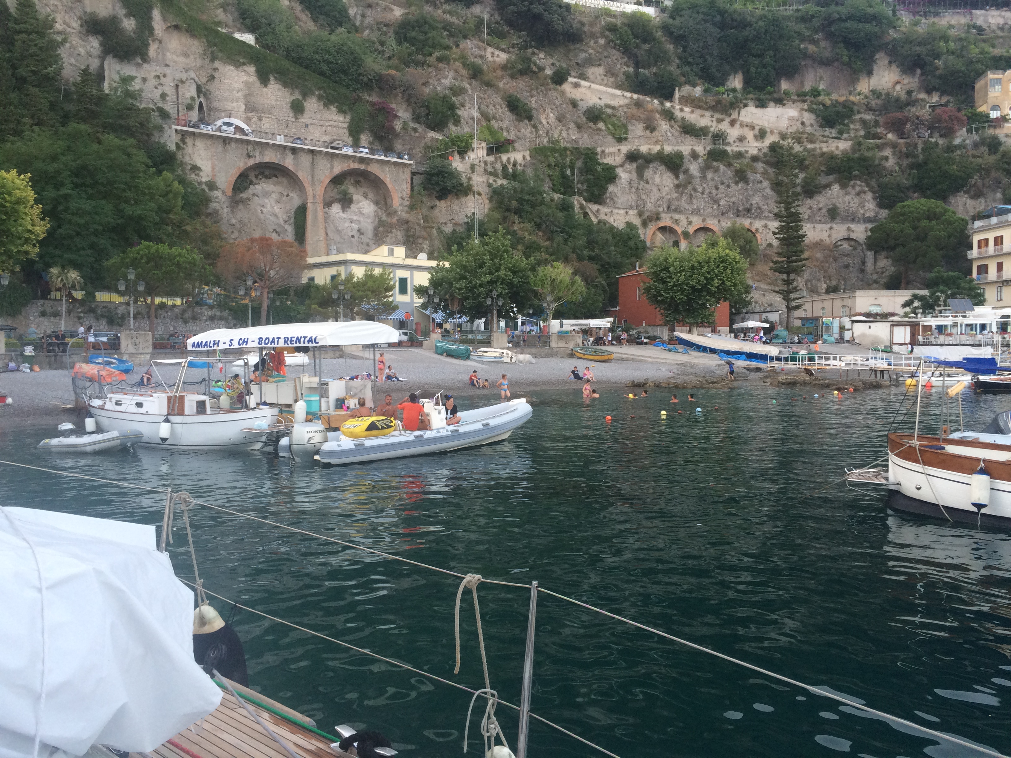 Dan naar Amalfi, waar we op 10 meter van het stadsstrand aan een steiger komen te liggen. We mogen zelf niet aanleggen maar de havenmeester stapt aan boord en neemt gewoon het roer over. Hij weet duidelijk wat hij doet!