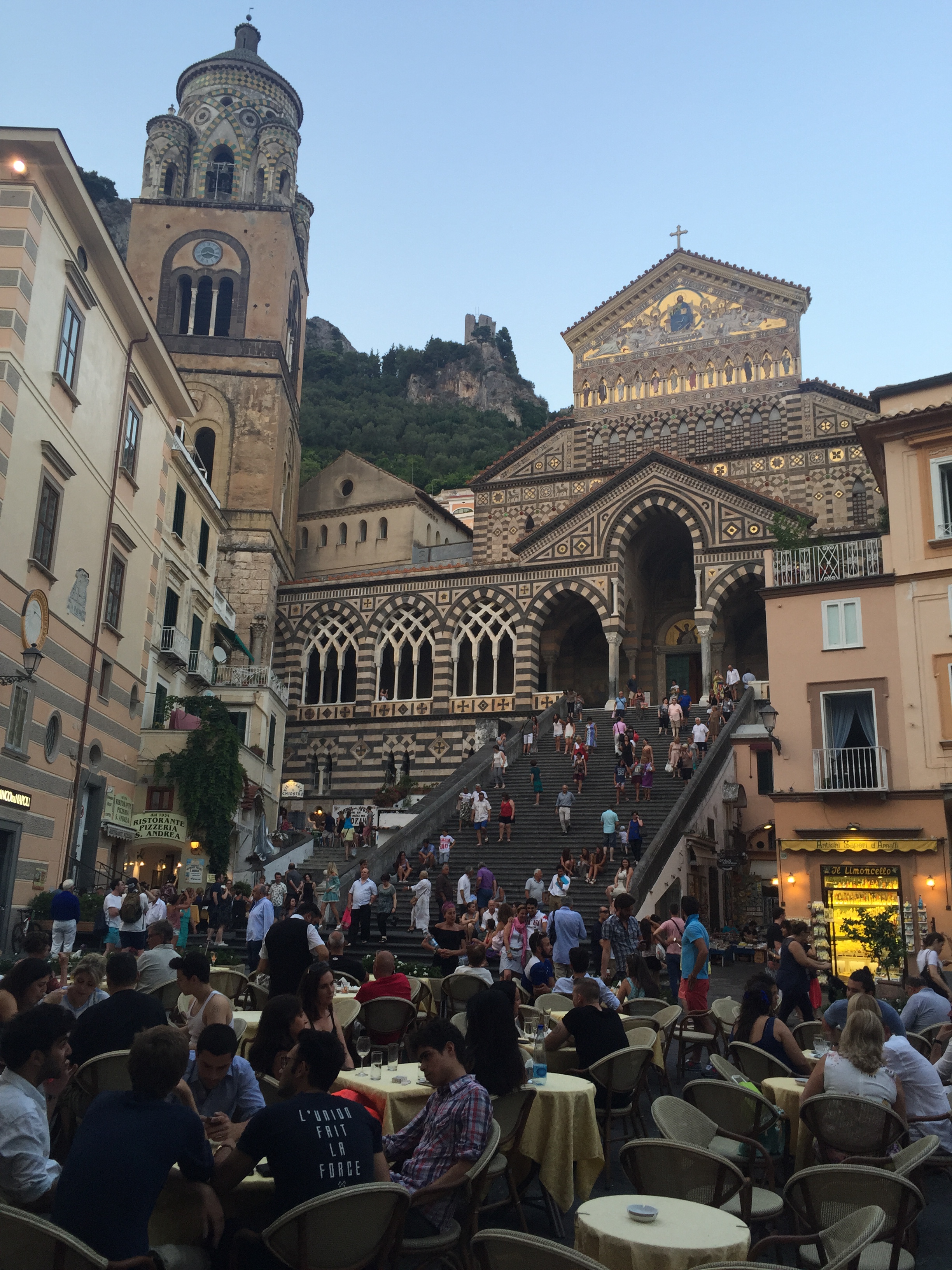Amalfi is echt op en top Italiaans! We bekijken de mooie kerk, drinken wat op een terrasje en besluiten pizza te eten met een lokaal rood wijntje op het plein. Heerlijk!