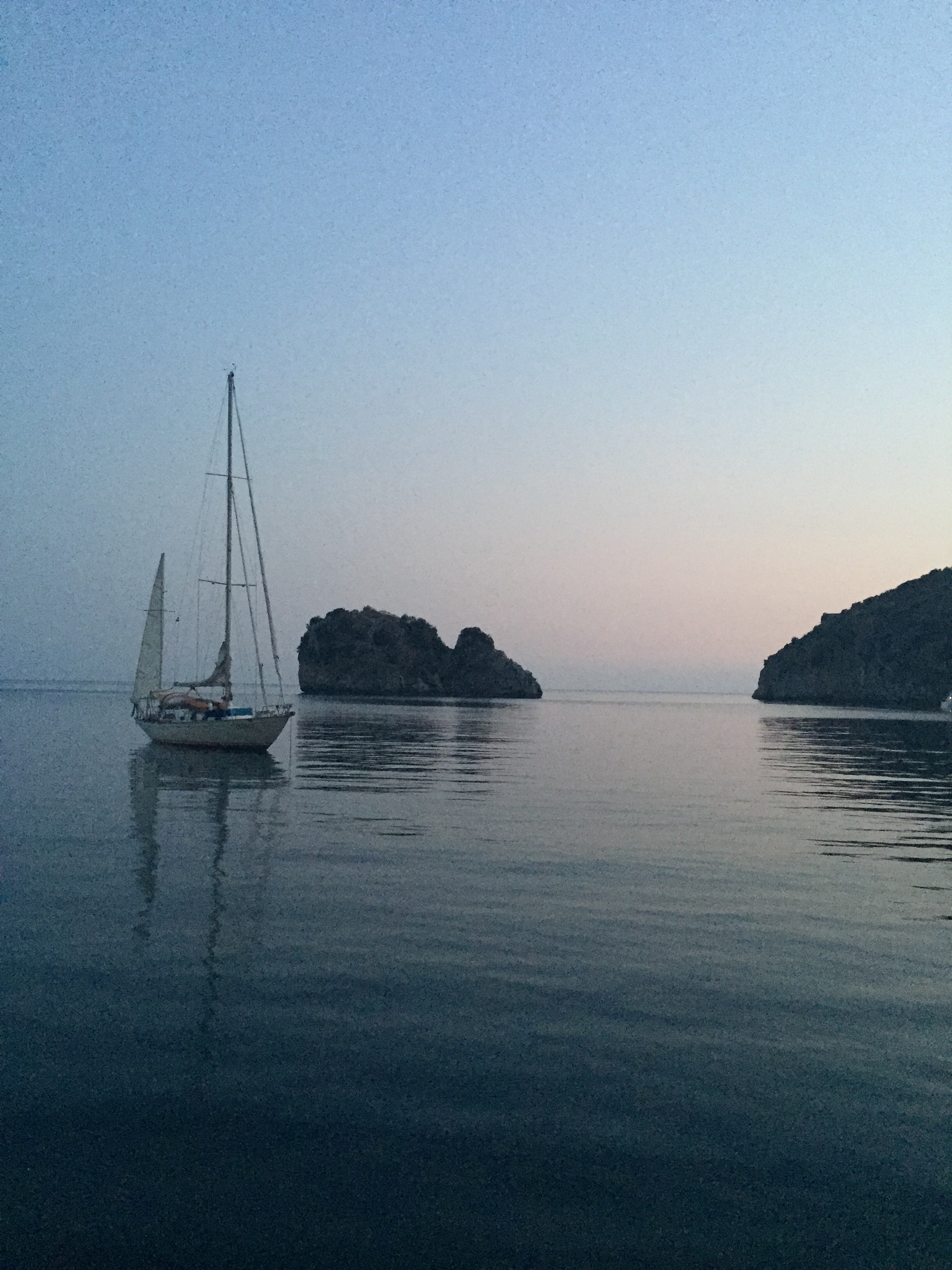 De baai van Porto Garibaldi ligt prachtig en je ankert tussen de rotsen in doodstil maar kristalhelder water op een mooie zandgrond. Je ziet je anker liggen op 8 meter diepte. Volle maan maakt de sfeer compleet in de avond. We bleven er 2 nachten en genoten. Ook nog even al het chroom gepoetst in de koele ochtenduren.