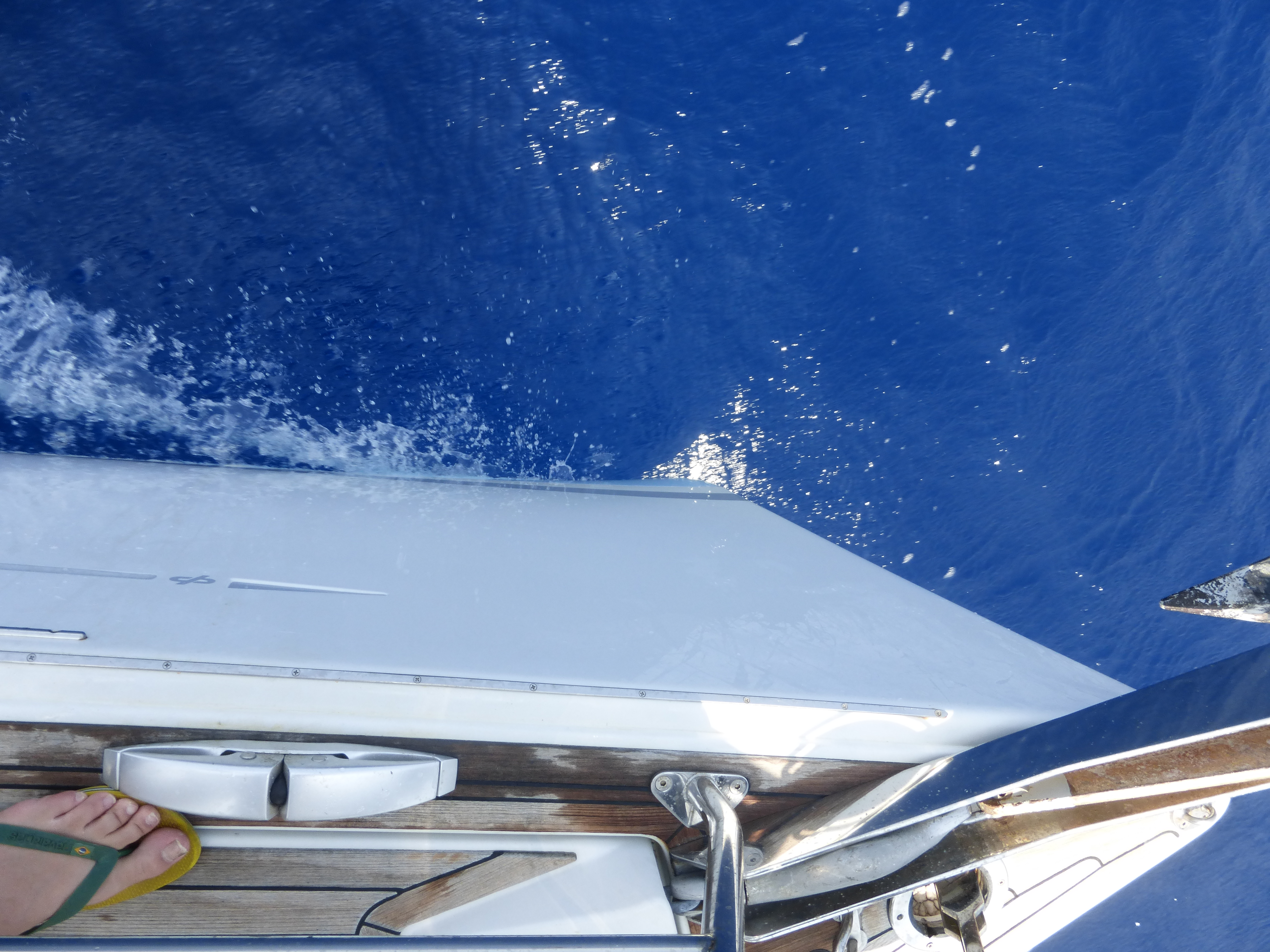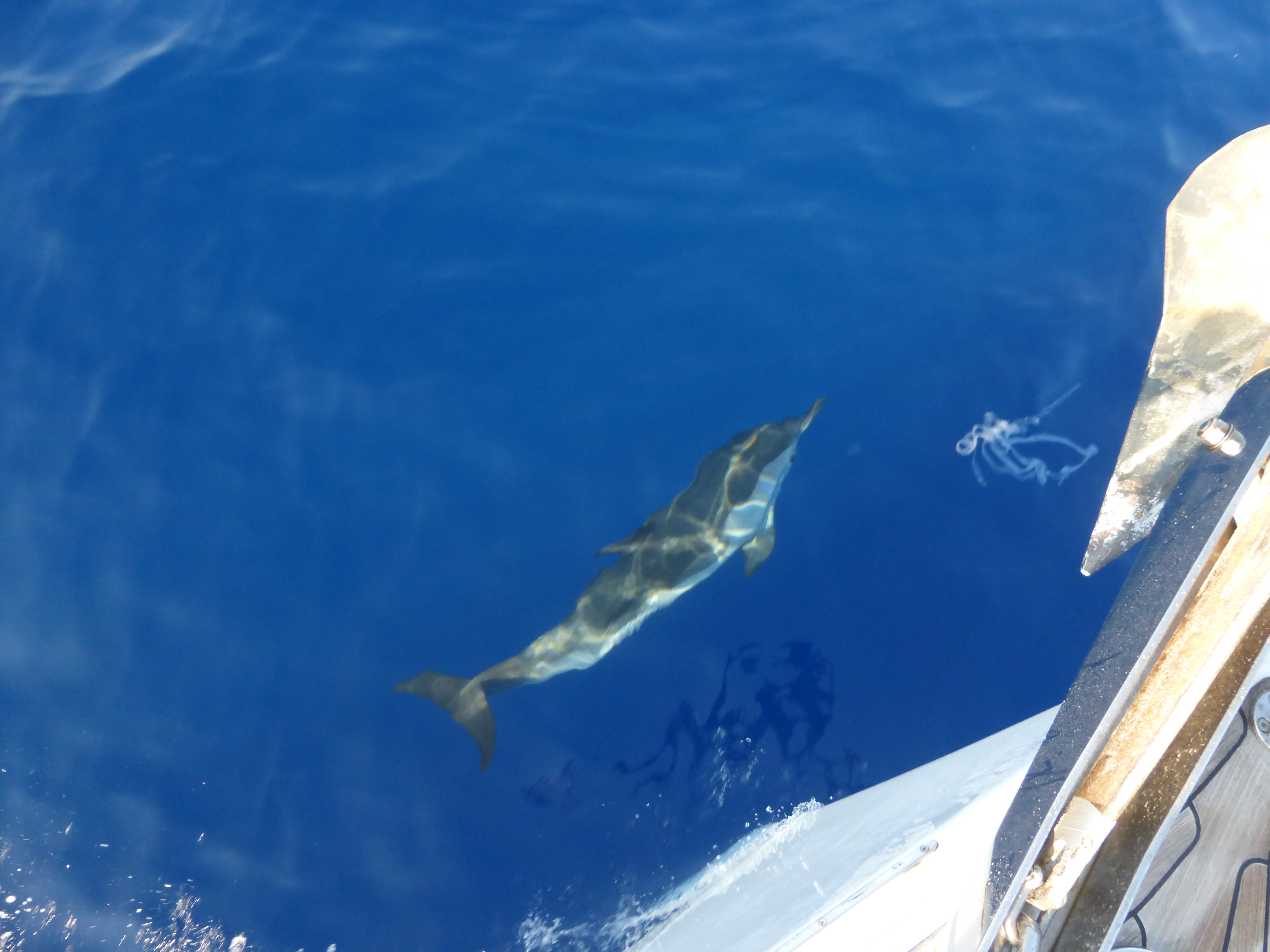 We vertrekken om 09:15 onder een bewolkte lucht maar wel met een noordenwindje. We zeilen tot 17:00 uur en de hemel wordt weer helemaal helder. We worden meerdere keren bezocht door groepjes dolfijnen. Aan het eind van de middag worden we nog opgeschrikt door het laatste wat je midden op zee verwacht. Op een paar honderd meter achter de boot, op maar ongeveer honderd meter hoogte passeert een privéjet op volle snelheid. Binnen een paar seconden is hij weer uit het zicht verdwenen, we kijken hem verbaasd na. We proberen te vissen, maar nadat een mooie bonito (kleine tonijn) helaas de haak weet los te krijgen voordat hij aan boord tot sushi verwerkt kon worden vangen we niets meer.