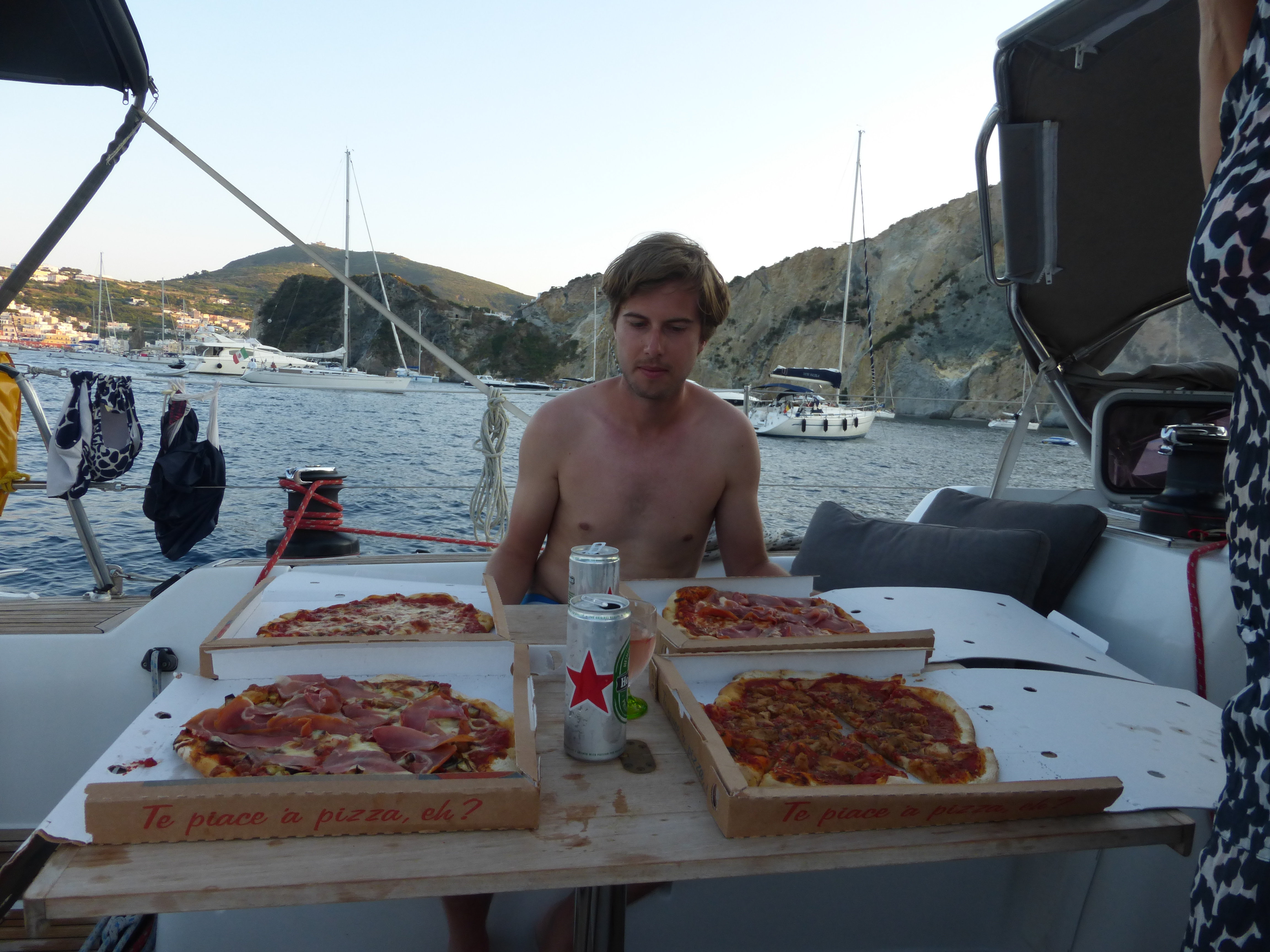 Om 17:00 uur valt de wind helemaal weg en we varen dus op de motor de nacht in. Wind komt er niet meer ’s nachts, evenals wolken of maan: een prachtige sterrenhemel dus! Ook ’s nachts blijven de dolfijnen langskomen, samen met een mooie sterrenhemel met zichtbare melkweg en een aantal vallende sterren is zo’n nachtje doorvaren zeker geen straf. Het is in totaal 156 mijl tot Ponza, een eiland voor de golf van Napels. We ankeren om 11 uur in de ochtend als derde boot in de baai buiten het stadje en rollen alle kanten op door continue passerende veer- vissersbootjes. Lang kunnen we niet genieten van de ruimte die er verder in de baai is: de hele middag en avond komen er binnen no time na elkaar andere boten aan. In de avond liggen er meer dan honderd boten (schatting) om ons heen en is de zee gelukkig rustig geworden. We halen pizza’s in het dorp (15 minuten varen met de “annexe”). Heerlijk vers voor je neus klaargemaakt. We maken een boerennacht.