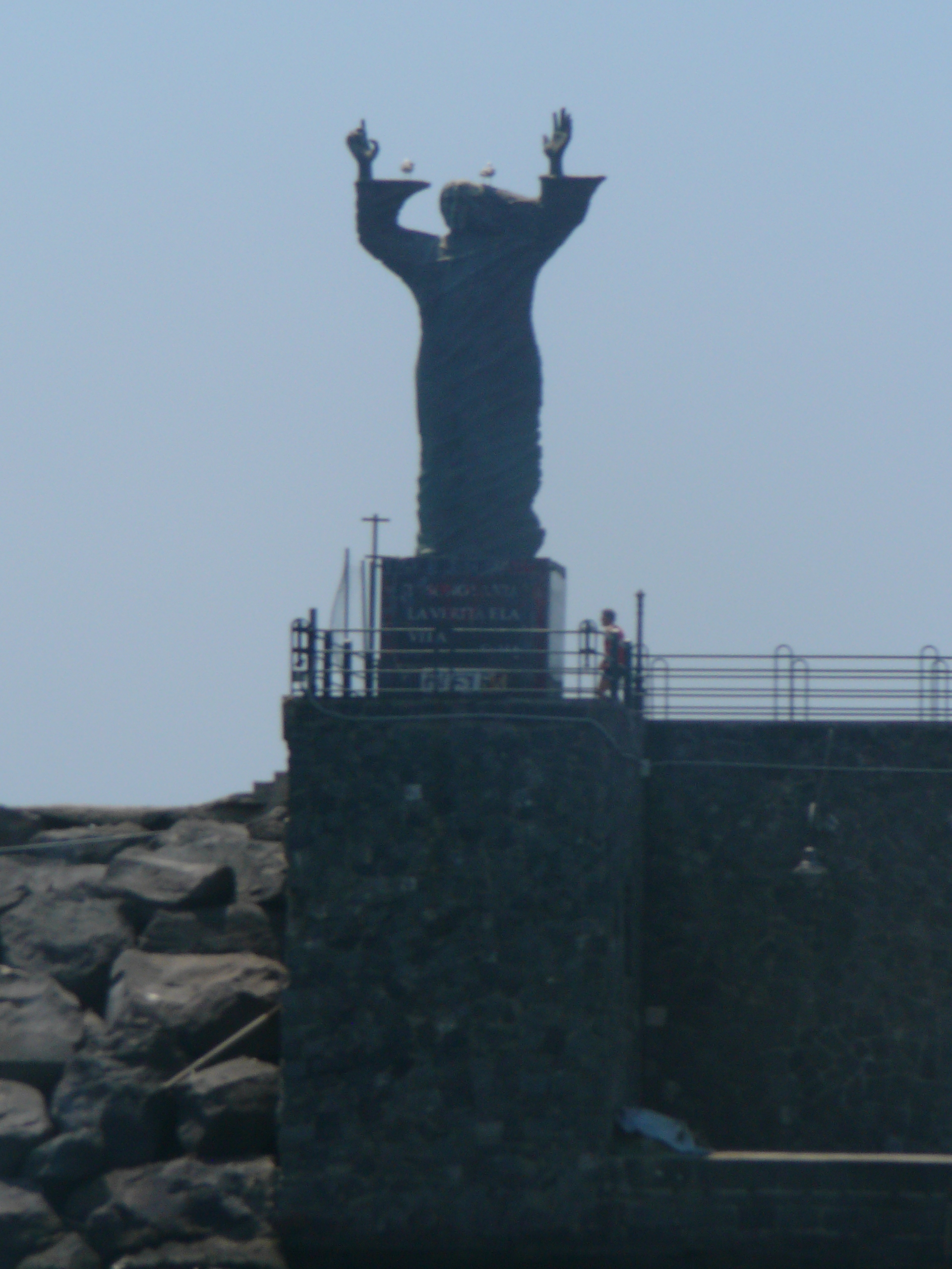 Bij het havenhoofd staat een groot beeld, misschien van een Griekse grootheid? We lopen er heen maar het blijkt een Christusbeeld met bovenstaande welbekende spreuk gegraveerd in de sokkel. Niemand weet wat de Griek hier vroeger deed….