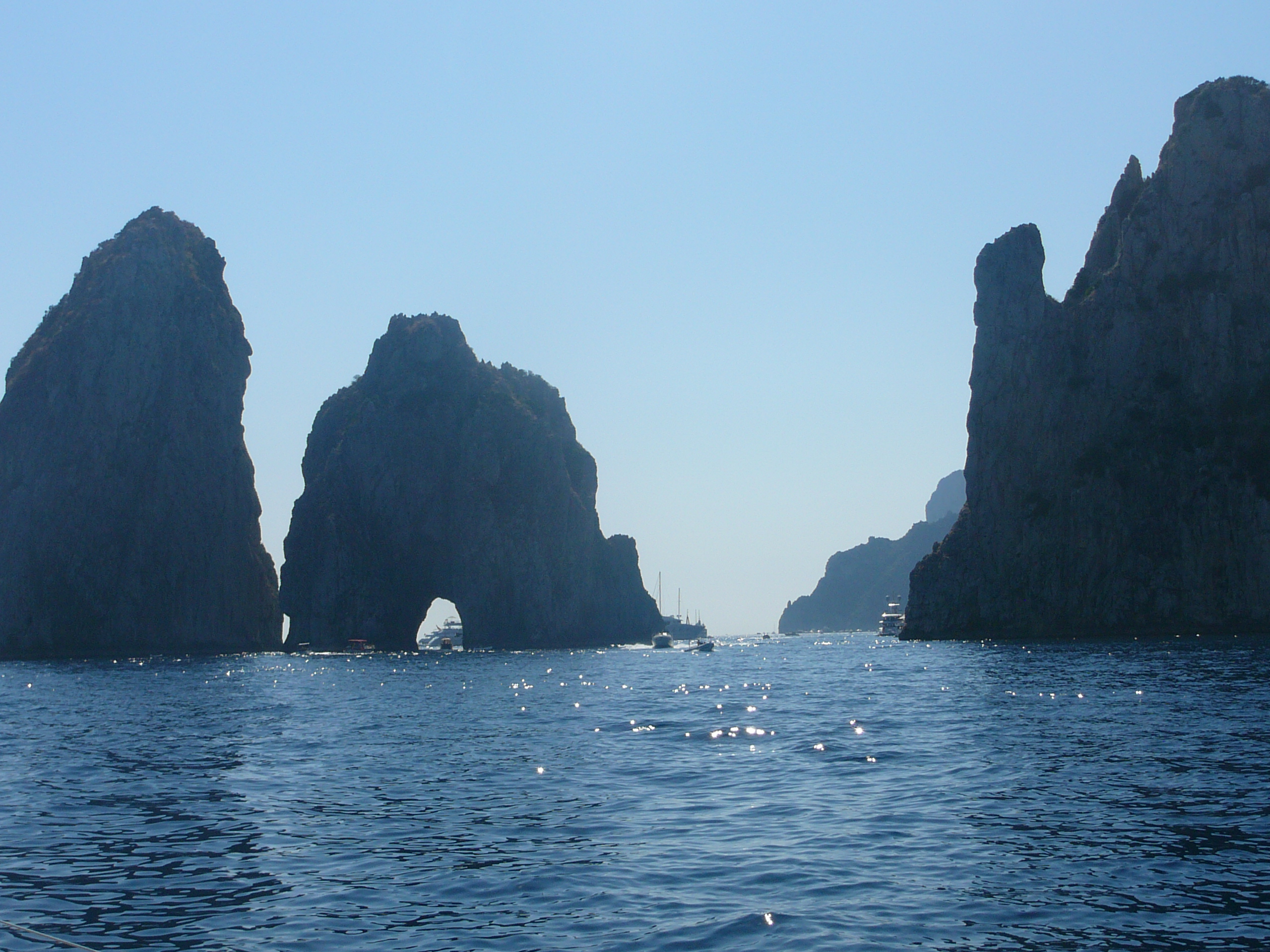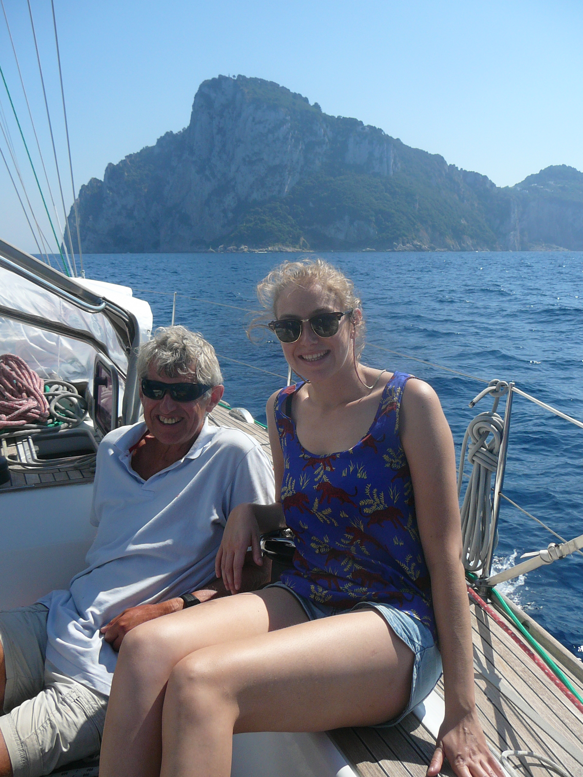 Met Frédérique en Jeroen varen we de golf van Napels over, langs Capri met de beroemde bogen waar motorboten onderdoor kunnen varen, maar wij niet. We zwemmen wel even bij deze mooie plek.