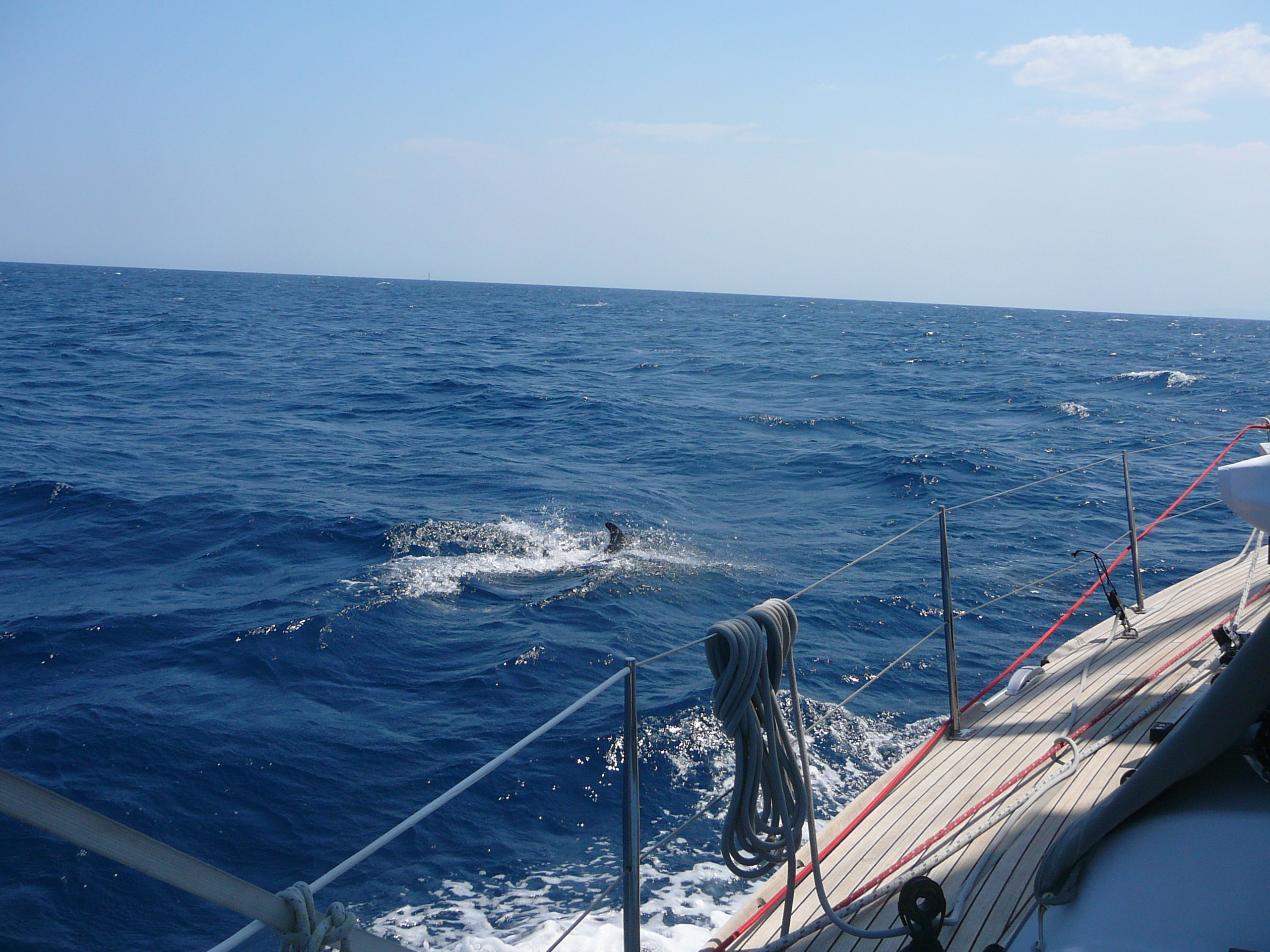 Frédérique en Jeroen zijn weer vertrokken en we zeilen met ons tweetjes een stukje door de straat van Messina. Eindelijk weer eens echte wind! We zien de grootste dolfijnen ooit langs onze boot springen!