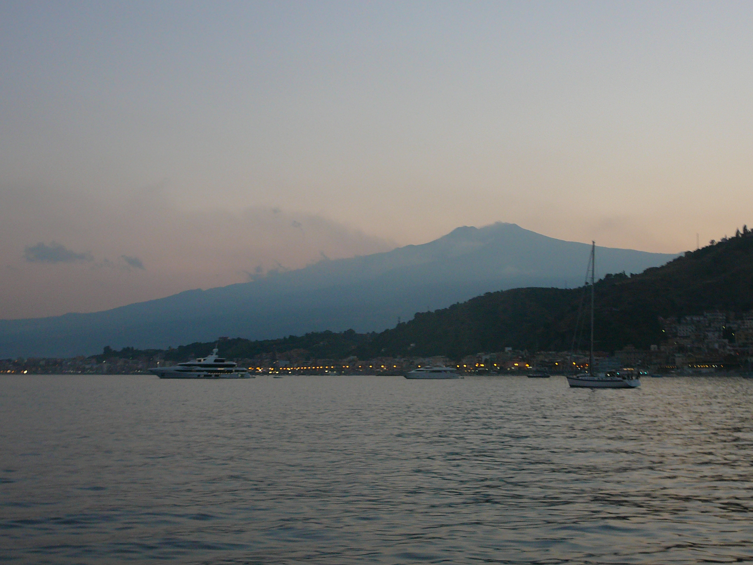 We pakken een mooring van George op in de baai onder Taormina, waar we eergisteren al waren… Nu het uitzicht op de Etna vanuit onze eigen kuip dus. Lekker zwemmen.