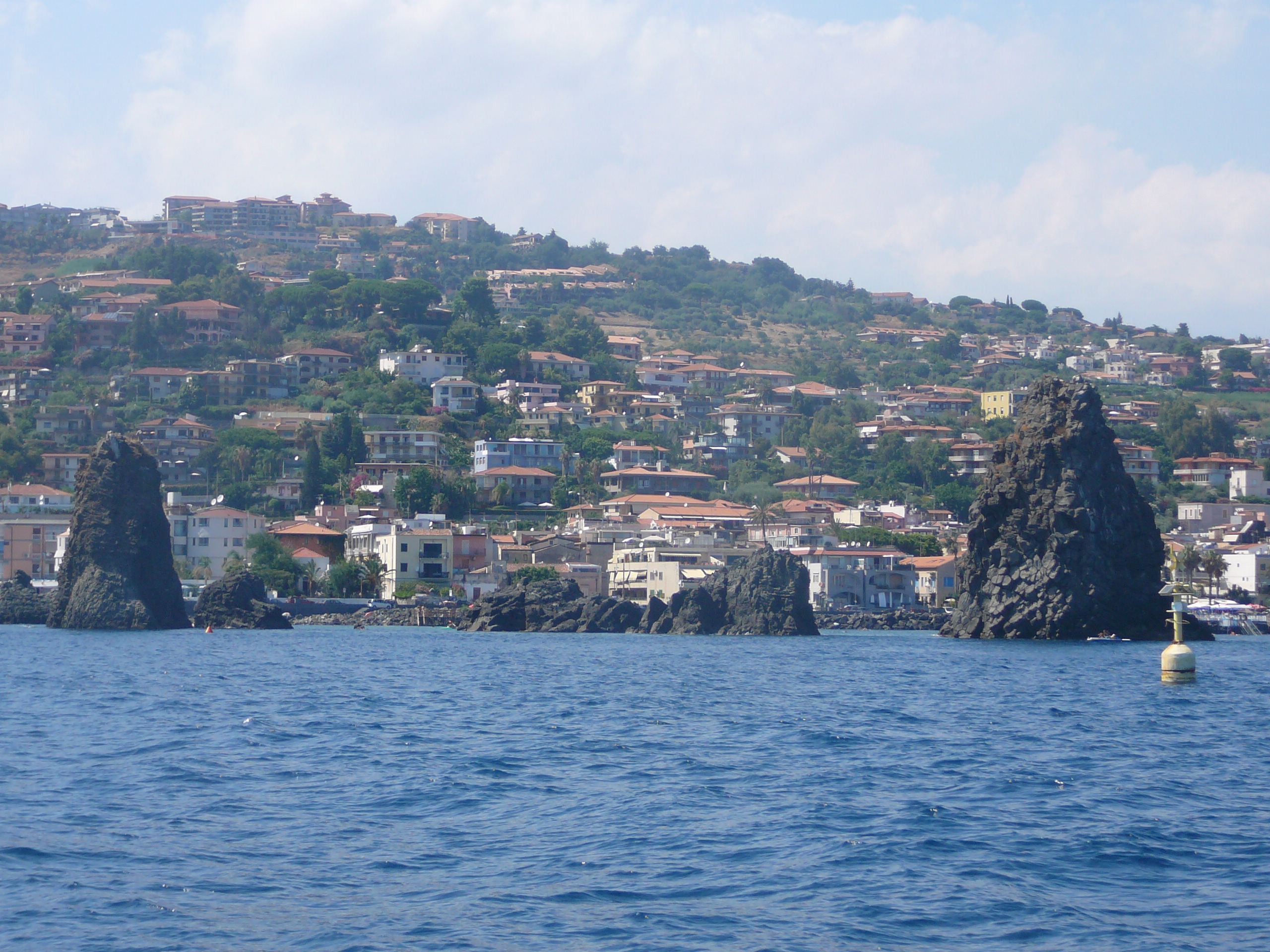 We varen van Taormina verder naar het zuiden en willen ankeren tussen de Cyclopen en de kust bij het dorpje Arcitreza. De cyclopen zijn 3 rotsen die hier voor Odysseus’ boeg in het water werden gesmeten om hem de pas af te snijden wat natuurlijk niet lukte. Ze liggen er nu vredig bij en vormen een natuurgebied waar, ondanks een ankerverbod, allerlei kleine Italiaanse bootje liggen en druk gezwommen wordt. Voor ons is de ankerplek en het haventje te klein, vinden we. We varen achteruit weer naar buiten.
