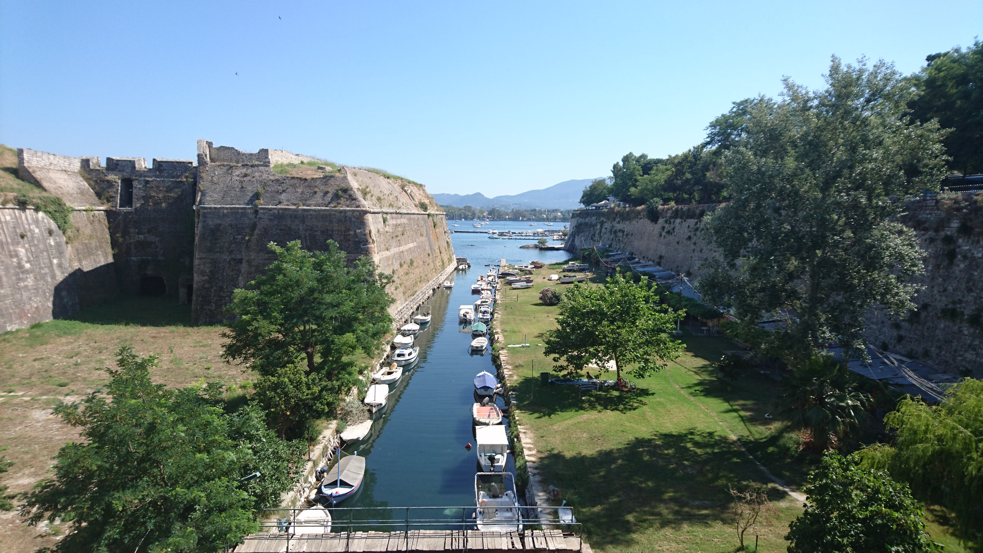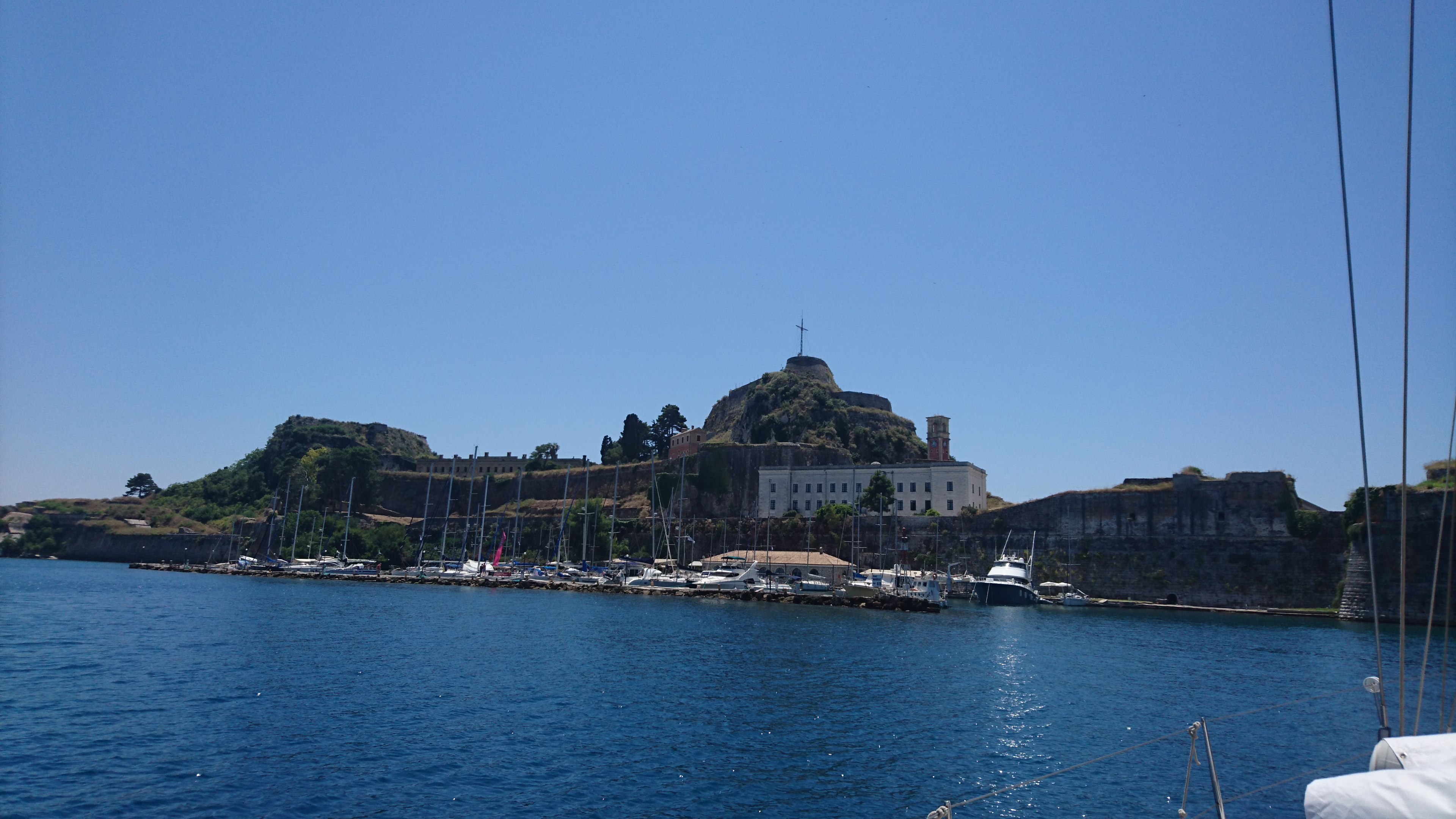 3 juli: we tuffen 3 mijl verder naar de haven van de plaatselijke afdeling van de offshore racing club van Griekenland, die onderdak heeft gevonden bij de Corfu Sailing Club. Direct onder het oude fort op het schiereiland, een klein haventje met eigen bar en een mooi strandje ernaast.