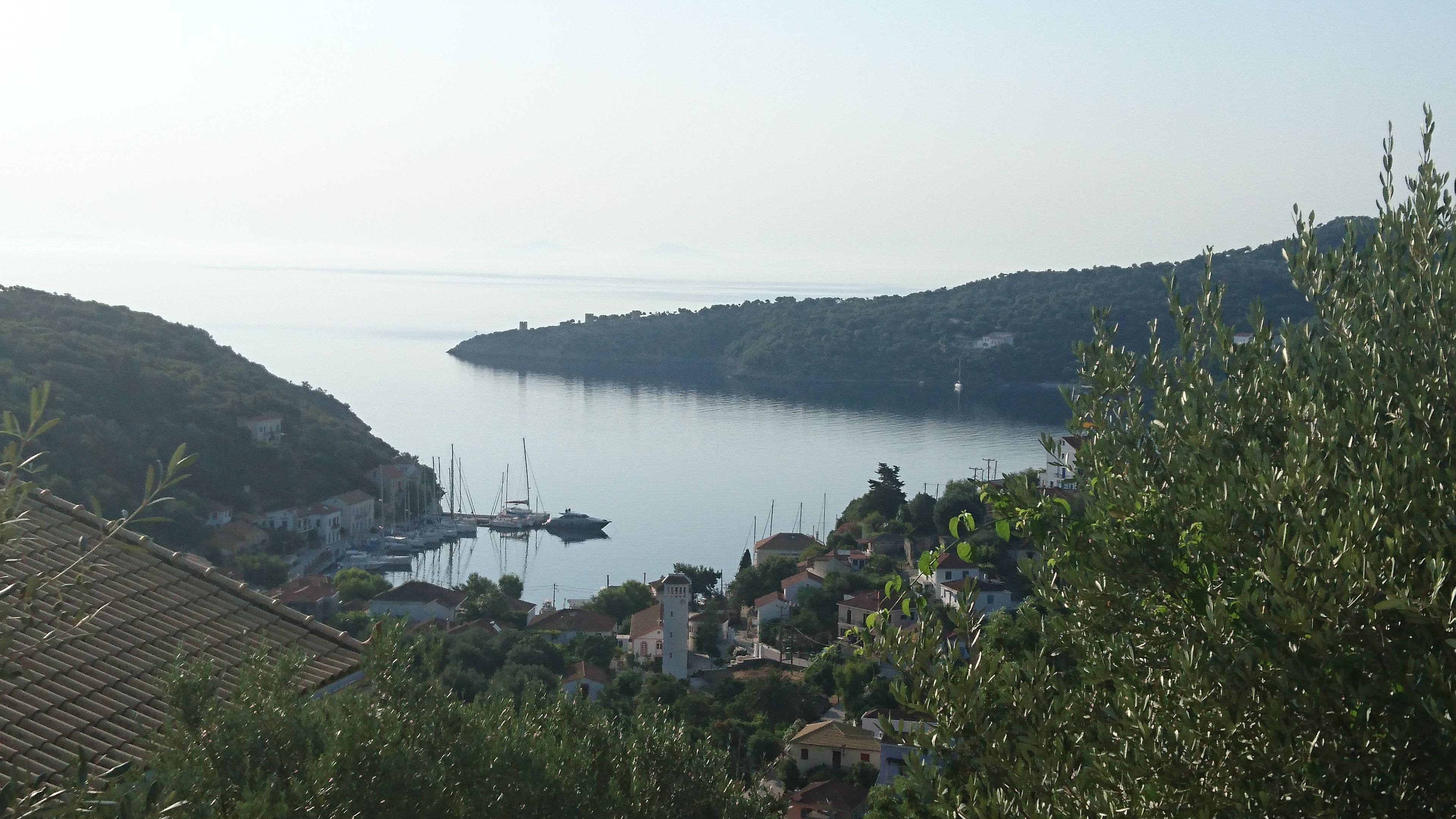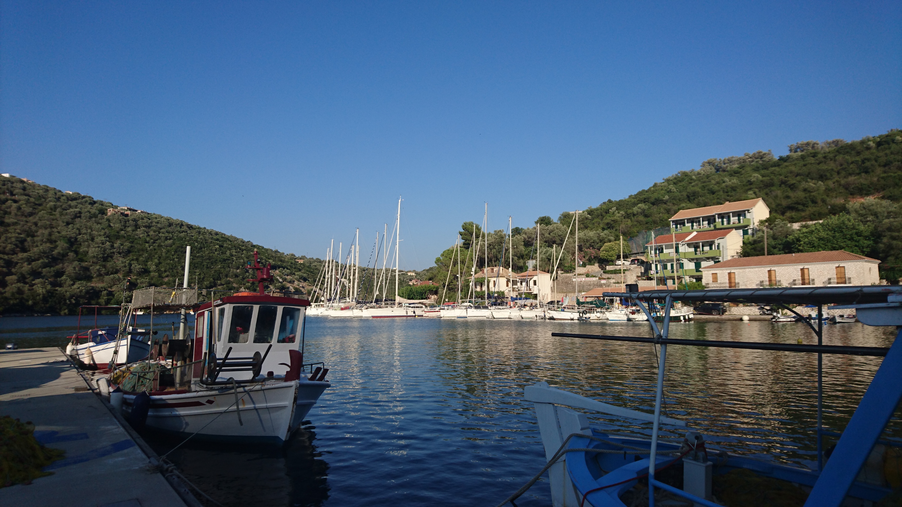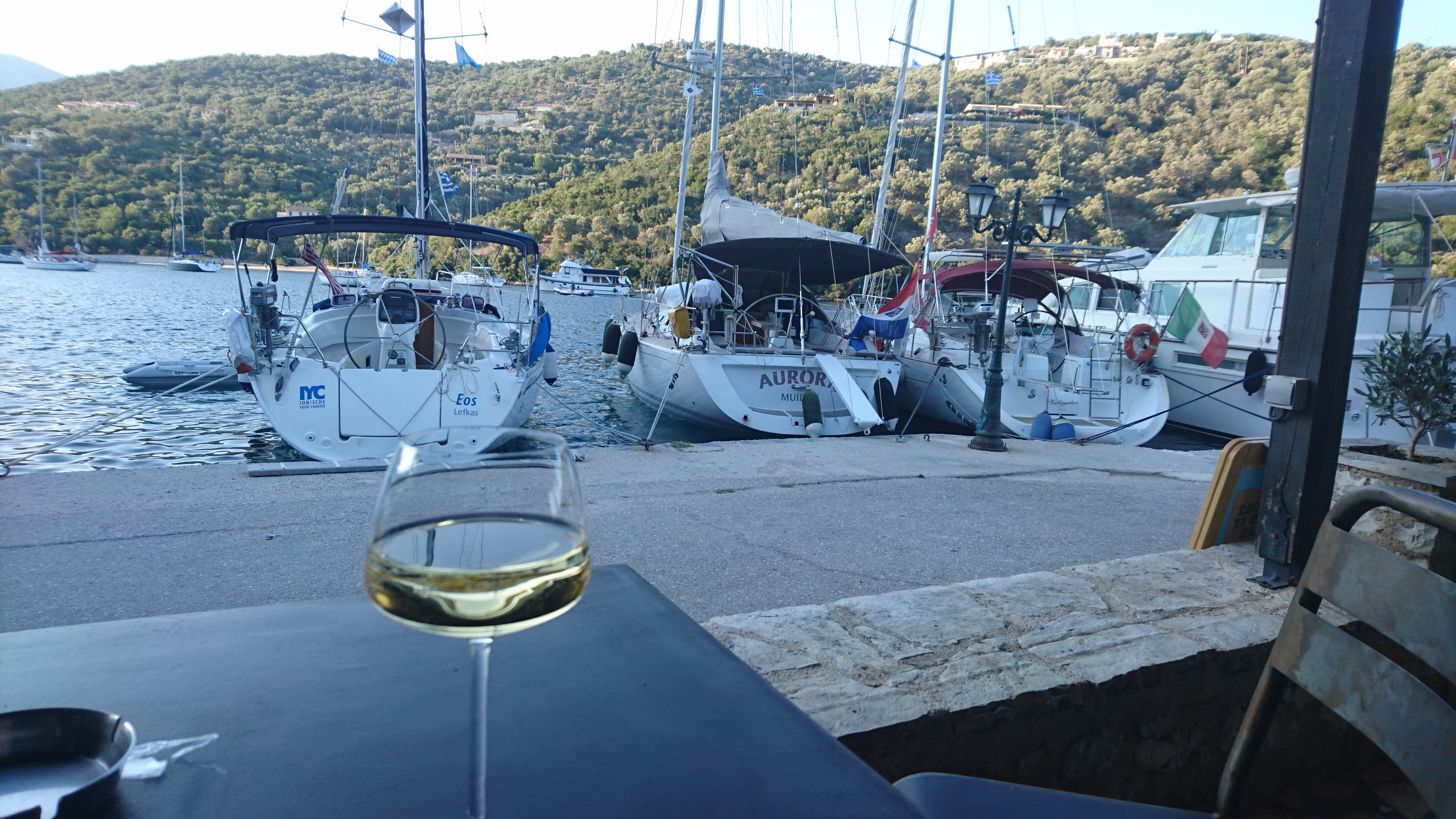 Tip van Mariëtte die hier vorig jaar als landrot was. Inderdaad een mooie natuurlijke haven in een baai met een klein dorpje, dat drijft op het bootjesvolk. De kade, die rondom het baaitje loopt, is voorzien van de nodige taverna’s en winkeltjes. Er zijn 2 kleinere huurvloten die hier hun thuisbasis hebben, maar als je vroeg bent is er plaats genoeg. We liggen in de hoek van de haven voor een leuke loungebar, die in een oude olijfperserij zit. En ons ook van Wifi voorziet!