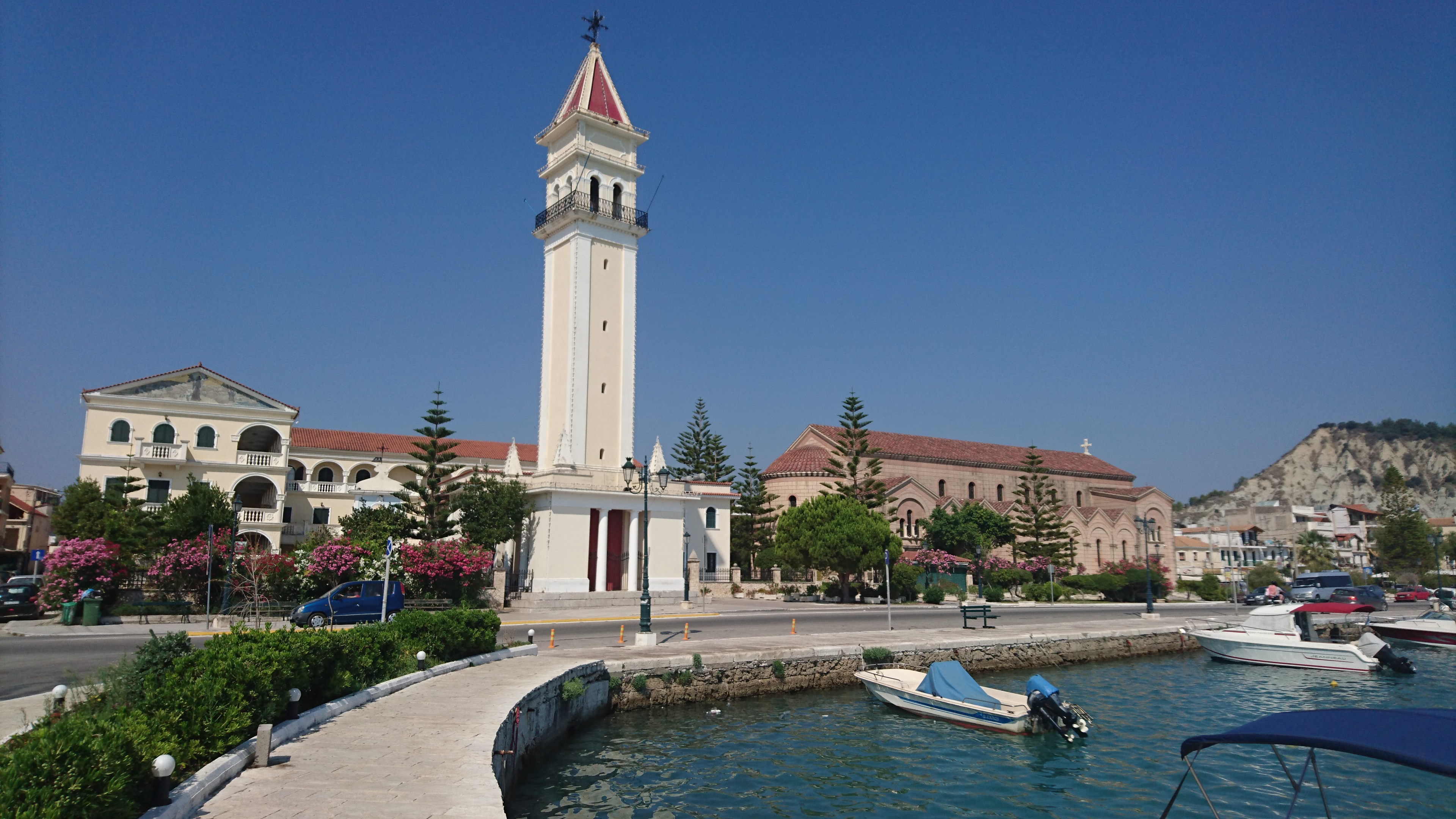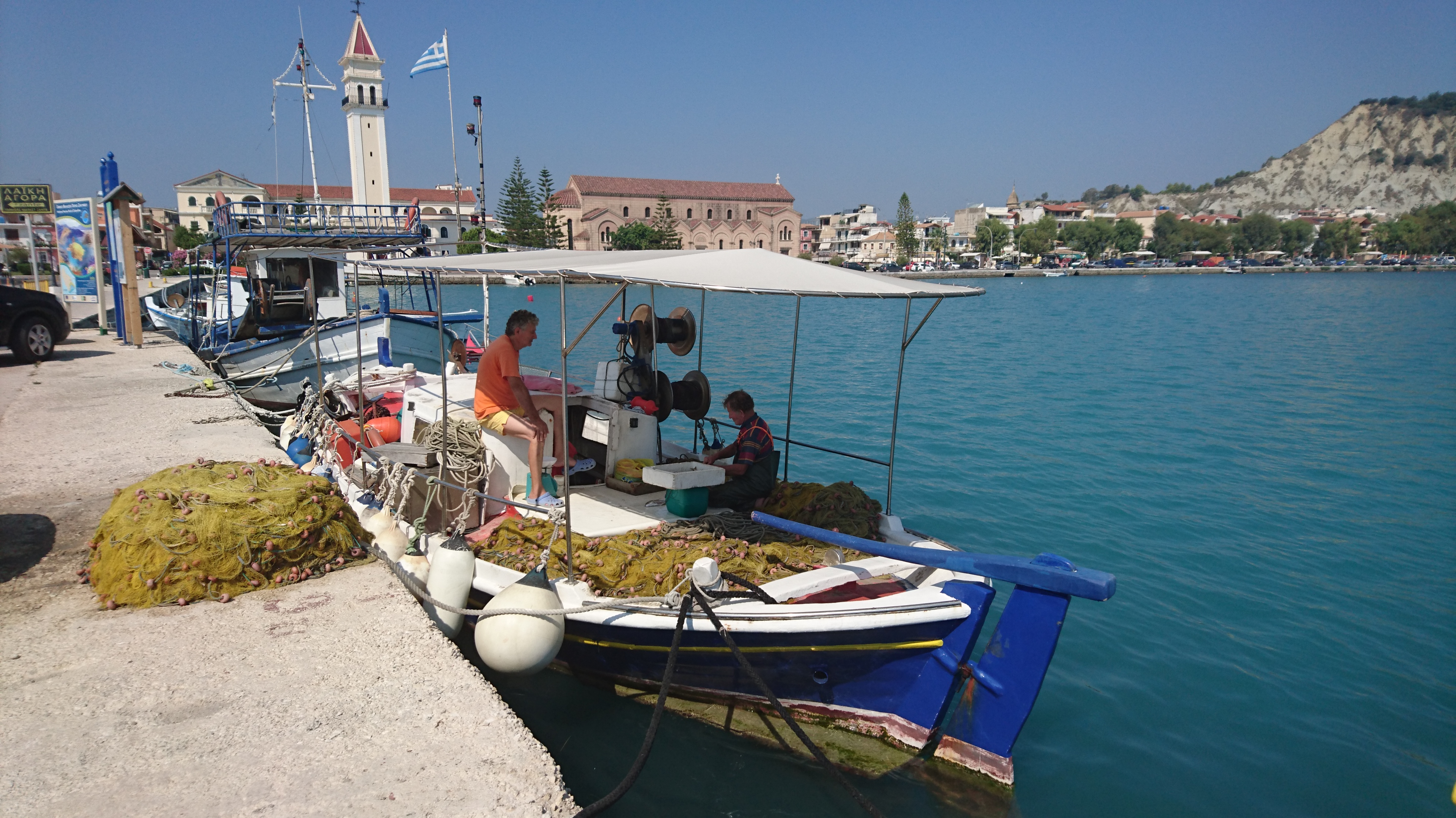 We varen op 12 juli van Kefalonia naar Zakynthos, het zuidelijkste van de Ionische eilanden. Het is een stuk vlakker dan waar we tot nu toe waren. We leggen aan in de haven van Zakynthos stad, waar het flink druk is langs de kade met auto’s en flanerende voetgangers. Leuk stadje, dat in 1953 na een grote aardbeving opnieuw is opgebouwd met uitzondering van de kerk uit 1925, die overeind bleef staan. We bezochten deze kerk, die heel rijk versierd is.