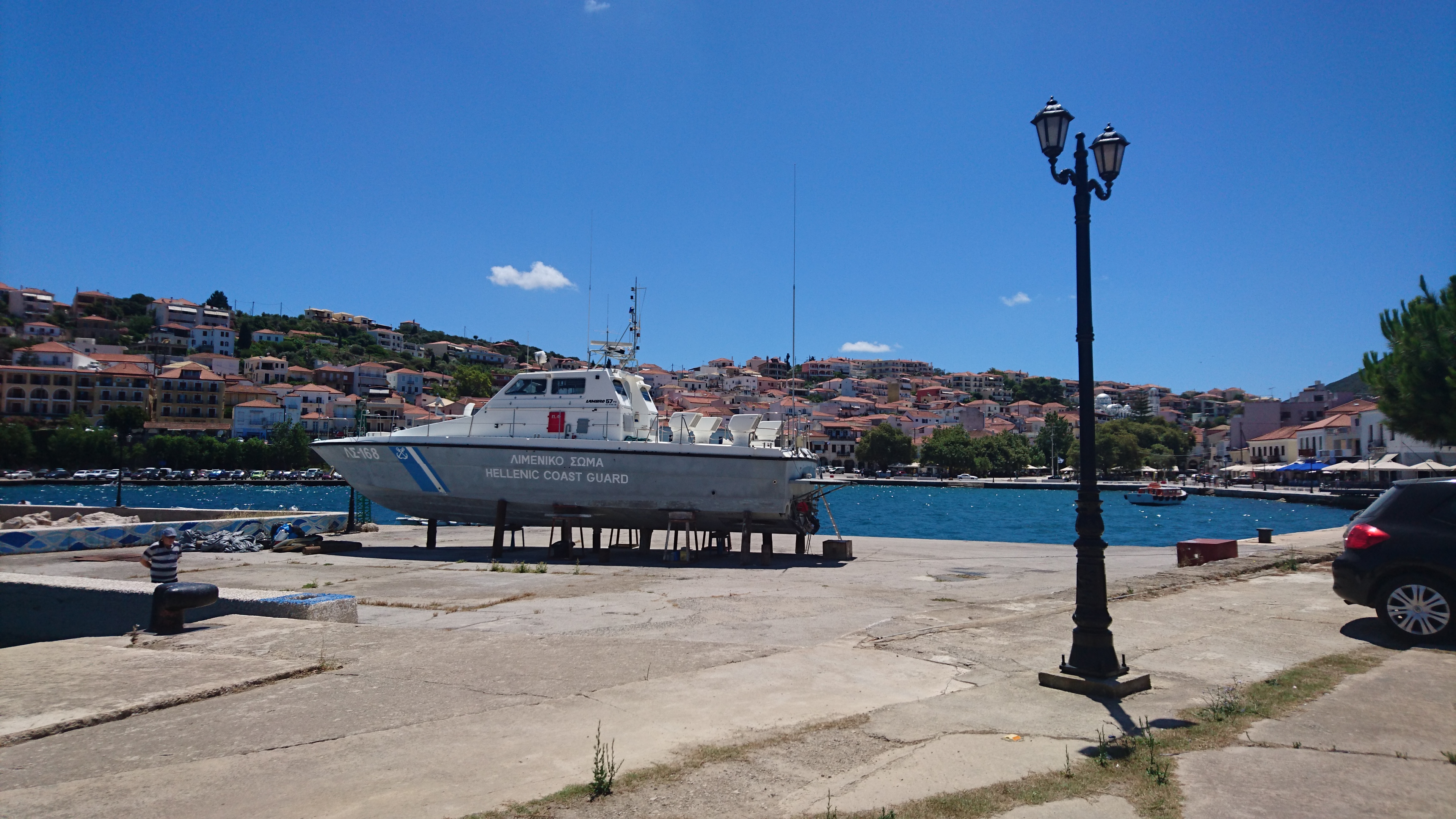 Kiparissia is een “Euro-Hafen” , hadden we al van Duitsers gehoord. Dat betekent niet dat je veel Euro’s moet betalen. Nee, juist het tegenovergestelde. De haven kost niets, heeft ook niets, maar is wel op kosten van de Europese Unie aangelegd. De gemiddelde Griek begrijpt waarschijnlijk niet waarom en dus gebeurt er ook niets mee. Betonnen kades die al weer in verval raken, elektriciteitskastjes die niet aangesloten zijn, een provisorische waterslang met 2 kranen op een kade van 200m lang. En bijna geen jachten. We liggen er wel mooi langszij voor nul Euro.
