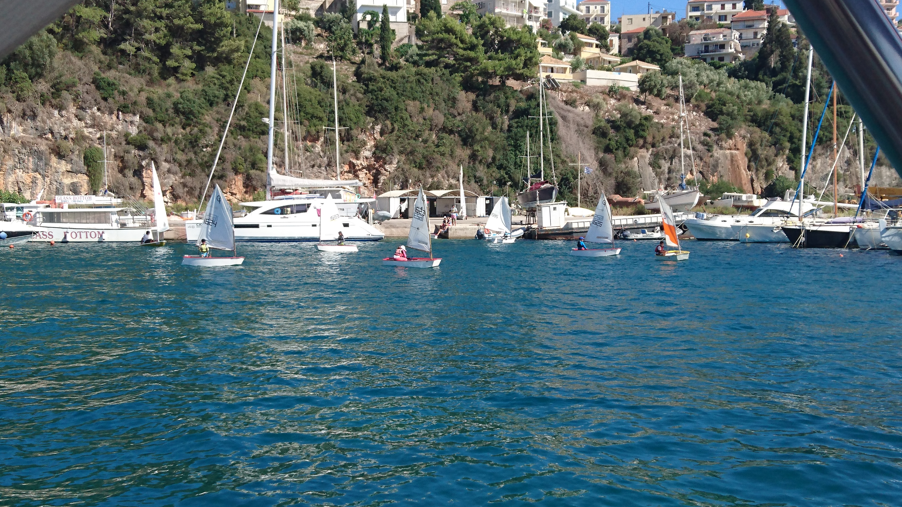 Frans marineschip vertrekt uit Pylos. Let op vlag halfstok vanwege de aanslag in Nice. Voor de kenners: wat doet de laserzeiler op de voorgrond fout?
