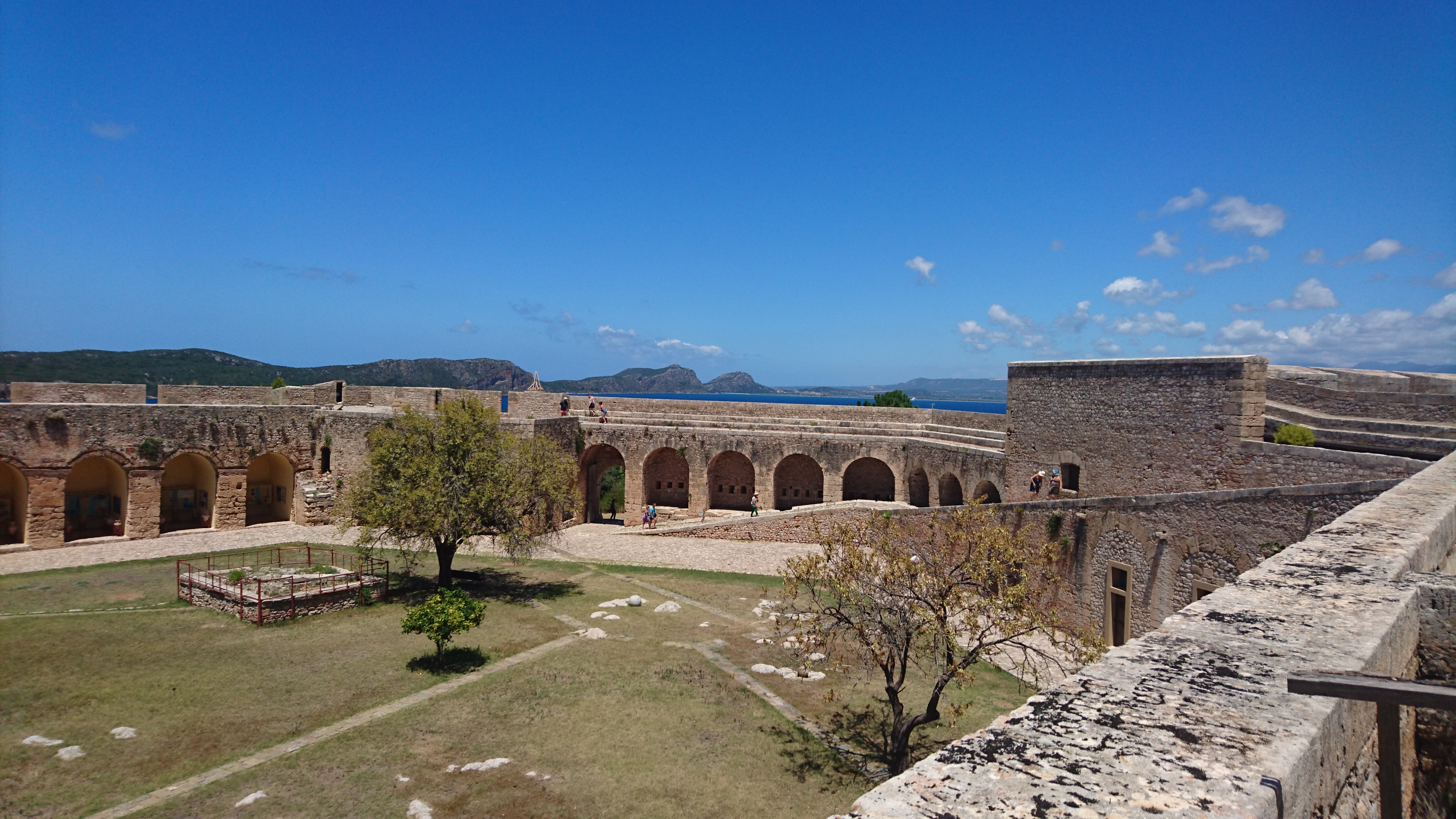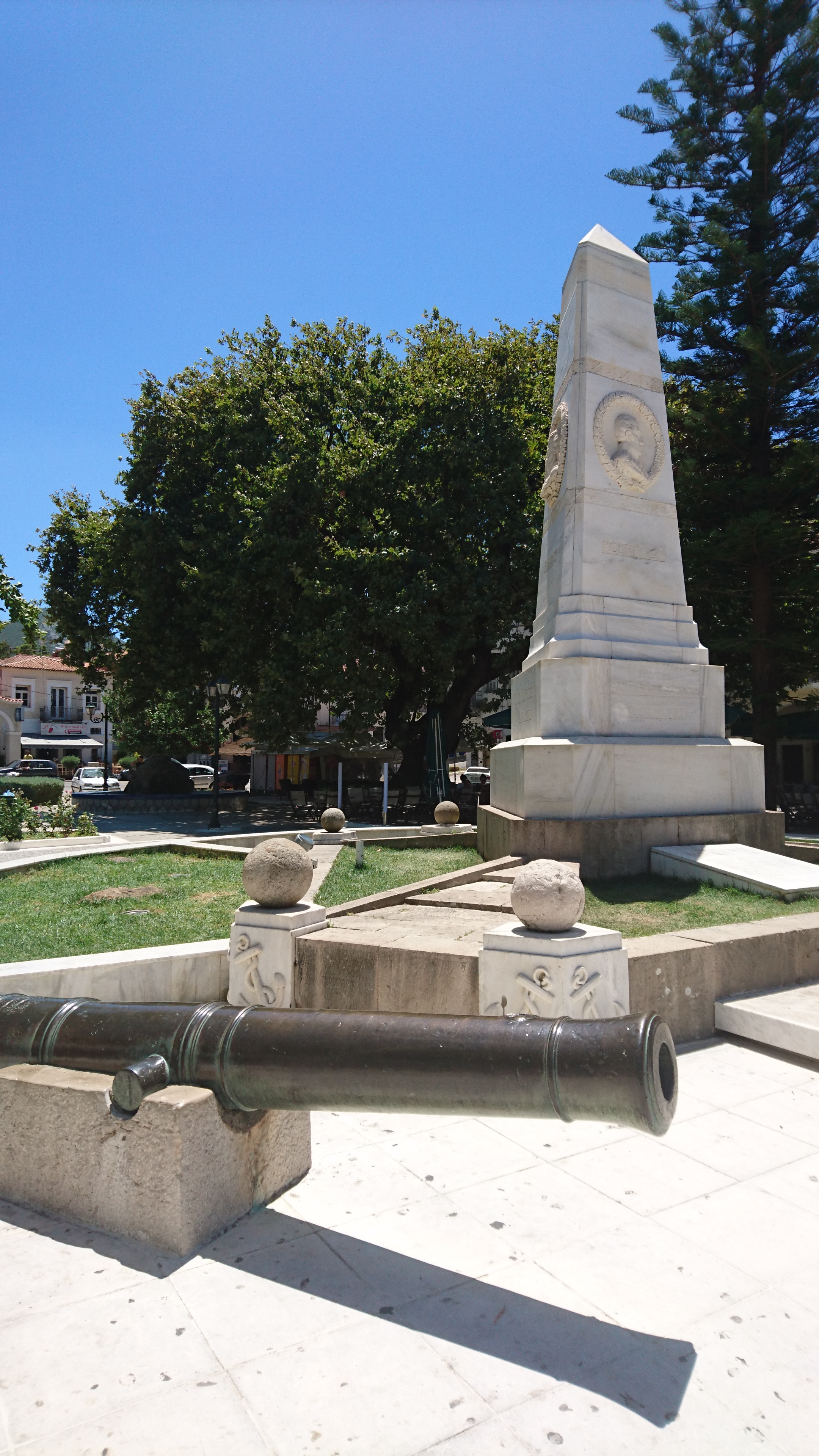 In het stadje op het centrale plein staat het standbeeld met de 3 bevrijders van Griekenland in 1827, een Engelsman, een Fransman en een Duitser. Aardige Europese gedachte destijds…. De vijanden waren de Turken, by the way. De zeeslag vond plaats terwijl alle schepen voor anker lagen in de baai van Pylos. De geallieerden wonnen niet omdat ze in de meerderheid waren (integendeel juist) maar omdat ze een betere routine hadden in het sneller laden, richten en schieten!