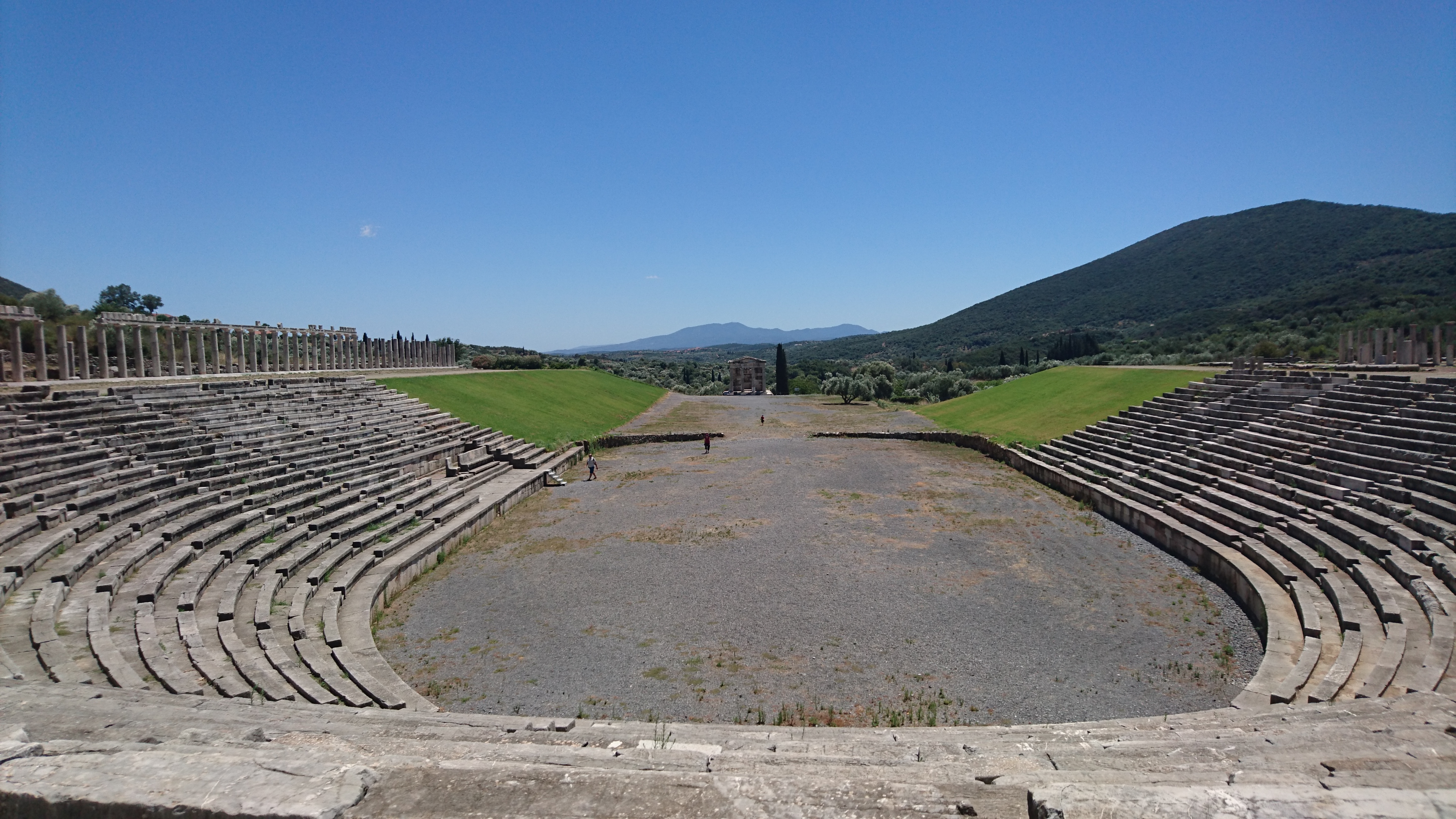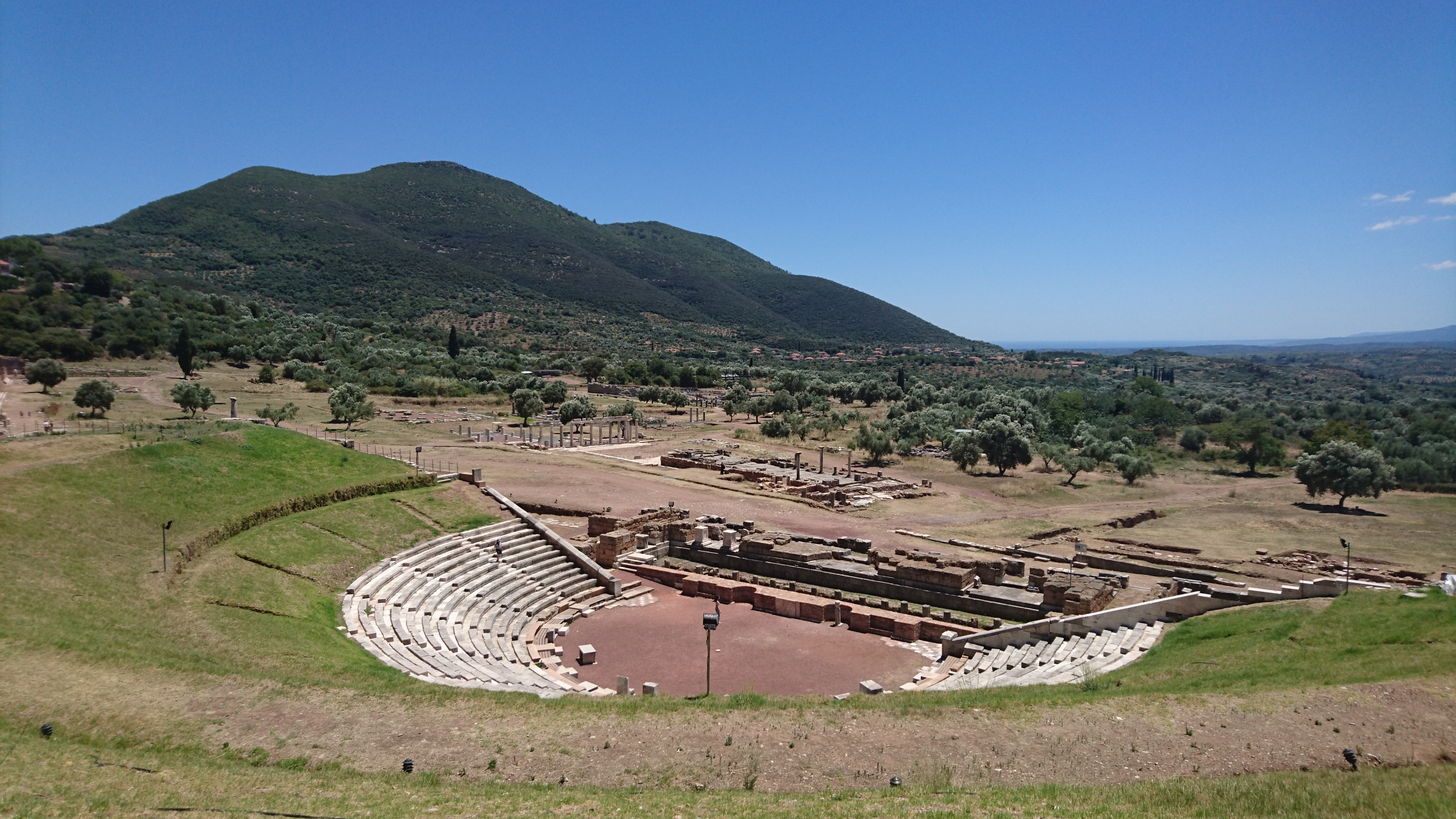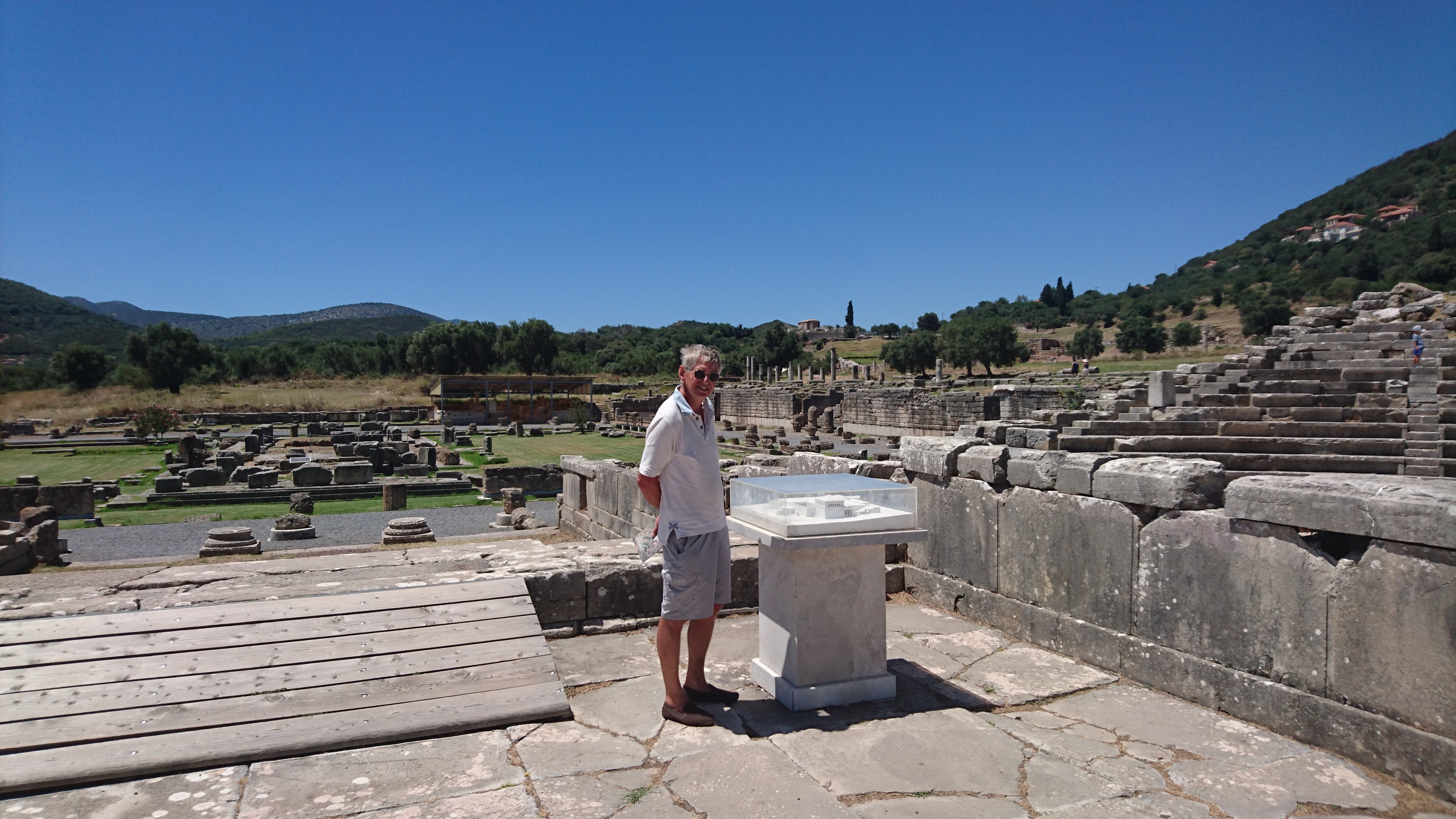 Daarna rijden we naar de opgravingen bij het oude Messini (van de Messeniërs, de eeuwige vijanden van Sparta). Hier bouwden zij na veel strijd hun definitieve stad en haalden hun door de Spartanen verbannen landgenoten weer terug uit Sicilië (Messina!) en Noord Afrika. Deze archelogische site is eigenlijk nog indrukwekkender dan Olympia. Naast een mooi amphitheater (dat verrijdbare decors heeft gehad van 2 verdiepingen hoog) en een schitterend heiligdom van Asklepion, waarin tempels van o.a. Artemis en een apart, kleiner amphitheater. Ook een bijna intact Gymanision met renbaan, tribunes bij de finish en een indrukwekkende zuilengalerij. En zo te zien ligt meer dan de helft nog onder de grond!