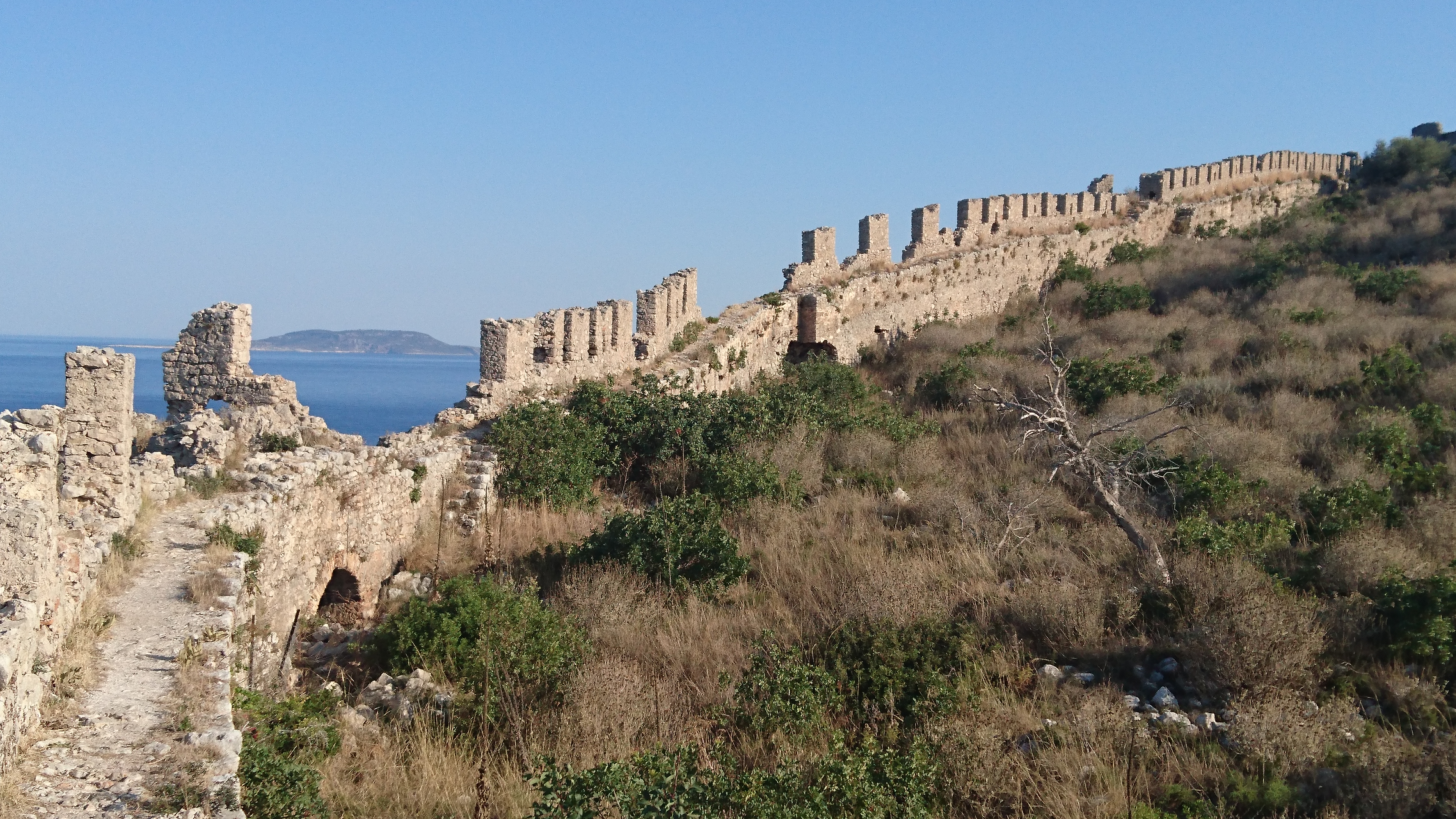 We wandelen naar de mooie burcht (Neo Kastro) boven het stadje en bekijken dat uitgebreid. Het is een echte oude vestingstad geweest met ooit 600 huizen, helemaal ommuurd en met een slotgracht. Nu is er behalve de muur, de torens en een kerk niets meer van over, maar die zijn dan ook wel heel mooi gerestaureerd.
