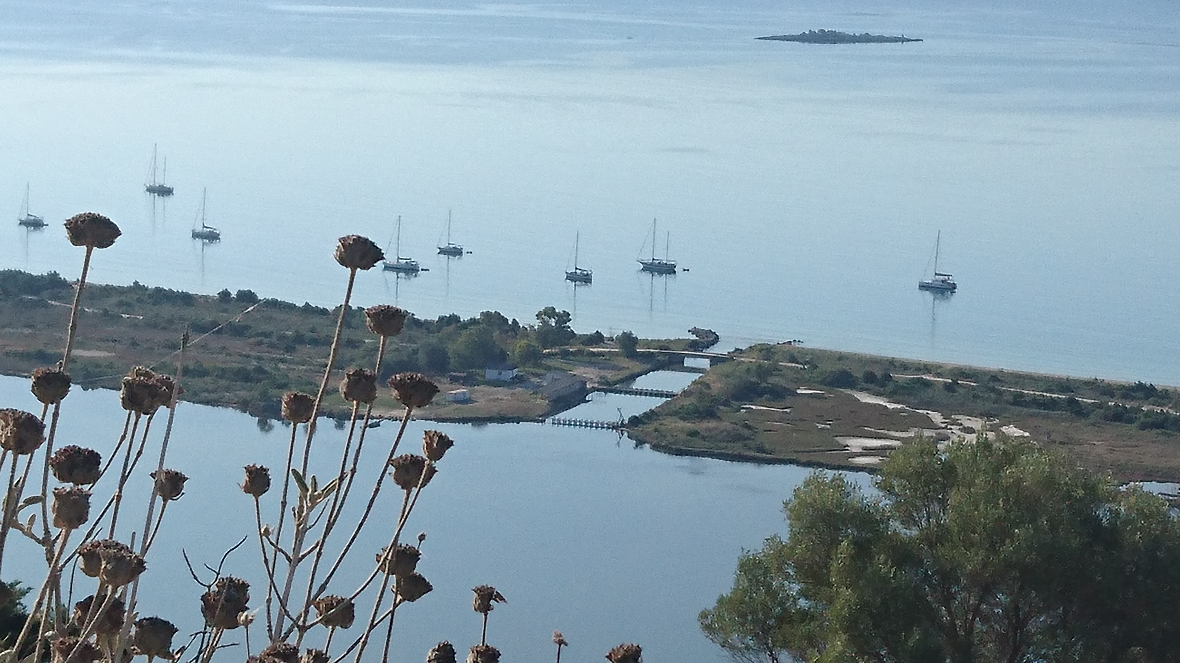 Na de brug varen we het kanaal uit en komen we op de “binnenzee” tussen Lefkas en het vasteland. Een soort Ijsselmeer, maar dan met mooie groene en heuvelachtige eilanden erin en met mooi helder water van 23 graden. We ankeren in de baai met het meest heldere water, Ormos Marathias, de BB kant van Ormos Varko, onder het vasteland. Als we ankeren waait het 20 knopen en bij de tweede poging houdt het, diep in het zand getrokken. Dat kun je met je snorkel nog even checken op meer dan 10m diepte. Rustgevend, maar niet echt nodig om ons zorgen te maken, want na 20:00 uur valt de wind bijna weg en lig je gewoon alleen op je ketting al op dezelfde plek.