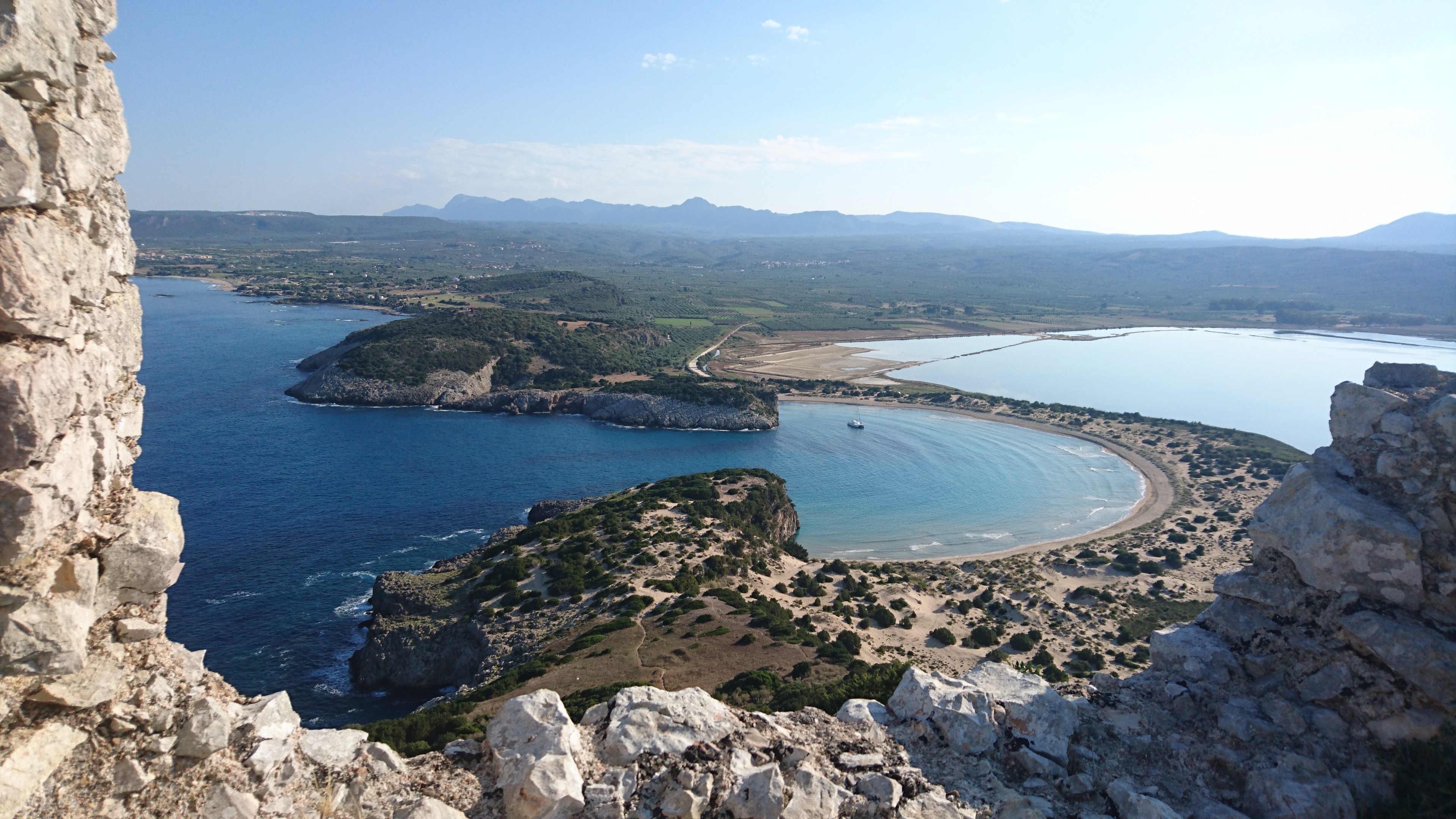 We liggen nog steeds voor anker in het noorden van de baai bij Pylos. Vandaag staan we om half acht op en we varen naar het strand met de rubberboot. We gaan wandelen naar de oude burcht, die half ingestort is maar wel op een schitterend strategisch punt ligt, die de oude Nestor al in gebruik had als wachtpost.