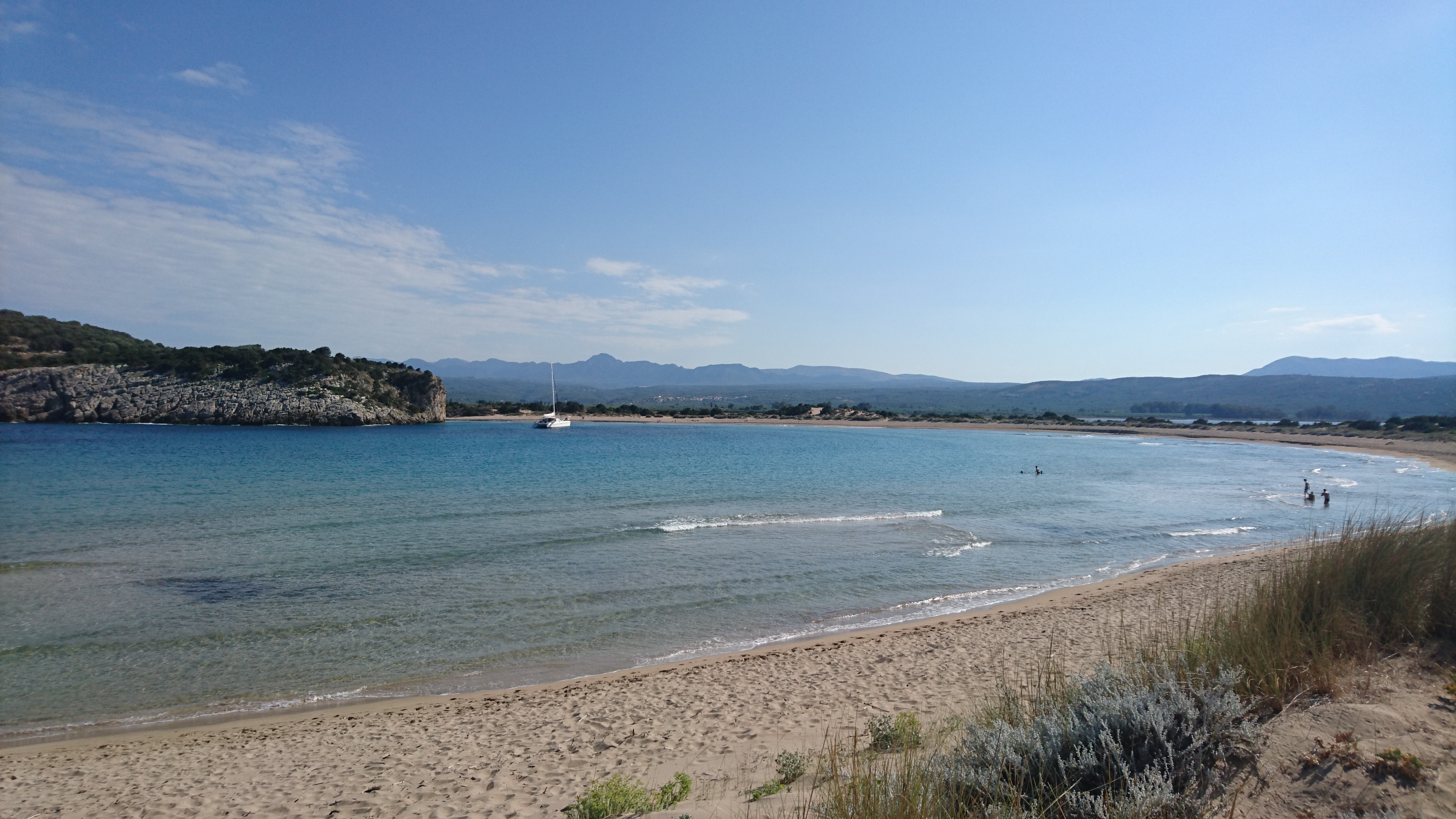 Na een uurtje naar boven klimmen, rondkijken en een half uur weer afdalen, lopen we nog langs de brakke lagoon achterin de baai. Je komt dan bij Nestor’s cave, waar de vloot triremes van Nestor op het strand getrokken werd. In de Griekse volksmond heet deze lagune nu “de koeienmaag”. Schitterend strand in een hoefijzervormige lagune, waar het helaas te ondiep is voor ons. Er lag wel een catamaran voor anker.