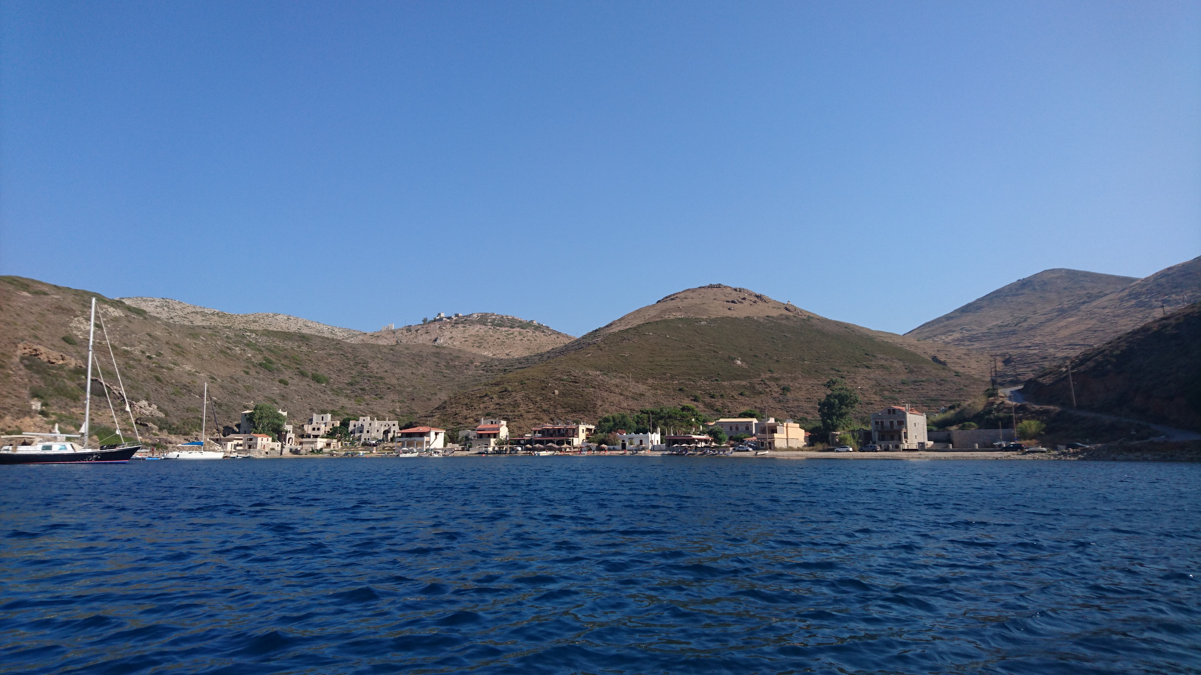 De volgende dag varen we weer verder en stopten tegen de planning al na 8 mijl in Tyros. Een klein vissershaventje bij een wat eenvoudig dorp, dat langzamerhand een vakantiebestemming wordt, maar nog wel van de eenvoudige soort (kamers te huur bij mensen thuis, eenvoudige hotelletjes). Aan de haven zitten we lekker aan een barretje een ijskoffie te lurken met uitzicht op de boot. We moesten vanmiddag wel opnieuw ankeren want de ankergrond in de haven is niet erg best. En de middagwind vanuit ZO staat met 20 knopen dwars op je schip; dan trekt je anker dus gewoon uit de bodem! Nu alles weer rustig en we liggen achter 50 m ketting nu echt wel OK.