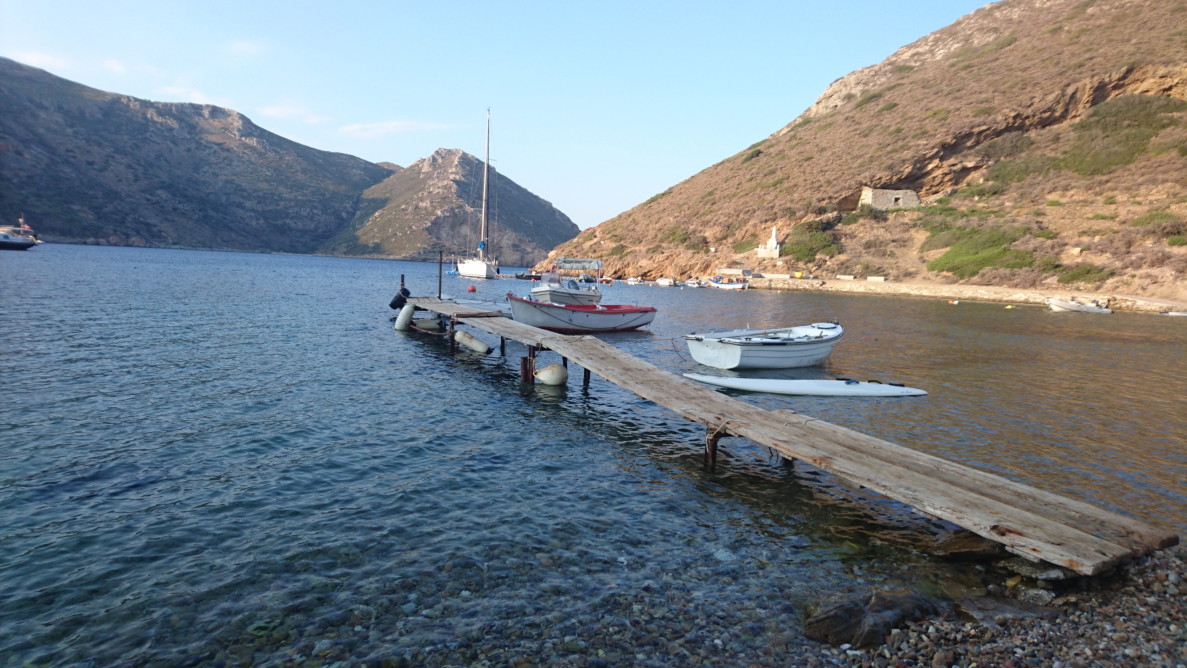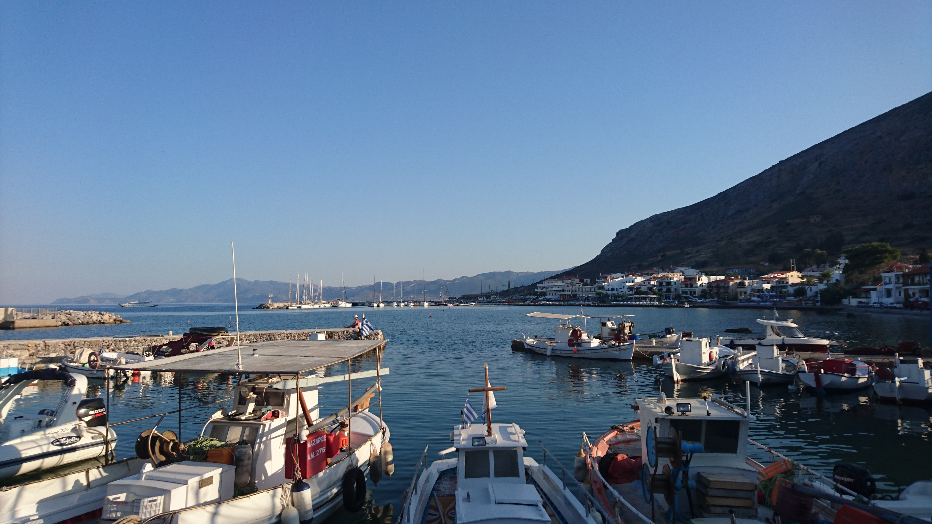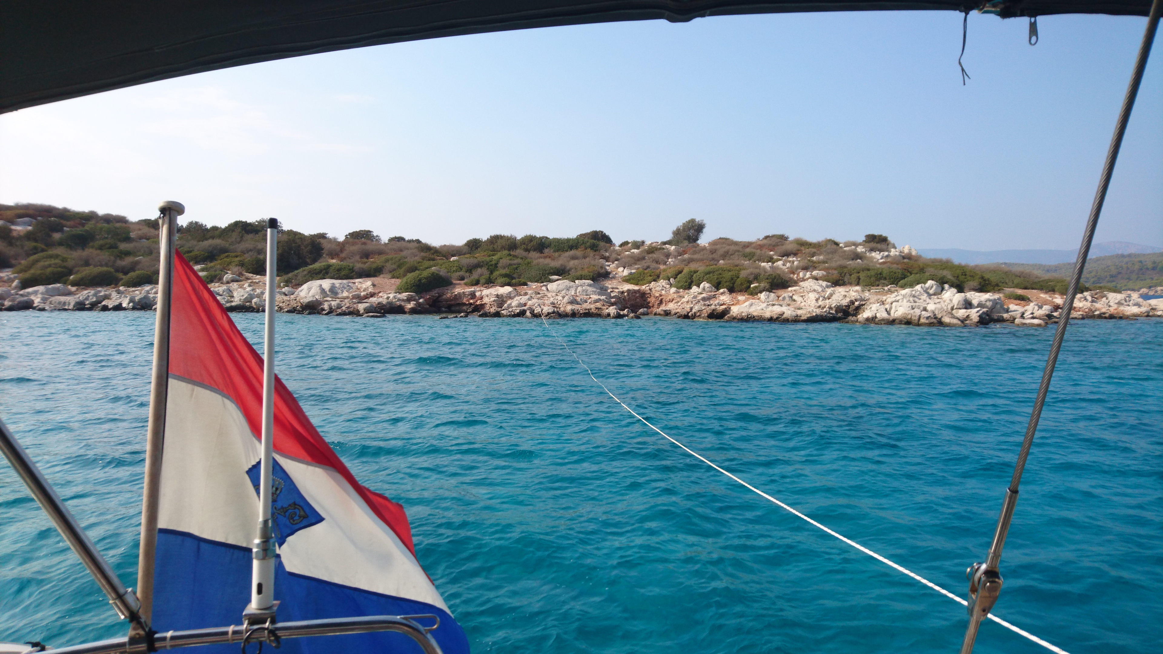 Die dag doen we de was en maken we de boot schoon van buiten. Er is hier namelijk zomaar een kraan voor onze waterslang, een ongekende luxe in een haven in Griekenland! Maar ja, je betaalt ook geen of nauwelijks havengeld. We zien de grootste schildpad ooit, die hier rustig de haven rondpeddelt en dan weer vertrekt. Jammer genoeg is het niet gelukt om hem te fotograferen
