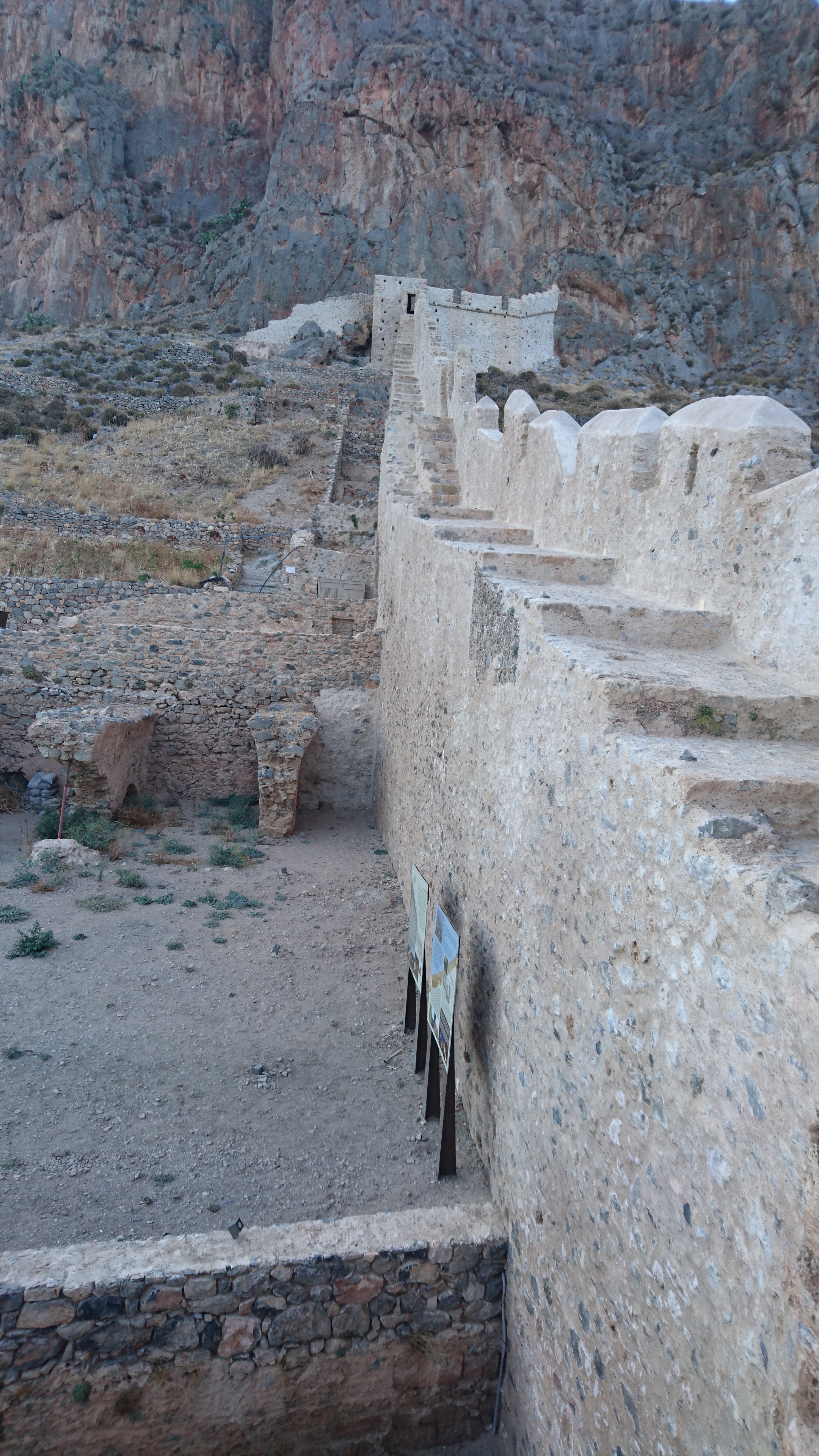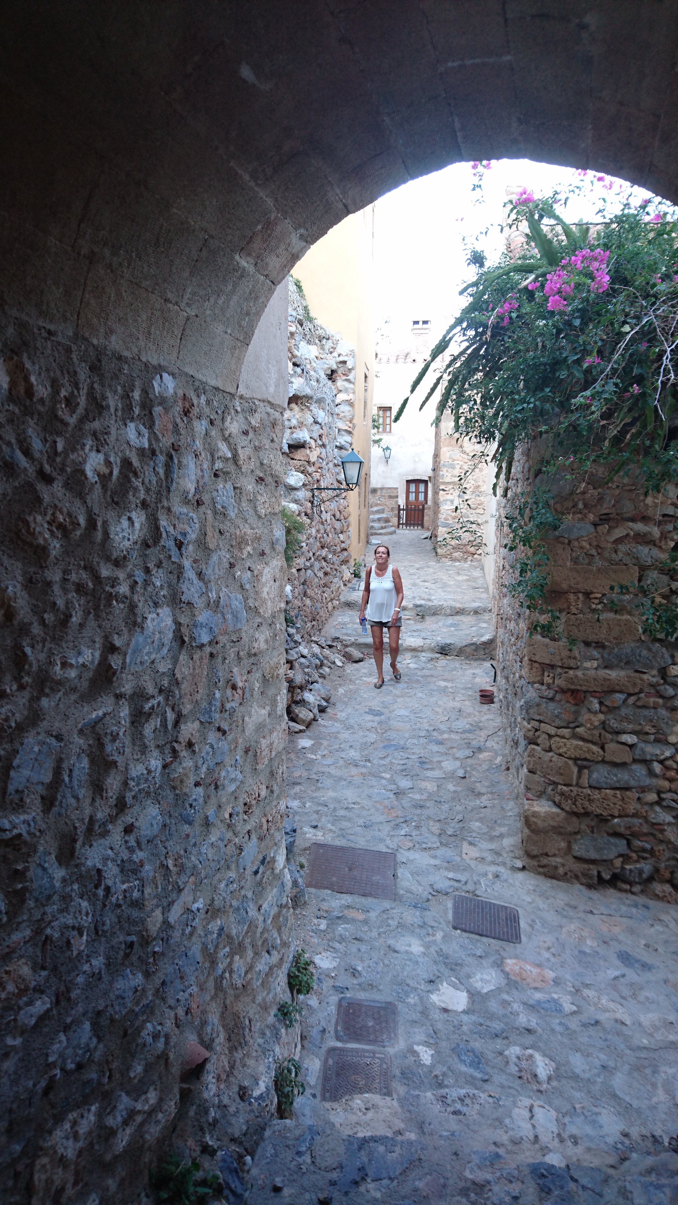 We verkennen eerst de stad op het eiland van Monemvasia. Alleen kleine wandelstraatjes en steile trappen. Erg mooi!
