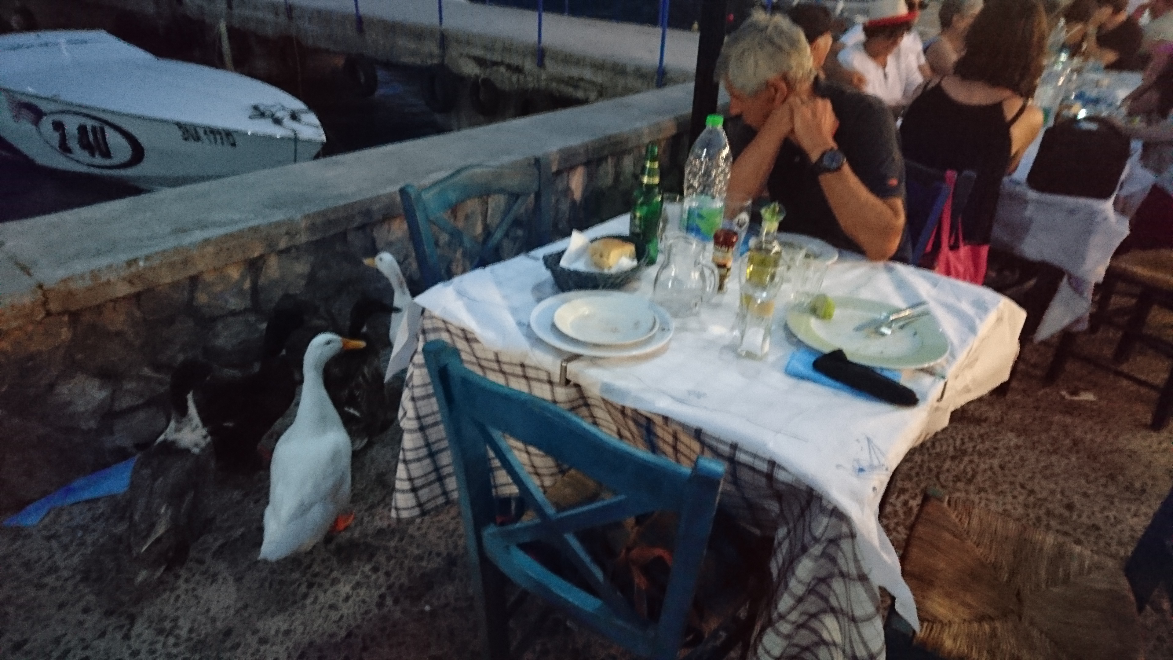 De volgende dag besluiten we te blijven, het blijft namelijk windstil. Op de wal kreeft gegeten bij een restaurant dat hiervoor beroemd is (rechts in de hoek, met de blauwe kleedjes zoals ons was geadviseerd door Rob en Marion, Nederlandse zeilers die we ontmoetten in Leuca!). Het geheel doet meer Italiaans dan Grieks aan, we spreken Italiaans, Spaans en 2 woorden Grieks met de kok (uit Zuid Amerika) en de serveerster (Griekse). We genieten van speciaal voor ons gemaakte kreeft met spaghetti in mooie saus.