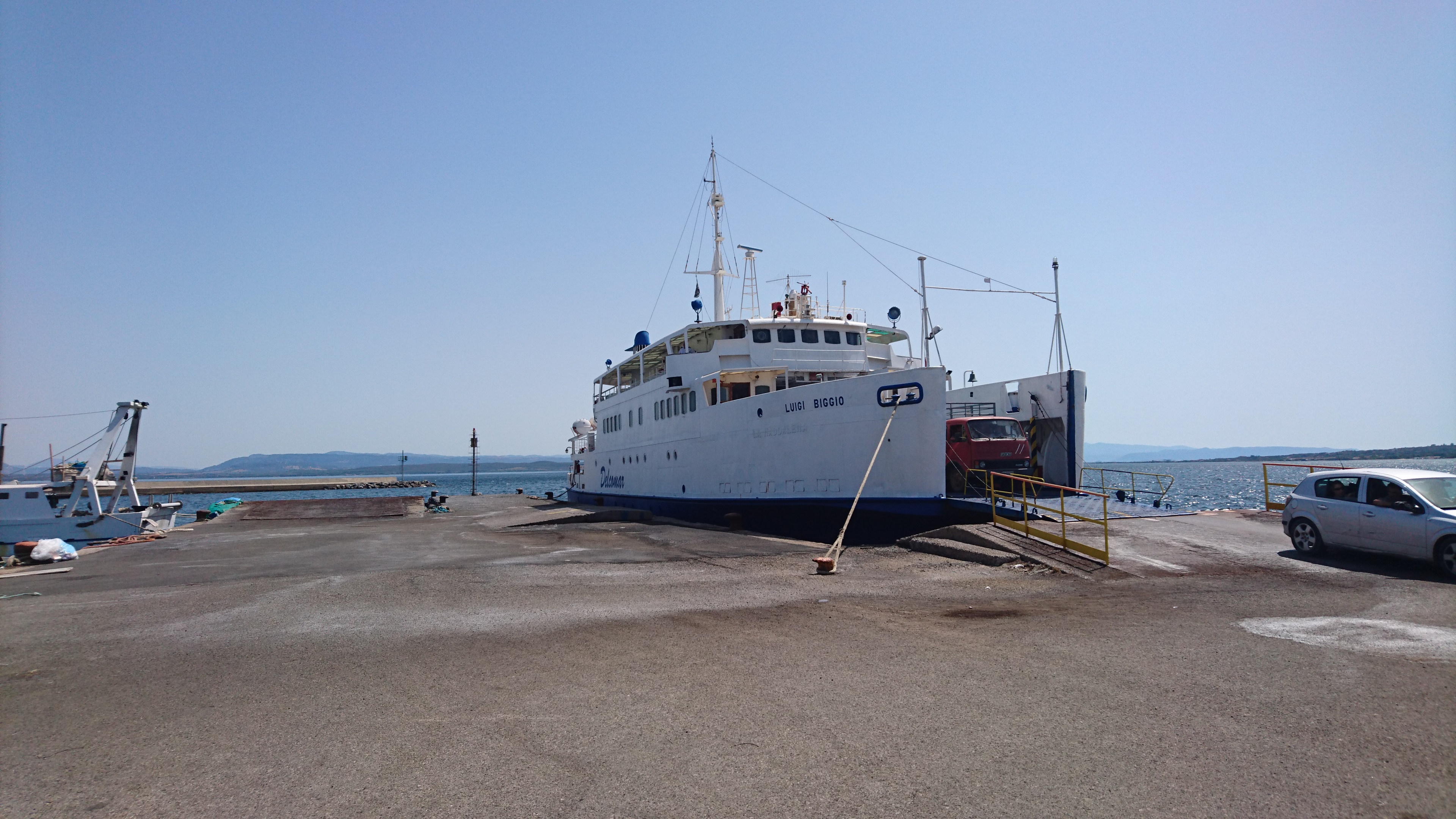 We gaan vandaag per veerboot! Van Carloforte naar Calasetta, een half uurtje varen.