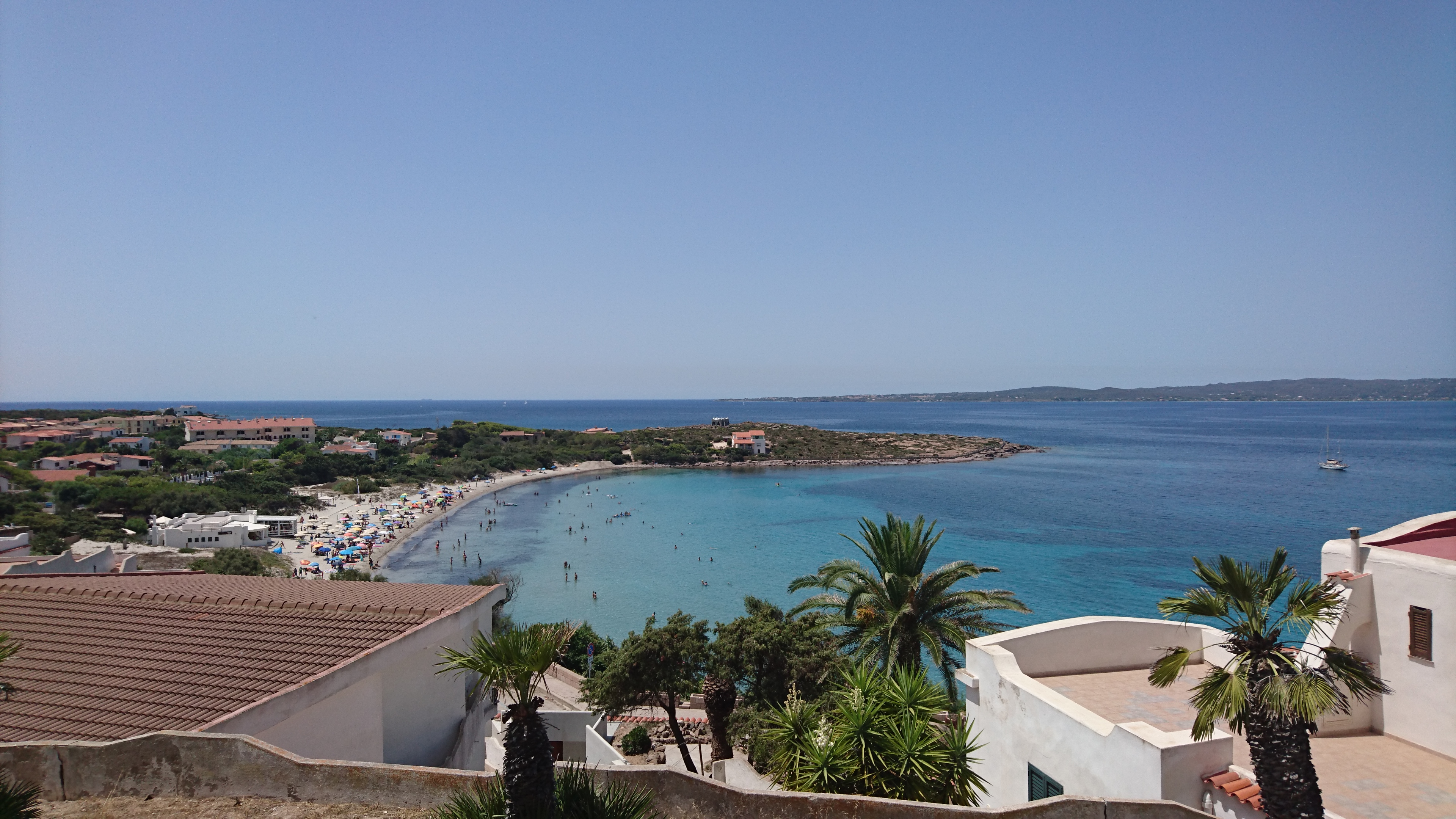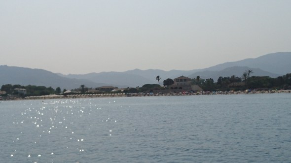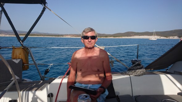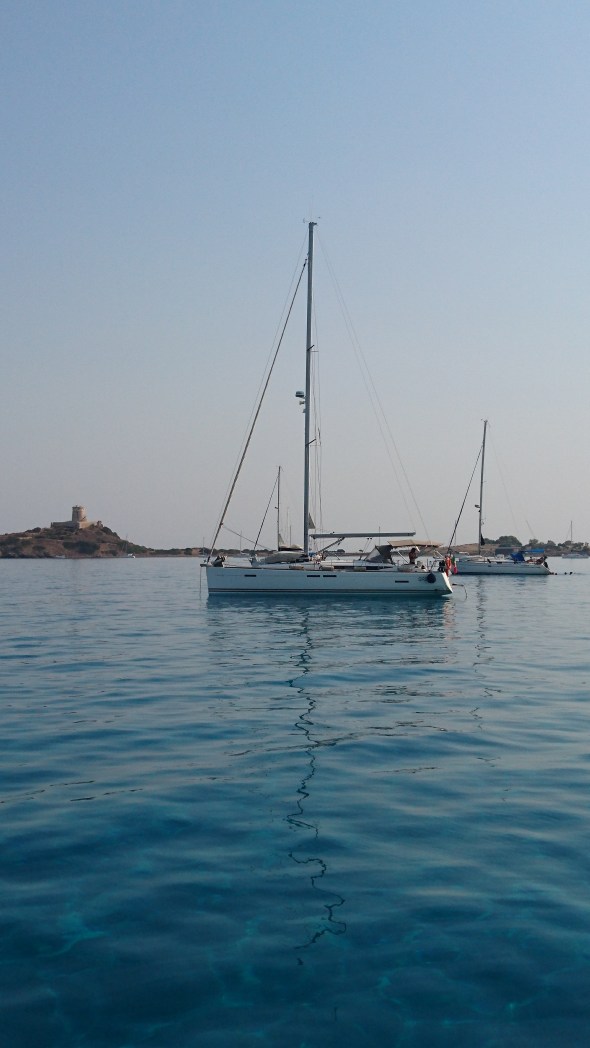 De wind draait met ons mee en wordt zuidelijk. We zijn wat bezorgd voor de wind daar, want met zuidenwind zijn beide baaien bij Pula matig beschut maar dat blijkt onnodig. 5 mijl voor Pula valt de wind gewoon weg en hij blijft ook weg. We ankeren en zwemmen vlak voor de Maybe uit tegenovergestelde richting aan komt varen (op de motor want ook vanaf Cagliari hadden zij hetzelfde verschijnsel: wind bij vertrek, geen wind bij Pula…)