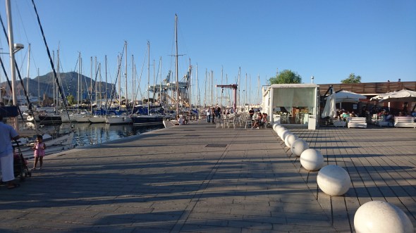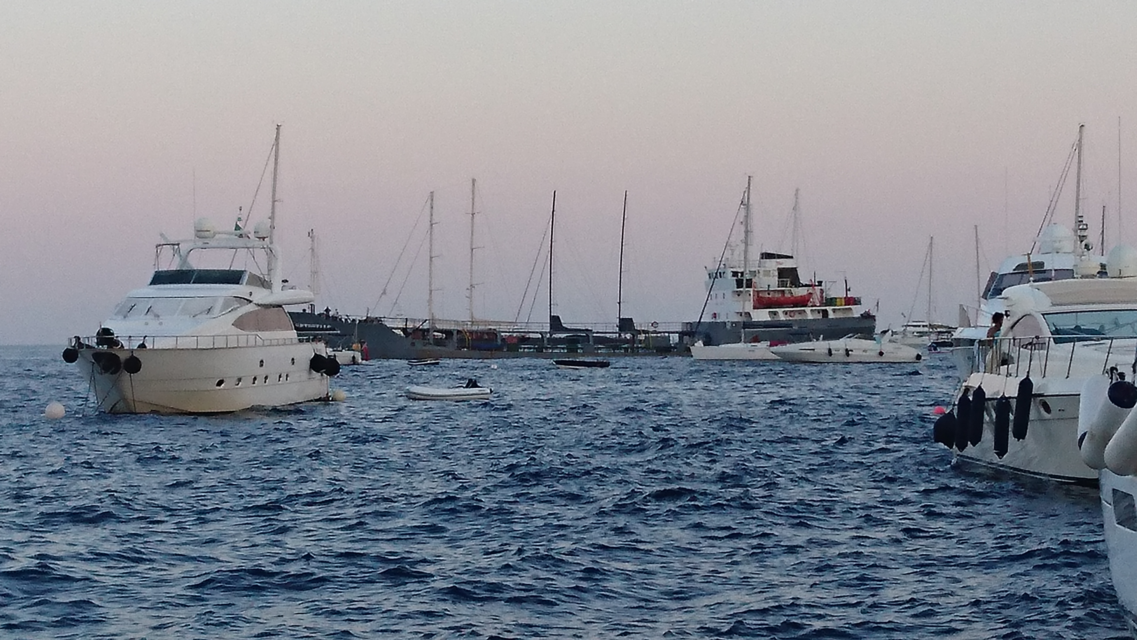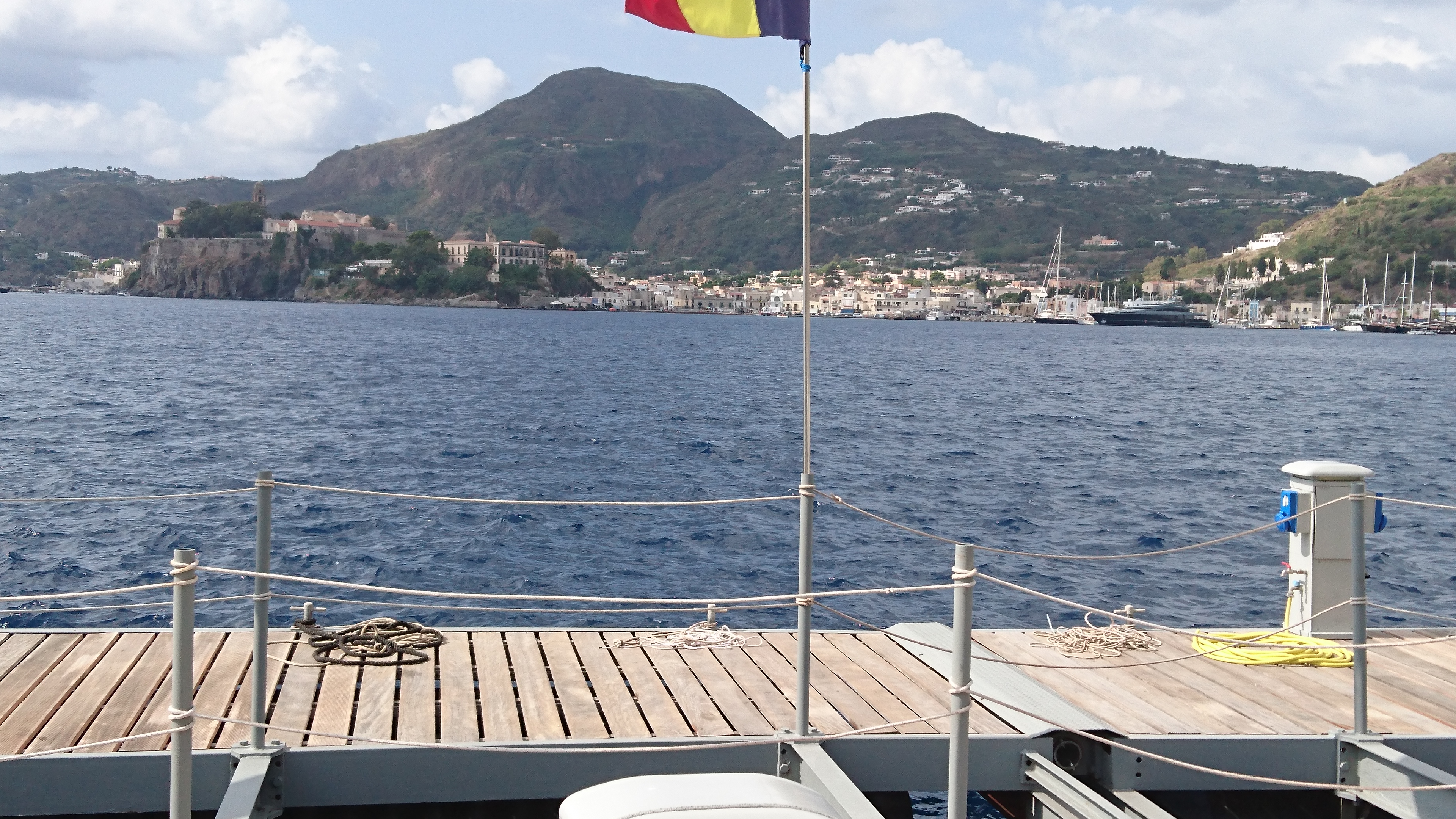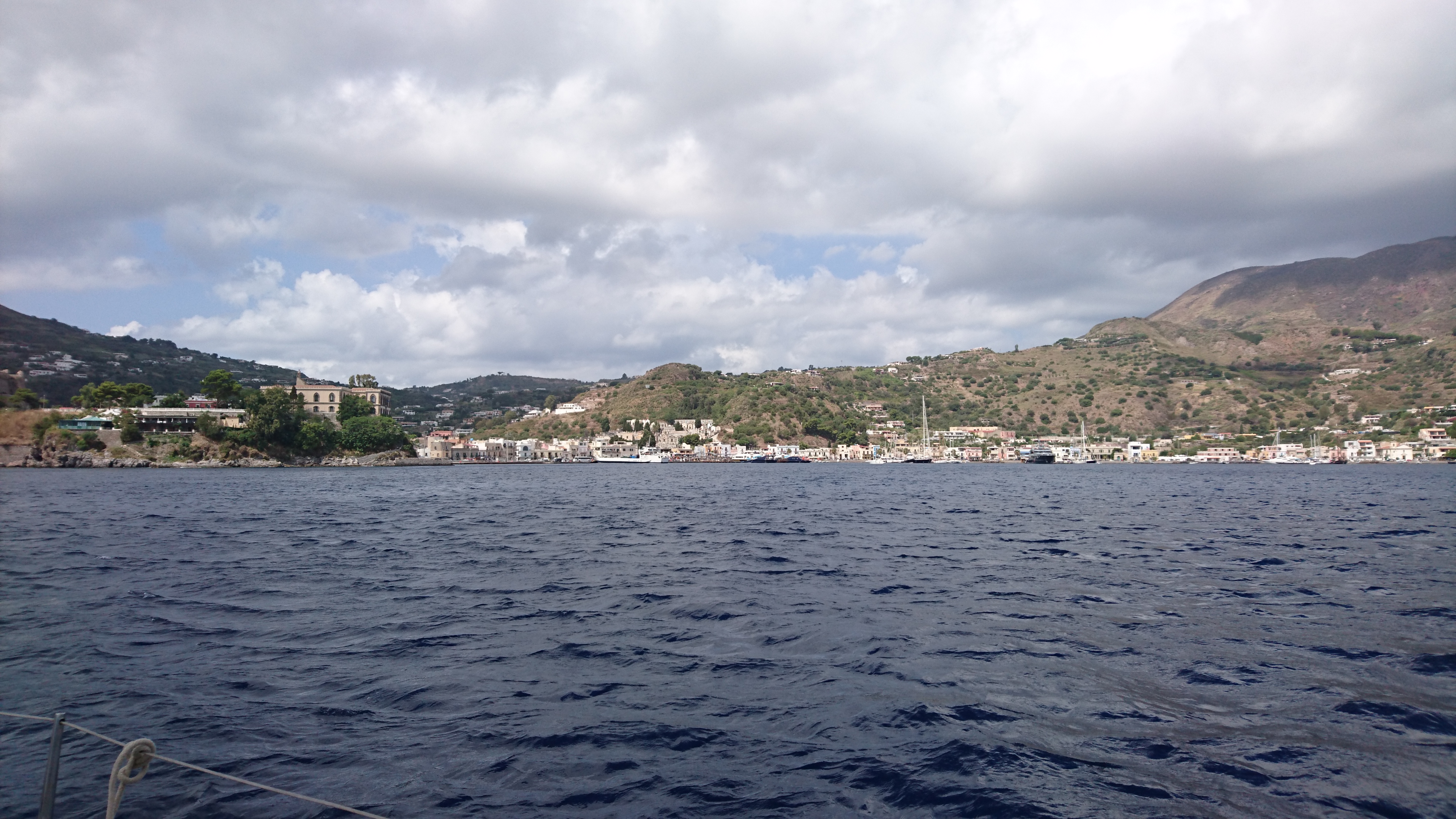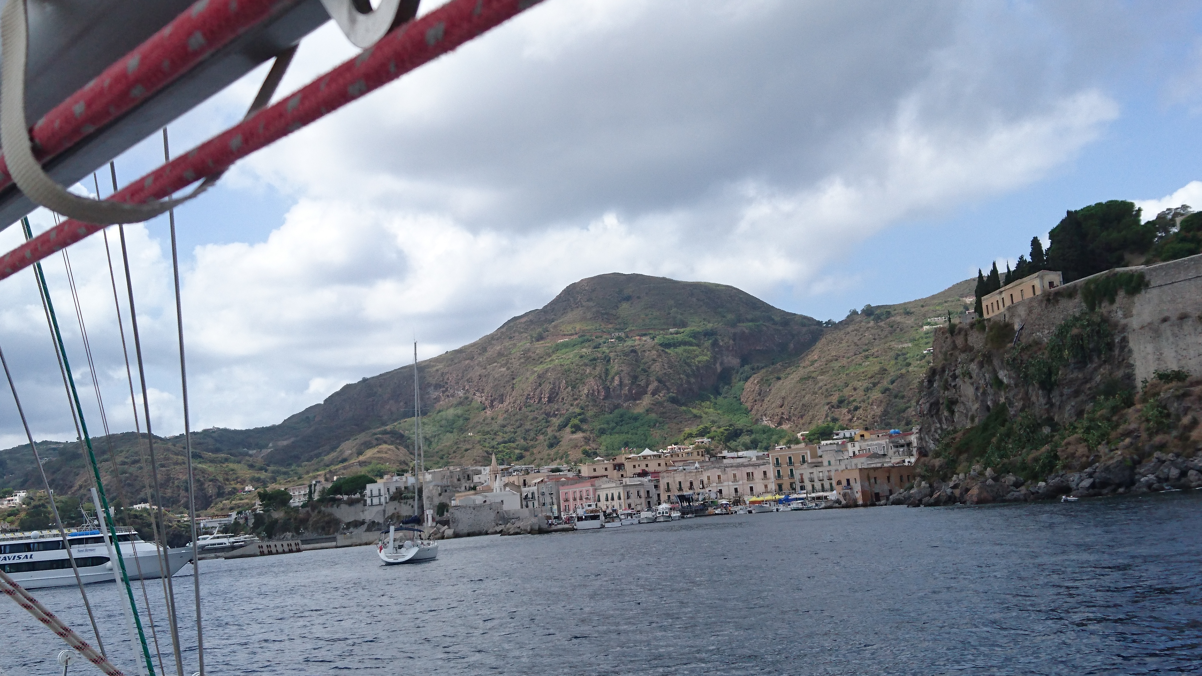 We komen om 16:45 aan in de haven Pignatoro, waar we aan de steiger van EOLmare een plekje hadden gereserveerd. Alles klopt en we worden door 3 man sterk geholpen m: et aanleggen. Met wat zijwind is dat ook wel handig. We ontdekken ook direct waarom er tussen de zeiljachten veel ruimte wordt gelaten: de deinig van snelle motorboten en ferries loopt onder de drijvende steigers door en veroorzaakt een wild geslinger van alle jachten aan de steiger. Met alle risico’s van masten en zalingen die elkaar kunnen raken wanneer je niet genoeg afstand hebt tot elkaar. Maar dat gaat hier allemaal prima.