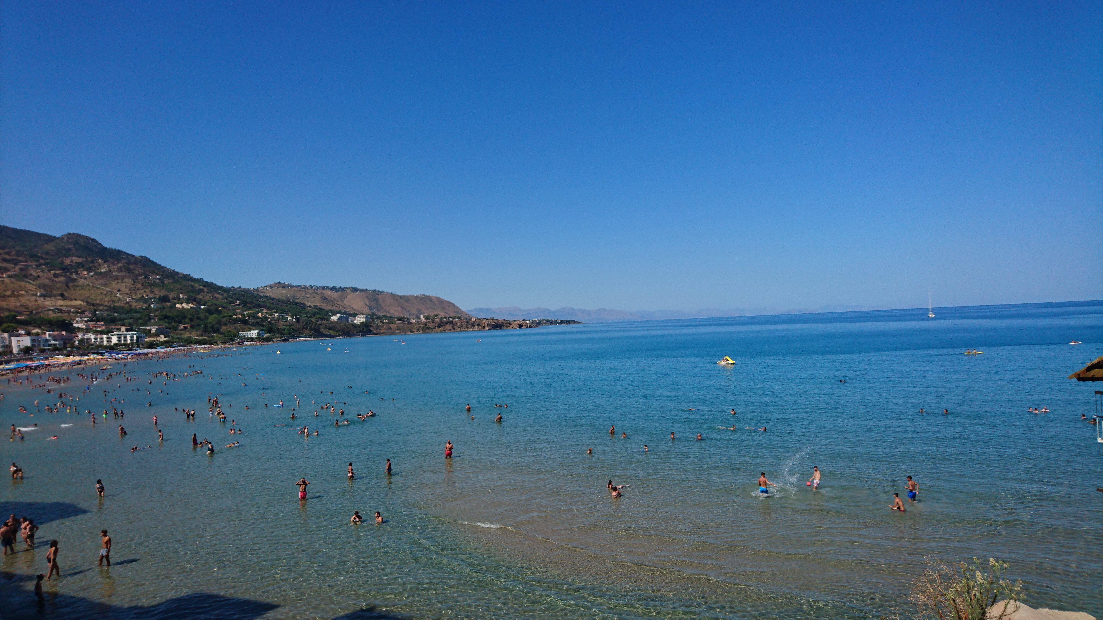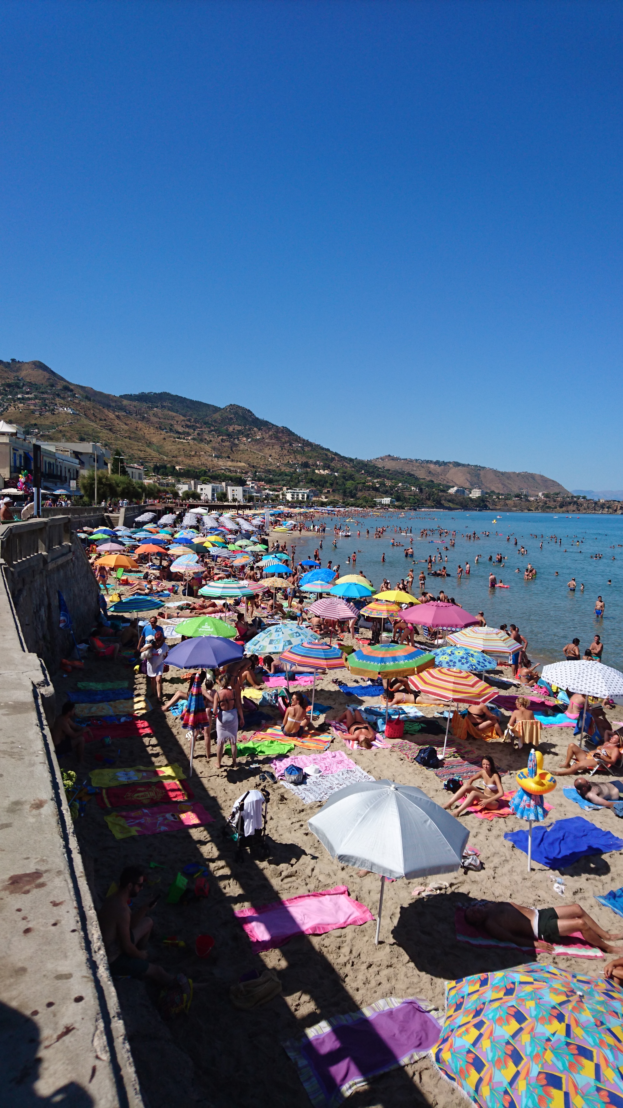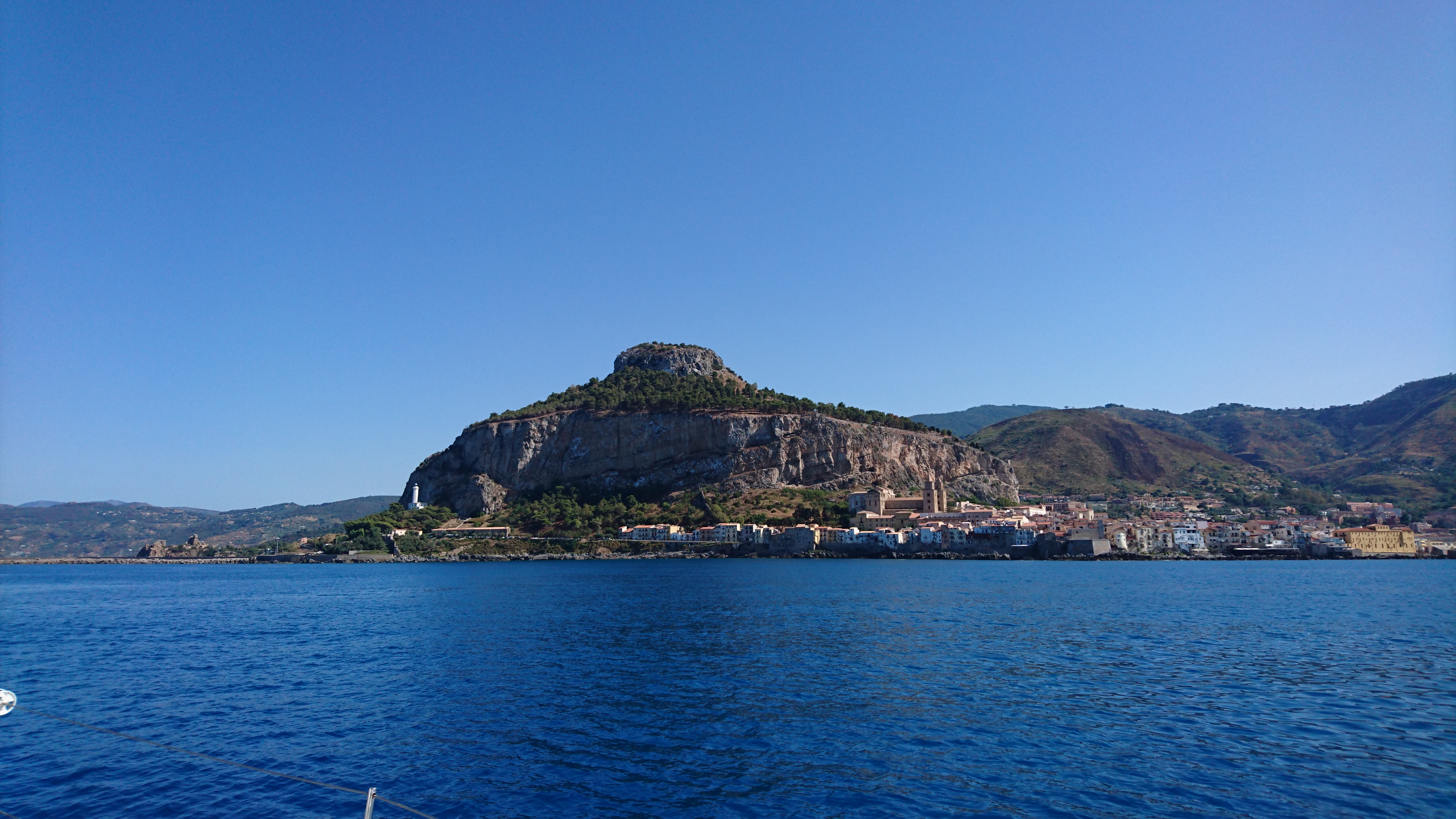 Het is maar 35 mijl naar Cefalu, dus we doen rustig aan, op de motor zonder wind! De haven blijkt een rommelig geheel en koste wel 110 euro per nacht dus we besluiten in het baaitje te ankeren. Prima plek en leuke baai.