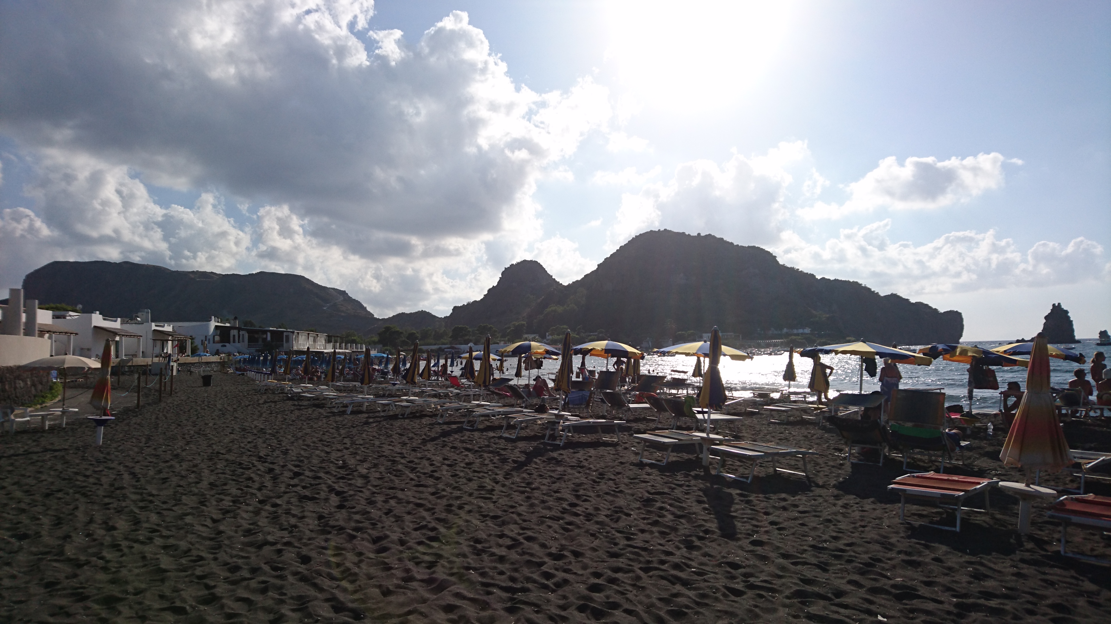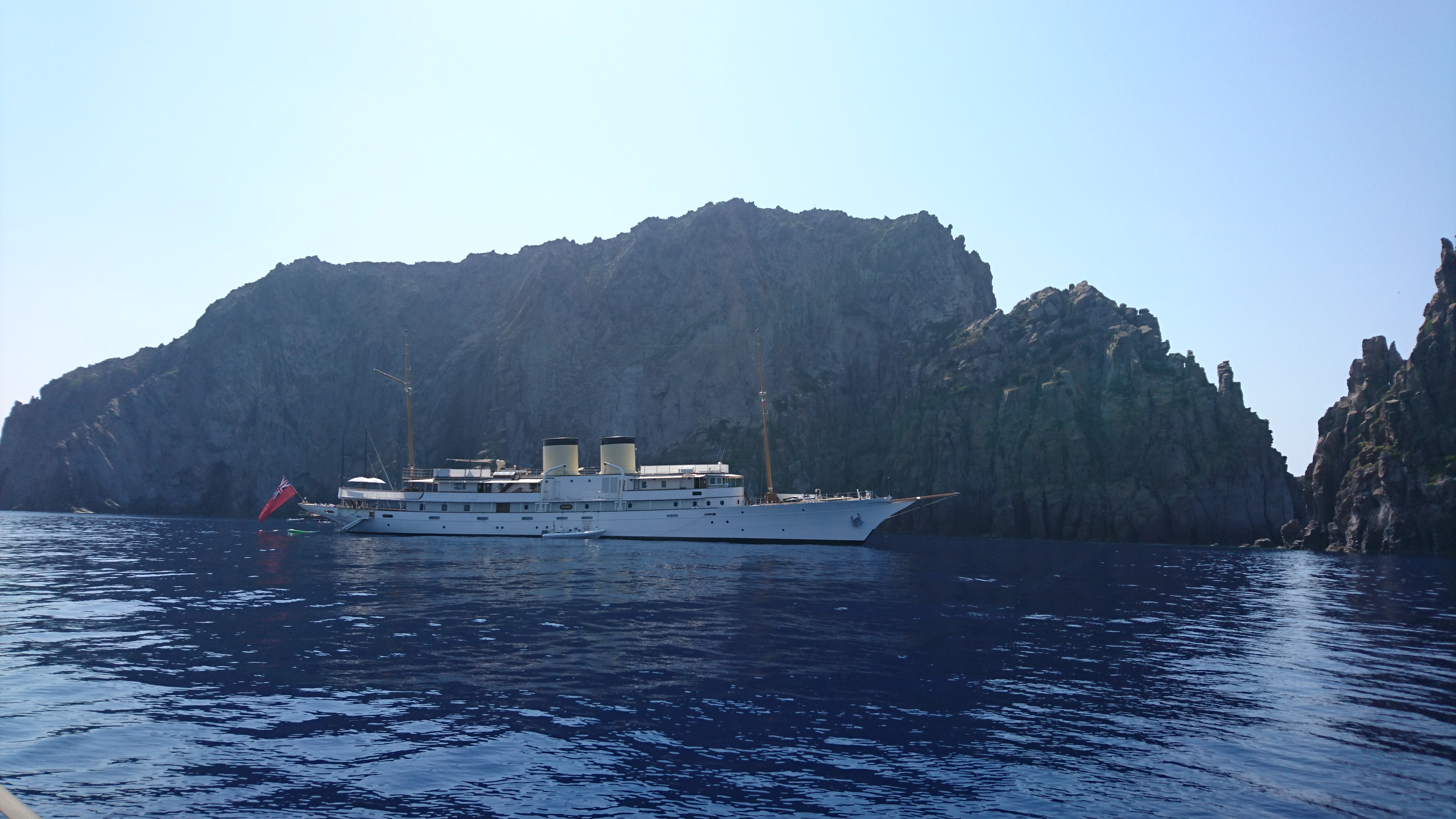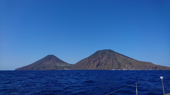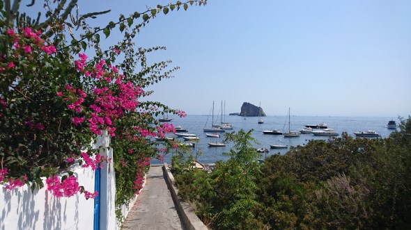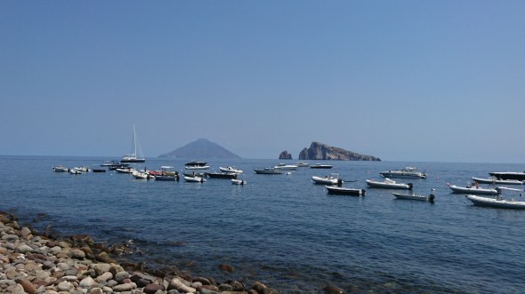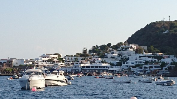 Bij Salina aangekomen blijkt het zo vol dat we besluiten om door te varen naar Panarea, nog 10 mijl verder. Daar is het ook wel vol, maar kun je nog wel een plekje vinden. We besluiten een mooring te pakken (eigenlijk 2, want je wordt allemaal in rijtje gelegd met achter en voor een mooring, zodat je niet tegen elkaar kunt draaien. Dit systeem kennen we nog van Corsica en Vulcano uit 2015 en het werkt prima als je maar beschut ligt). We hebben mooi uitzicht op de Stromboli in de verte, maar zien alleen wat rookpluimpjes en geen vonkenregen.