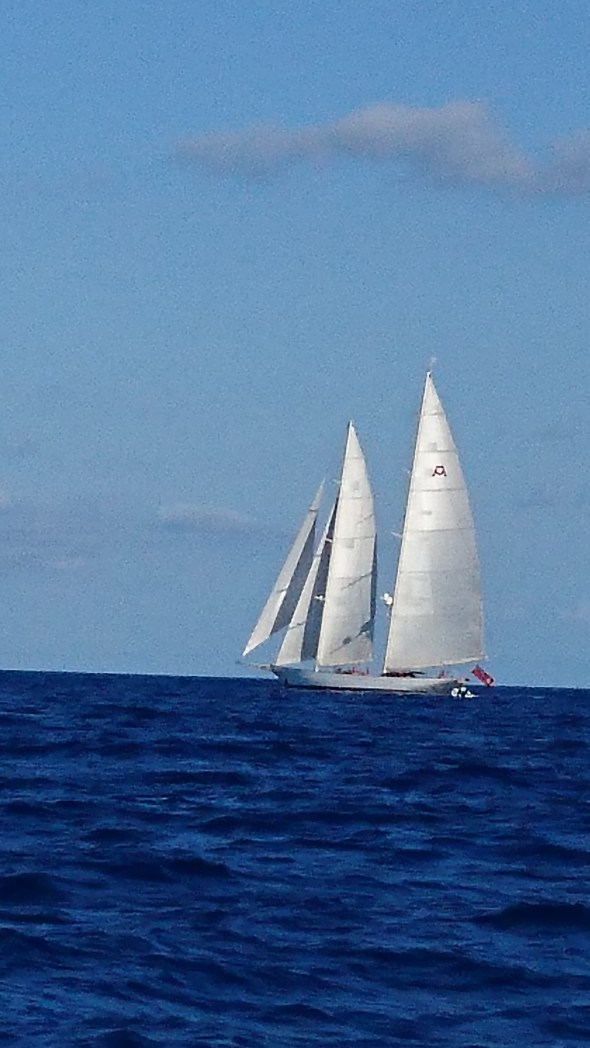 Op 18 augustus laten we ons door de beheerder van de moorings met zijn dinghy naar de wal brengen en we lopen door het mooi opgeknapte witte dorp. Mooie huizen en dure winkels, een soort Mustique met Ibiza door elkaar… Af en toe landen er ook helikopters en we zien dure schepen, o.a. de schoener Adela.