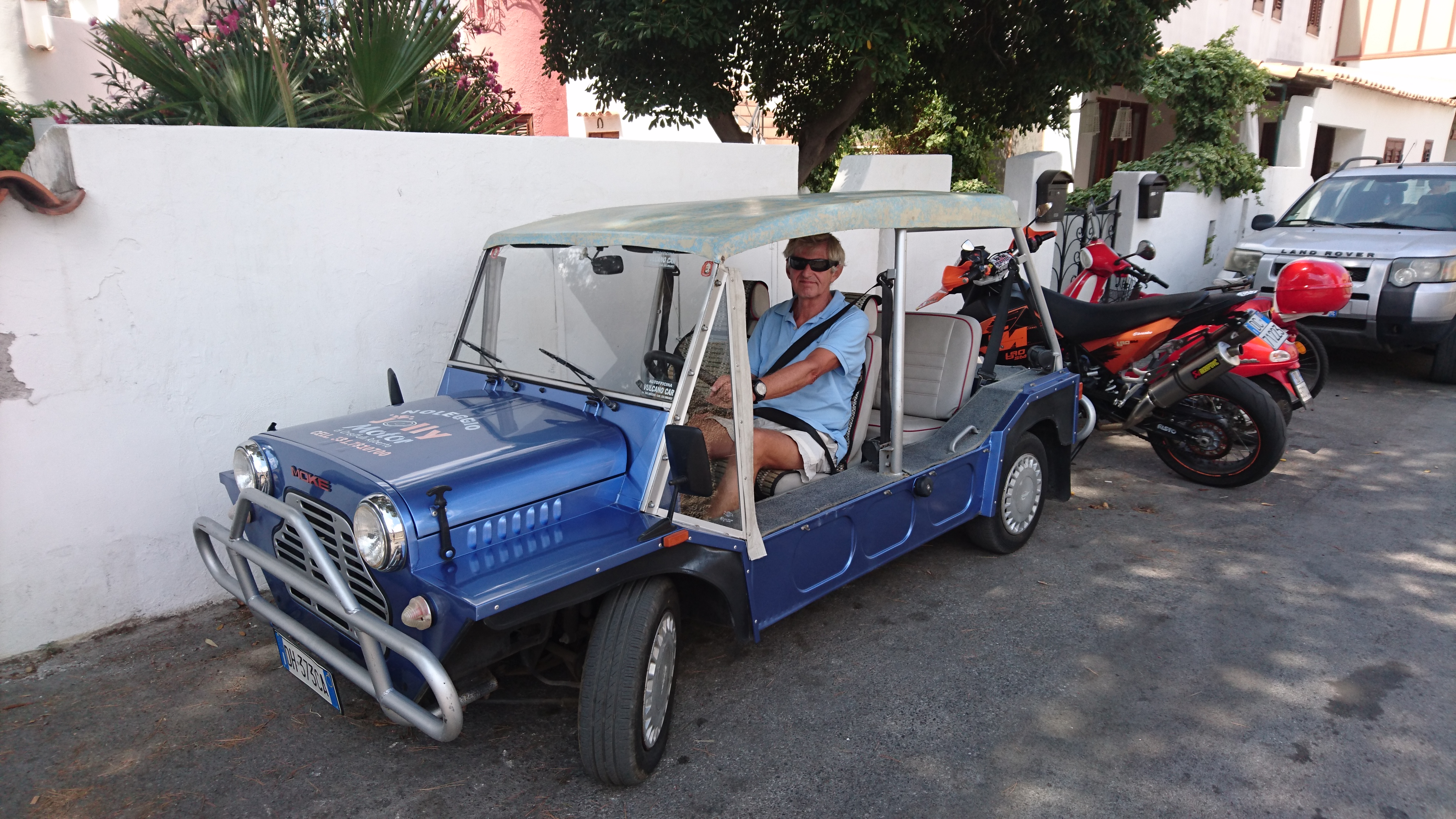 De volgende dag huren we een mini Moke, een soort half-open jeepje op het onderstel van de oer-mini. Met originele 1098cc austin/morris motor erin natuurlijk. Het geluid is onmiskenbaar, tot en met de licht ratelende distributieketting.
