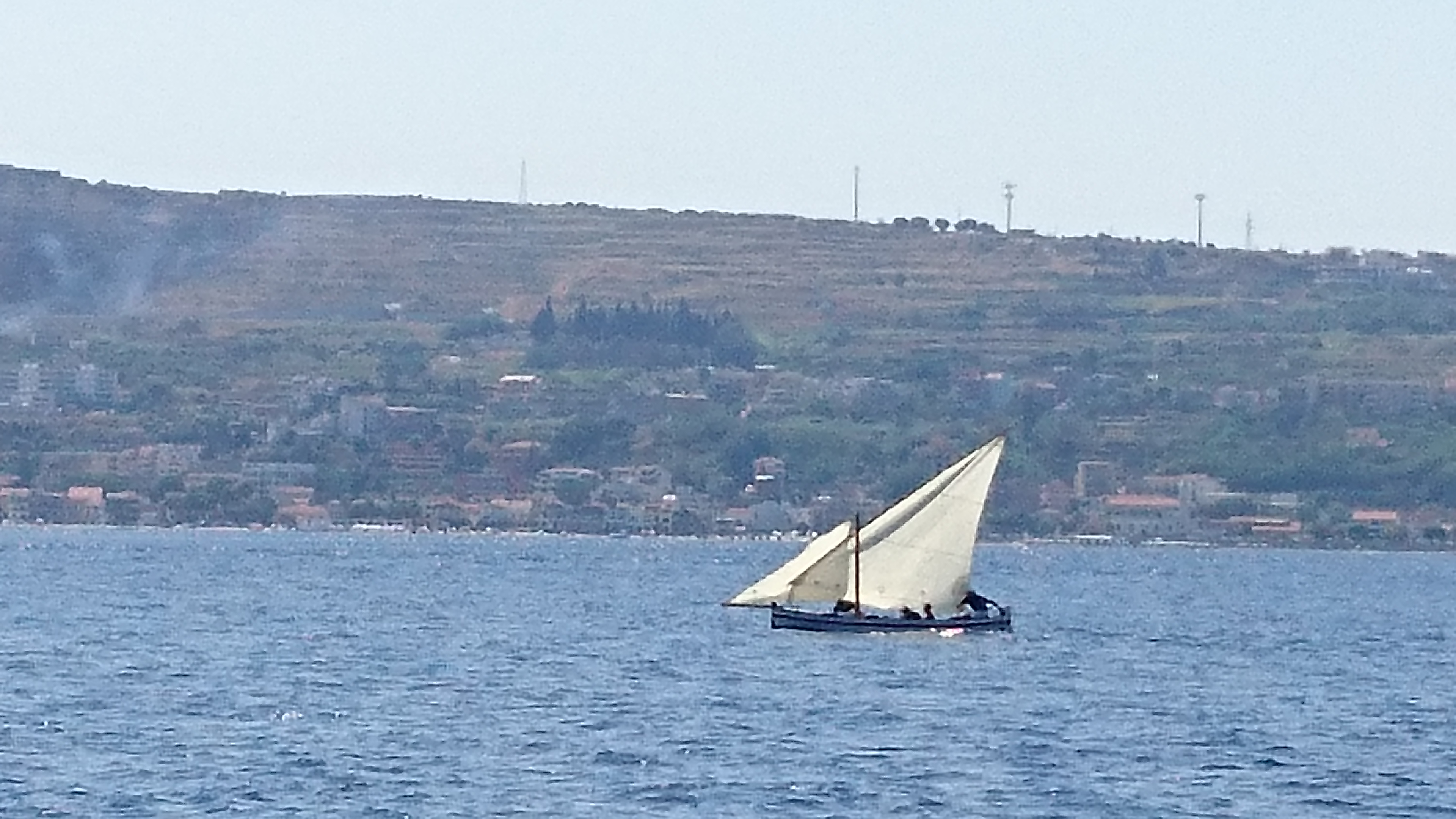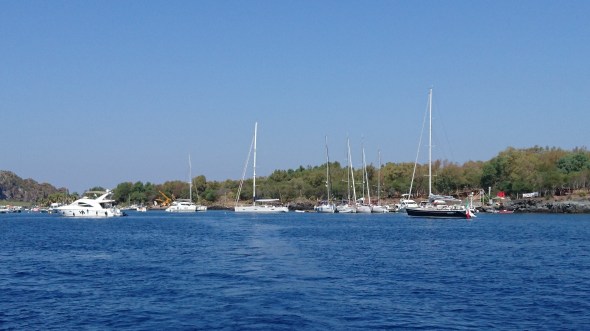 Na Messina kwamen er sterke stroomrafels en kregen we lichte tegenstroom, maar nog altijd goede wind van achteren. Lekker zeilen dus. 5 mijl voor Taormina viel de wind helemaal weg terwijl je achter je de schuimkoppen nog kon zien. Volledig thermische wind dus.