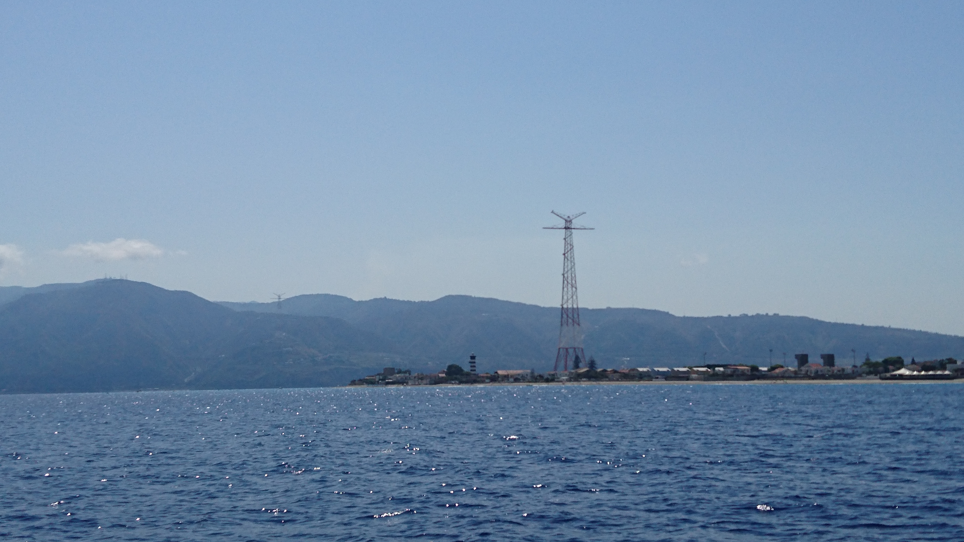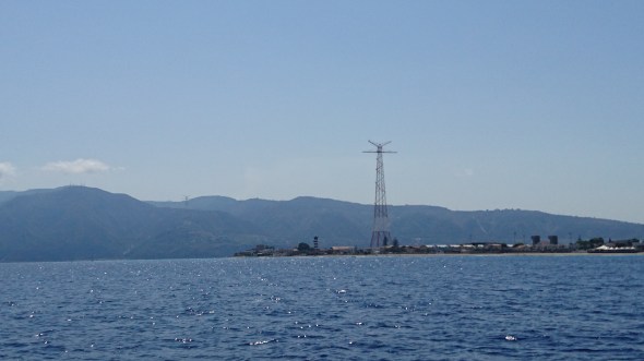 ingang van de straat van Messina. De toren op de voorgrond is Sicilië, achter de toren zie je het vasteland van Italië (Calabria)