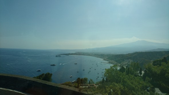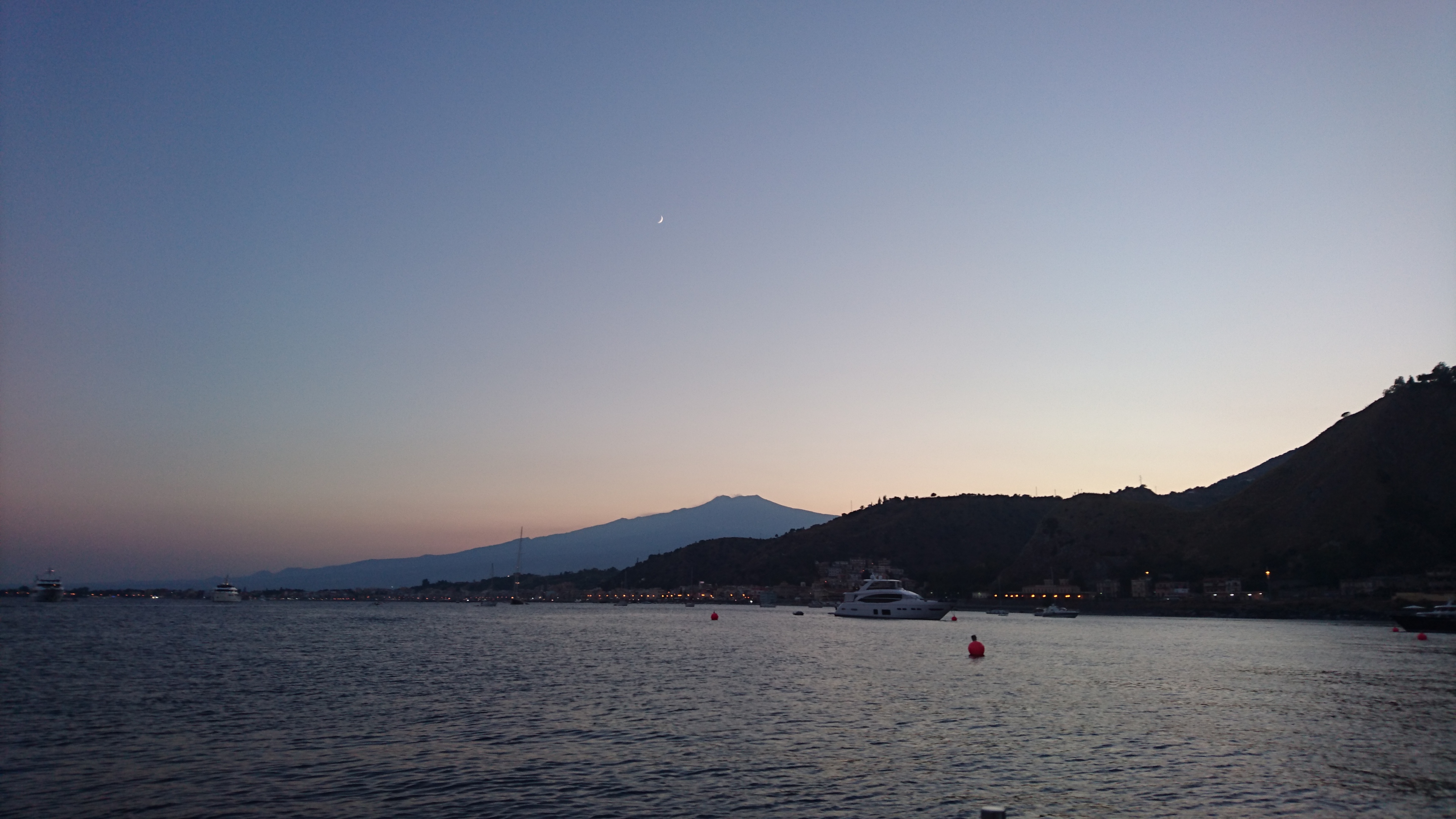 We blijven 3 nachten in de baai van Taormina. De eerste avond direct een prachtig uitzicht op een helemaal zichtbare Etna: