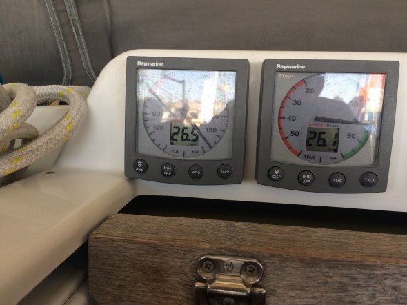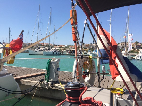 We liggen prima, terwijl de mistral flink doorwaait vandaag. Het is goed dat we hier wat eerder heen zijn gegaan want de komende dagen blijft de wind en de zeegang west of noordwest.