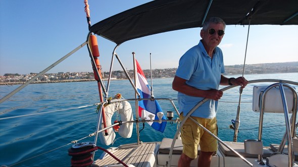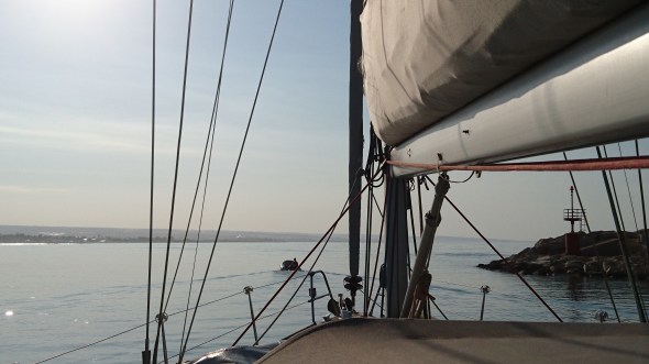 Bij het uitvaren van de haven in Marina di Ragusa worden we begeleid door een marinero in een rubberboot om te helpen de verzandingen in de haveningang te omzeilen. Vlak langs de pier was er toch nog meer dan 3 meter water, dus geen probleem.