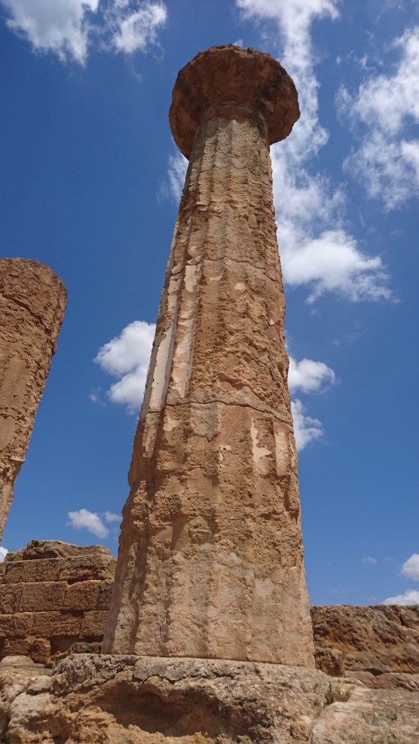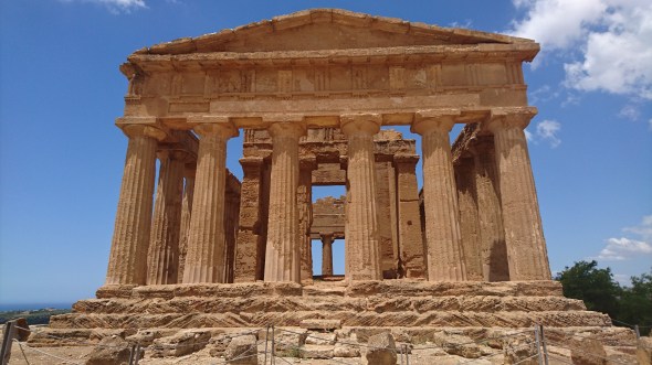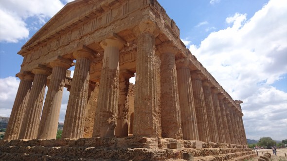 Het waait vandaag weer flink uit NW, precies de richting waar we heen willen. Dus huren we een Fiat Panda en rijden naar de vallei der tempels in Agrigento, waar we uren doorbrengen tussen de tempels van Zeus, Castor en PolluX, Heracles en van Concordia. Die laatste heeft een naam, die voortkomt uit een andere steen die in de buurt is gevondennen waarop het woord Concordia voorkomt. Maar eigenlijk is niet duidelijk aan welke God deze tempel ooit was gewijd.